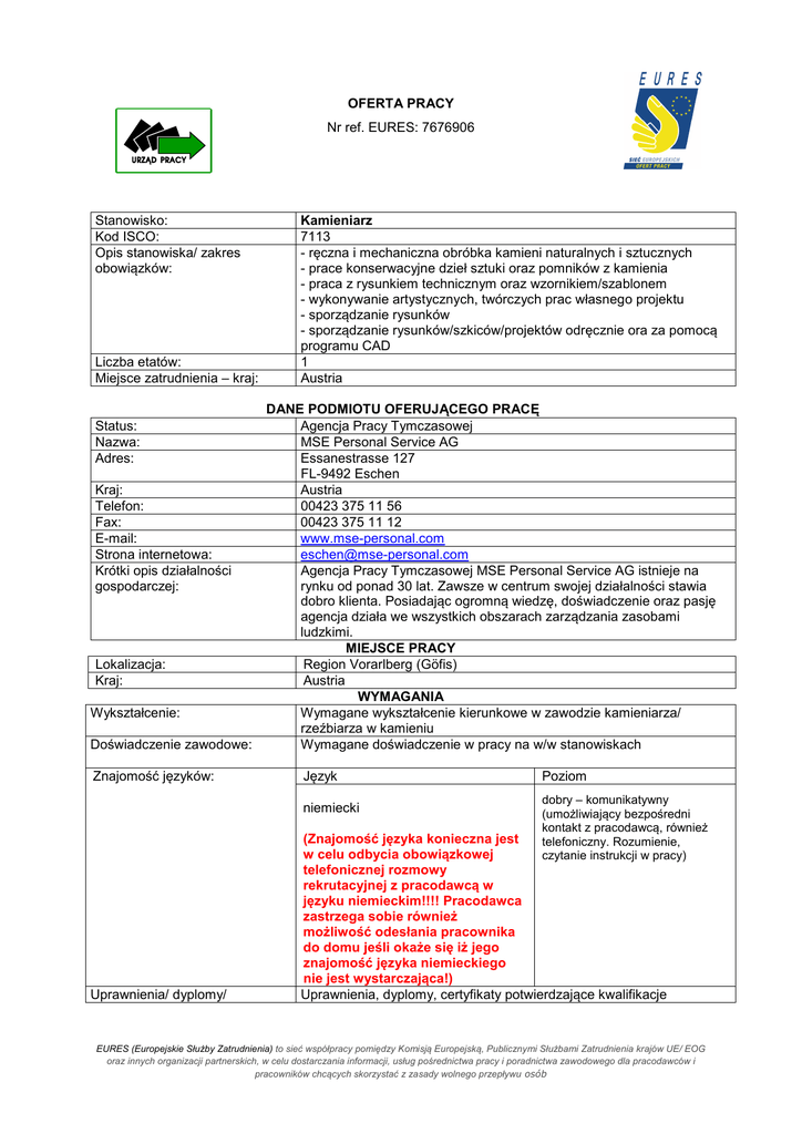 OFERTA PRACY Nr ref. EURES: 7676906 Stanowisko: Kod ISCO: Opis stanowiska/ zakres obowiązków: Liczba etatów: Miejsce zatrudnienia – kraj: Status: Nazwa: Adres: Kraj: Telefon: Fax: E-mail: Strona internetowa: Krótki opis działalności gospodarczej: Lokalizacja: Kraj: Wykształcenie: Doświadczenie zawodowe: Znajomość języków: Kamieniarz 7113 - ręczna i mechaniczna obróbka kamieni naturalnych i sztucznych - prace konserwacyjne dzieł sztuki oraz pomników z kamienia - praca z rysunkiem technicznym oraz wzornikiem/szablonem - wykonywanie artystycznych, twórczych prac własnego projektu - sporządzanie rysunków - sporządzanie rysunków/szkiców/projektów odręcznie ora za pomocą programu CAD 1 Austria DANE PODMIOTU OFERUJĄCEGO PRACĘ Agencja Pracy Tymczasowej MSE Personal Service AG Essanestrasse 127 FL-9492 Eschen Austria 00423 375 11 56 00423 375 11 12 www.mse-personal.com [email protected] Agencja Pracy Tymczasowej MSE Personal Service AG istnieje na rynku od ponad 30 lat. Zawsze w centrum swojej działalności stawia dobro klienta. Posiadając ogromną wiedzę, doświadczenie oraz pasję agencja działa we wszystkich obszarach zarządzania zasobami ludzkimi. MIEJSCE PRACY Region Vorarlberg (Göfis) Austria WYMAGANIA Wymagane wykształcenie kierunkowe w zawodzie kamieniarza/ rzeźbiarza w kamieniu Wymagane doświadczenie w pracy na w/w stanowiskach Język niemiecki Uprawnienia/ dyplomy/ Poziom dobry – komunikatywny (umożliwiający bezpośredni kontakt z pracodawcą, również telefoniczny. Rozumienie, czytanie instrukcji w pracy) (Znajomość języka konieczna jest w celu odbycia obowiązkowej telefonicznej rozmowy rekrutacyjnej z pracodawcą w języku niemieckim!!!! Pracodawca zastrzega sobie również możliwość odesłania pracownika do domu jeśli okaże się iż jego znajomość języka niemieckiego nie jest wystarczająca!) Uprawnienia, dyplomy, certyfikaty potwierdzające kwalifikacje EURES (Europejskie Służby Zatrudnienia) to sieć współpracy pomiędzy Komisją Europejską, Publicznymi Służbami Zatrudnienia krajów UE/ EOG oraz innych organizacji partnerskich, w celu dostarczania informacji, usług pośrednictwa pracy i poradnictwa zawodowego dla pracodawców i pracowników chcących skorzystać z zasady wolnego przepływu osób dokumenty: zawodowe Prawo jazdy kat. B oraz własny samochód będą dodatkowym atutem Inne istotne wymagania: Zdolności manualne/motoryczne oraz fachowa wiedza w zakresie obsługi maszyn CNC Gotowość do pracy w warsztacie, kamieniołomach i na placach budowy Niezależność, dobra kondycja fizyczna WYNAGRODZENIE I WARUNKI ZATRUDNIENIA Wysokość pensji brutto: 2.110,87 Waluta, w jakiej wypłacana jest Euro pensja: Rodzaj stawki wynagrodzenia: Miesięczna Premie: - 25 dni urlopu - dodatkowe pieniądze w czasie urlopu i w czasie świątecznym Dodatkowe świadczenia: - pełne ubezpieczenie (na wypadek bezrobocia, zdrowotne, od następstw nieszczęśliwych wypadków, emerytalne) - zakwaterowanie jest zapewnione ze strony pracodawcy ale opłacane przez pracownika ok. 300 euro – 350 euro - usługi podatkowe (korekty roczne) - pomoc w załatwianiu wszelkich spraw urzędowych - zakup odzieży ochronnej - dla pracowników karta MSE z wieloma rabatami i ulgami podczas organizacji czasu wolnego od pracy - najlepsze kontakty biznesowe poprzez inne organizacje partnerskie Nazwa firmy, z którą zostanie podpisana umowa: MSE Personal Service AG Rodzaj umowy: Umowa o pracę Wymiar czasu pracy: Pełny wymiar czasu pracy Czas trwania umowy: Umowa na czas nieokreślony Liczba godzin tygodniowo: 40 Zmiany i praca w dni wolne: Tak SPOSÓB SKŁADANIA WNIOSKU CV, List motywacyjny, kserokopie świadectw pracy, certyfikatów, dyplomów, Wymagane dokumenty: referencji ( jeśli są) Język, w którym muszą być sporządzone przedkładane dokumenty: Do kogo należy wysłać dokumenty: Gdzie należy wysłać dokumenty: Dane teleadresowe doradcy EURES lub przedstawiciela pracodawcy: Niemiecki Do Dolnośląskiego Wojewódzkiego Urzędu Pracy – do doradcy Eures Pani Anny Uznańskiej Pocztą tradycyjną na adres: Anna Uznańska Dolnośląski Wojewódzki Urząd Pracy Filia we Wrocławiu al. Armii Krajowej 54 50-541 Wrocław Pocztą elektroniczną na adres: [email protected] z dopiskiem: ‘Austria – kamieniarz’ Anna Uznańska Dolnośląski Wojewódzki Urząd Pracy Filia we Wrocławiu al. Armii Krajowej 54 50-541 Wrocław Tel. 71 39 74 310 e-mail: [email protected] DODATKOWE INFORMACJE UWAGA!!! Informujemy, że pracodawca kontaktuje się z wybranymi kandydatami drogą telefoniczną w języku niemieckim. WAŻNOŚĆ Data publikacji: 23.02.2016 r. Termin przedkładania podań o pracę / zakończenia ważności Do odwołania EURES (Europejskie Służby Zatrudnienia) to sieć współpracy pomiędzy Komisją Europejską, Publicznymi Służbami Zatrudnienia krajów UE/ EOG oraz innych organizacji partnerskich, w celu dostarczania informacji, usług pośrednictwa pracy i poradnictwa zawodowego dla pracodawców i pracowników chcących skorzystać z zasady wolnego przepływu osób oferty: UWAGA: 1. Umowa z zagranicznym pracodawcą zostanie zawarta zgodnie z prawem kraju zatrudnienia. Oznacza to, że wszystkie roszczenia odnośnie do warunków, które obejmuje umowa, można kierować wyłącznie do odpowiedniego sądu w kraju zatrudnienia. Publiczne służby zatrudnienia (EURES) nie mogą pośredniczyć ani reprezentować pracownika w sądzie kraju zatrudnienia w przypadku sporu z pracodawcą. 2. Publiczne służby zatrudnienia (EURES) dokładają wszelkich starań, aby zapewnić rzetelność i wiarygodność ofert pracy zgłoszonych w lokalnym urzędzie pracy. Należy wyjaśnić, że oferta pracy została zgłoszona przez stronę trzecią i EURES nie odpowiada za ewentualne rozbieżności między warunkami pracy określonymi w ofercie pracy i warunkami oferowanymi przez potencjalnego pracodawcę. 3. Publiczne służby zatrudnienia (EURES) informują, że b