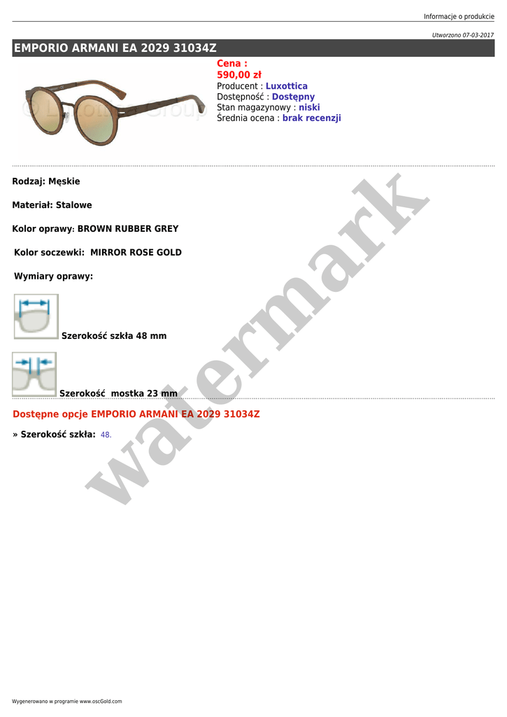 Informacje o produkcie Utworzono 07-03-2017 EMPORIO ARMANI EA 2029 31034Z Cena : 590,00 zł Producent : Luxottica Dostępność : Dostępny Stan magazynowy : niski Średnia ocena : brak recenzji Materiał: Stalowe er m ar k Rodzaj: Męskie Kolor oprawy: BROWN RUBBER GREY Kolor soczewki: MIRROR ROSE GOLD Wymiary oprawy: Szerokość szkła 48 mm Szerokość mostka 23 mm at Dostępne opcje EMPORIO ARMANI EA 2029 31034Z w » Szerokość szkła: 48. Wygenerowano w programie www.oscGold.com