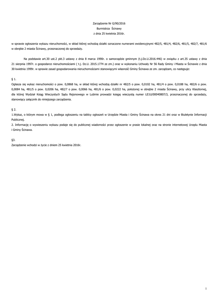 Zarządzenie Nr G/90/2016 Burmistrza Ścinawy z dnia 25 kwietnia 2016r. w sprawie ogłoszenia wykazu nieruchomości, w skład której wchodzą działki oznaczone numerami ewidencyjnymi 482/5, 481/4, 482/6, 481/5, 482/7, 481/6 w obrębie 2 miasta Ścinawy, przeznaczonej do sprzedaży. Na podstawie art.30 ust.2 pkt.3 ustawy z dnia 8 marca 1990r. o samorządzie gminnym (t.j.Dz.U.2016.446) w związku z art.35 ustawy z dnia 21 sierpnia 1997r. o gospodarce nieruchomościami ( t.j. Dz.U. 2015.1774 ze zm.) oraz w wykonaniu Uchwały Nr 56 Rady Gminy i Miasta w Ścinawie z dnia 30 kwietnia 1999r. w sprawie zasad gospodarowania nieruchomościami stanowiącymi własność Gminy Ścinawa ze zm. zarządzam, co następuje: § 1. Ogłasza się wykaz nieruchomości o pow. 0,0868 ha, w skład której wchodzą działki nr 482/5 o pow. 0,0102 ha, 481/4 o pow. 0,0188 ha, 482/6 o pow. 0,0084 ha, 481/5 o pow. 0,0206 ha, 482/7 o pow. 0,0066 ha, 481/6 o pow. 0,0222 ha, położonej w obrębie 2 miasta Ścinawy, przy ulicy Klasztornej, dla której Wydział Ksiąg Wieczystych Sądu Rejonowego w Lubinie prowadzi księgę wieczystą numer LE1U/00040807/3, przeznaczonej do sprzedaży, stanowiący załącznik do niniejszego zarządzenia. § 2. 1.Wykaz, o którym mowa w § 1, podlega ogłoszeniu na tablicy ogłoszeń w Urzędzie Miasta i Gminy Ścinawa na okres 21 dni oraz w Biuletynie Informacji Publicznej. 2. Informację o wywieszeniu wykazu podaje się do publicznej wiadomości przez ogłoszenie w prasie lokalnej oraz na stronie internetowej Urzędu Miasta i Gminy Ścinawa. §3. Zarządzenie wchodzi w życie z dniem 25 kwietnia 2016r. 1 Załącznik do Zarządzenia Nr G/90/2016 Burmistrza Ścinawy z dnia 25 kwietnia 2016r. w sprawie ogłoszenia wykazu nieruchomości, w skład której wchodzą działki oznaczone numerami ewidencyjnymi 482/5, 481/4, 482/6, 481/5, 482/7, 481/6 w obrębie 2 miasta Ścinawy, przeznaczonej do sprzedaży. Wykaz nieruchomości o pow. 0,0868 ha, w skład której wchodzą działki nr 482/5 o pow. 0,0102 ha, 481/4 o pow. 0,0188 ha, 482/6 o pow. 0,0084 ha, 481/5 o pow. 0,0206 ha, 482/7 o pow. 0,0066 ha, 481/6 o pow. 0,0222 ha, położonej w obrębie 2 miasta Ścinawy, przy ulicy Klasztornej, przeznaczonej do sprzedaży, opisanej niżej: Lp . Oznaczenie nieruchomości Pow. w ha Opis nieruchomości Przeznaczenie nieruchomości w planie miejscowym zagospodarowania przestrzennego i sposób jej zagospodarowania Cena nieruchom ości w zł 1. LE1U/0 482/5 00408 07/3 0,0102 ha w tym : RIVb0,0102 ha LE1U/0 481/4 00408 07/3 0,0188 ha W tym: RIVb0,0188 ha 3. LE1U/0 482/6 00408 07/3 0,0084 ha w tym: RIVb0,0084 ha 4. LE1U/0 481/5 00408 07/3 0,0206 ha W tym: RIVb0, 0206 ha 5. LE1U/0 482/7 00408 07/3 0,0066 ha W tym: RIVb0,0066 ha 6. LE1U/0 481/6 00408 07/3 0,0222ha W tym: RIVb0,0222 ha Zgodnie z miejscowym planem zagospodarowania przestrzennego uchwalonym Uchwałą Nr XLIII/273/2005 Rady Miejskiej w Ścinawie z dnia 30 czerwca 2005 roku w sprawie miejscowego planu zagospodarowania przestrzennego dla miasta Ścinawa (Dziennik Urzędowy Województwa Dolnośląskiego Nr 156 poz.3023 z dnia 18.08.2005r.), Uchwałą Nr LXXXI/404/2010 Rady Miejskiej w Ścinawie z dnia 25 marca 2010 r. w sprawie zmiany miejscowego planu zagospodarowania przestrzennego dla miasta Ścinawa ( Dziennik Urzędowy Województwa Dolnośląskiego Nr 72 poz. 1124 z dnia 19.04.2010 r.): Działka nr 481/4 obręb 2, miasta Ścinawy zlokalizowana jest w granicach opracowania miejscowego planu zagospodarowania przestrzennego, oznaczona na rysunku planu (załącznik nr 1 do uchwały) symbolem MN/75- tereny zabudowy mieszkaniowej jednorodzinnej. Położona jest w strefie K - ochrony krajobrazu. Przez działkę przechodzą linie sieci elektroenergetycznych ze strefą ochronną. Działka nr 481/5 obręb 2, miasta Ścinawy zlokalizowana jest w granicach opracowania miejscowego planu zagospodarowania przestrzennego, oznaczona na rysunku planu (załącznik nr 1 do uchwały) symbolem MN/75- tereny zabudowy mieszkaniowej jednorodzinnej. Położona jest w strefie K - ochrony krajobrazu. Przez działkę przechodzą linie sieci elektroenergetycznych ze strefą ochronną. Działka nr 481/6 obręb 2, miasta Ścinawy zlokalizowana jest w granicach opracowania miejscowego planu zagospodarowania przestrzennego, oznaczona na rysunku planu (załącznik nr 1 do uchwały) symbolem MN/75- tereny zabudowy mieszkaniowej jednorodzinnej. Położona jest w strefie K - ochrony krajobrazu. Przez działkę przechodzą linie sieci elektroenergetycznych ze strefą ochronną. Działka nr 482/5 obręb 2, miasta Ścinawy zlokalizowana jest w granicach opracowania miejscowego planu zagospodarowania przestrzennego, oznaczona na rysunku planu (załącznik nr 1 do uchwały) symbolem MN/75- tereny zabudowy mieszkaniowej jednorodzinnej. Położona jest w strefie K - ochrony krajobrazu. Na działce została wyznaczona obowiązująca linia zabudowy od KDL. Działka nr 482/6 obręb 2, miasta Ścinawy zlokalizowana jest w granicach opracowania miejscowego planu zagospodarowania przestrzennego, oznaczona na rysunku planu (załącznik nr 1 do uchwały) symbolem MN/75- tereny zabudowy mieszkaniowej jednorodzinnej. Położona jest w strefie K - ochrony krajobrazu. Na działce została wyznaczona obowiązująca linia zabudowy od KDL. Działka nr 482/7 obręb 2, miasta Ścinawy zlokalizowana jest w granicach opracowania miejscowego planu zagospodarowania przestrzennego, oznaczona na rysunku planu (załącznik nr 1 do uchwały) symbolem MN/75tereny zabudowy mieszkaniowej jednorodzinnej. Położona jest w strefie K ochrony krajobrazu. Na działce została wyznaczona obowiązująca linia zabudowy od KDL. 50 000 2. Nieruchomość niezabudowana o łącznej pow. 0,0868 ha w obrębie 2 miasta Ścinawy przy ulicy Klasztornej W obszarze nieruchomości przechodzą linie sieci elektroenergetycznyc h SN ze strefą ochronną. KW Ewidenc ja gruntów Zgodnie z ustaleniami planu - Uchwała Nr XLIII/273/2005: §5 P