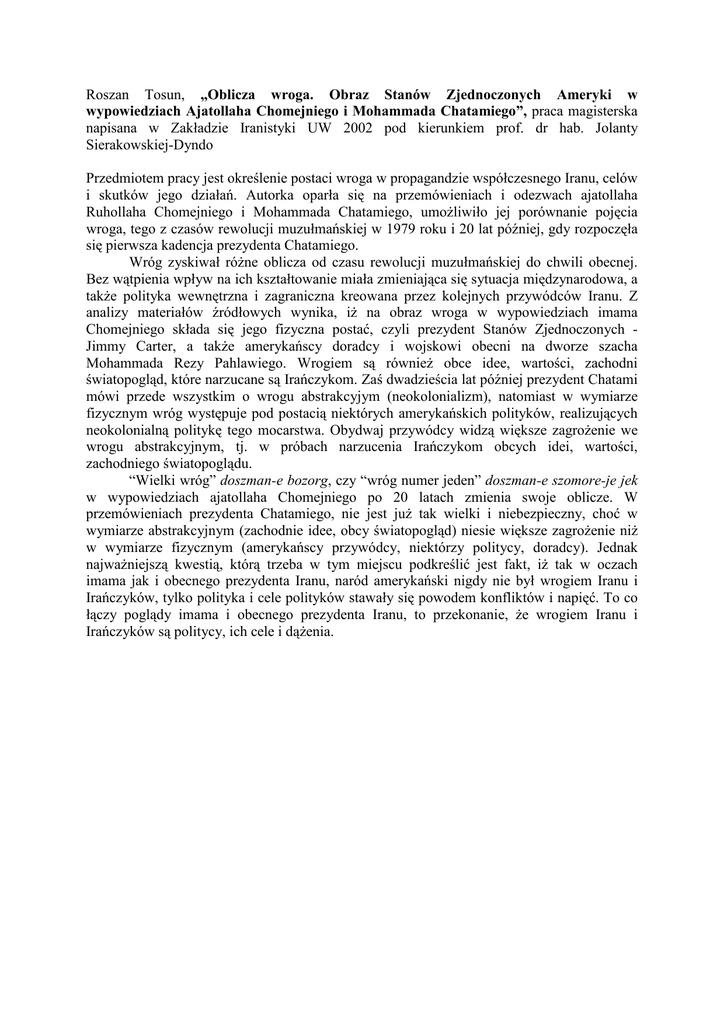 Roszan Tosun, „Oblicza wroga. Obraz Stanów Zjednoczonych Ameryki w wypowiedziach Ajatollaha Chomejniego i Mohammada Chatamiego”, praca magisterska napisana w Zakładzie Iranistyki UW 2002 pod kierunkiem prof. dr hab. Jolanty Sierakowskiej-Dyndo Przedmiotem pracy jest określenie postaci wroga w propagandzie współczesnego Iranu, celów i skutków jego działań. Autorka oparła się na przemówieniach i odezwach ajatollaha Ruhollaha Chomejniego i Mohammada Chatamiego, umoŜliwiło jej porównanie pojęcia wroga, tego z czasów rewolucji muzułmańskiej w 1979 roku i 20 lat później, gdy rozpoczęła się pierwsza kadencja prezydenta Chatamiego. Wróg zyskiwał róŜne oblicza od czasu rewolucji muzułmańskiej do chwili obecnej. Bez wątpienia wpływ na ich kształtowanie miała zmieniająca się sytuacja międzynarodowa, a takŜe polityka wewnętrzna i zagraniczna kreowana przez kolejnych przywódców Iranu. Z analizy materiałów źródłowych wynika, iŜ na obraz wroga w wypowiedziach imama Chomejniego składa się jego fizyczna postać, czyli prezydent Stanów Zjednoczonych Jimmy Carter, a takŜe amerykańscy doradcy i wojskowi obecni na dworze szacha Mohammada Rezy Pahlawiego. Wrogiem są równieŜ obce idee, wartości, zachodni światopogląd, które narzucane są Irańczykom. Zaś dwadzieścia lat później prezydent Chatami mówi przede wszystkim o wrogu abstrakcyjym (neokolonializm), natomiast w wymiarze fizycznym wróg występuje pod postacią niektórych amerykańskich polityków, realizujących neokolonialną politykę tego mocarstwa. Obydwaj przywódcy widzą większe zagroŜenie we wrogu abstrakcyjnym, tj. w próbach narzucenia Irańczykom obcych idei, wartości, zachodniego światopoglądu. “Wielki wróg” doszman-e bozorg, czy “wróg numer jeden” doszman-e szomore-je jek w wypowiedziach ajatollaha Chomejniego po 20 latach zmienia swoje oblicze. W przemówieniach prezydenta Chatamiego, nie jest juŜ tak wielki i niebezpieczny, choć w wymiarze abstrakcyjnym (zachodnie idee, obcy światopogląd) niesie większe zagroŜenie niŜ w wymiarze fizycznym (amerykańscy przywódcy, niektórzy politycy, doradcy). Jednak najwaŜniejszą kwestią, którą trzeba w tym miejscu podkreślić jest fakt, iŜ tak w oczach imama jak i obecnego prezydenta Iranu, naród amerykański nigdy nie był wrogiem Iranu i Irańczyków, tylko polityka i cele polityków stawały się powodem konfliktów i napięć. To co łączy poglądy imama i obecnego prezydenta Iranu, to przekonanie, Ŝe wrogiem Iranu i Irańczyków są politycy, ich cele i dąŜenia.
