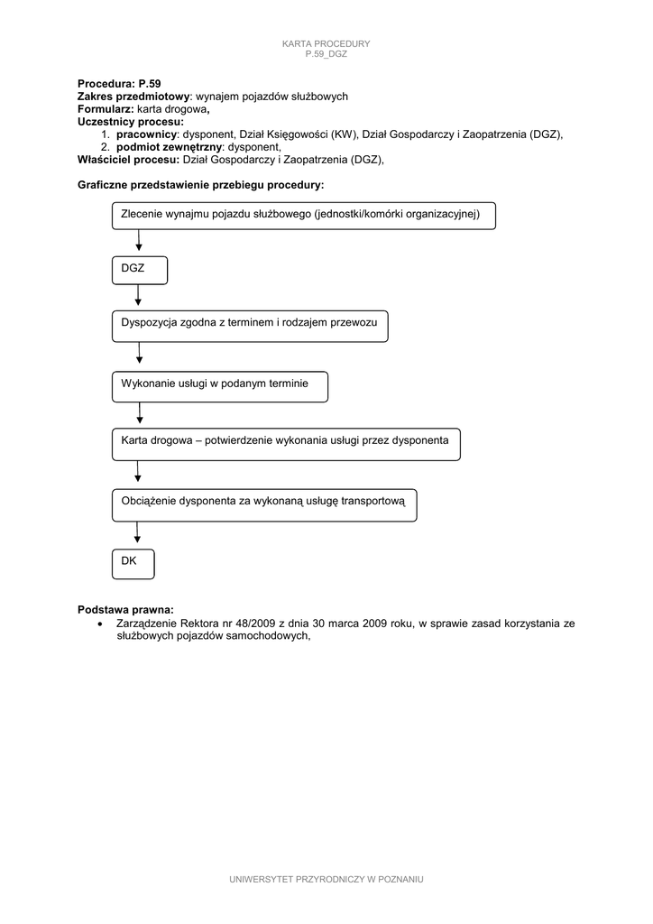 KARTA PROCEDURY P.59_DGZ Procedura: P.59 Zakres przedmiotowy: wynajem pojazdów słuŜbowych Formularz: karta drogowa, Uczestnicy procesu: 1. pracownicy: dysponent, Dział Księgowości (KW), Dział Gospodarczy i Zaopatrzenia (DGZ), 2. podmiot zewnętrzny: dysponent, Właściciel procesu: Dział Gospodarczy i Zaopatrzenia (DGZ), Graficzne przedstawienie przebiegu procedury: Zlecenie wynajmu pojazdu słuŜbowego (jednostki/komórki organizacyjnej) DGZ Dyspozycja zgodna z terminem i rodzajem przewozu Wykonanie usługi w podanym terminie Karta drogowa – potwierdzenie wykonania usługi przez dysponenta ObciąŜenie dysponenta za wykonaną usługę transportową DK Podstawa prawna: • Zarządzenie Rektora nr 48/2009 z dnia 30 marca 2009 roku, w sprawie zasad korzystania ze słuŜbowych pojazdów samochodowych, UNIWERSYTET PRZYRODNICZY W POZNANIU