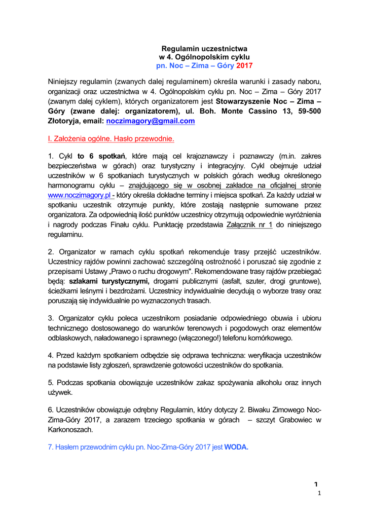 Regulamin uczestnictwa w 4. Ogólnopolskim cyklu pn. Noc – Zima – Góry 2017 Niniejszy regulamin (zwanych dalej regulaminem) określa warunki i zasady naboru, organizacji oraz uczestnictwa w 4. Ogólnopolskim cyklu pn. Noc – Zima – Góry 2017 (zwanym dalej cyklem), których organizatorem jest Stowarzyszenie Noc – Zima – Góry (zwane dalej: organizatorem), ul. Boh. Monte Cassino 13, 59-500 Złotoryja, email: [email protected] I. Założenia ogólne. Hasło przewodnie. 1. Cykl to 6 spotkań, które mają cel krajoznawczy i poznawczy (m.in. zakres bezpieczeństwa w górach) oraz turystyczny i integracyjny. Cykl obejmuje udział uczestników w 6 spotkaniach turystycznych w polskich górach według określonego harmonogramu cyklu – znajdującego się w osobnej zakładce na oficjalnej stronie www.noczimagory.pl - który określa dokładne terminy i miejsca spotkań. Za każdy udział w spotkaniu uczestnik otrzymuje punkty, które zostają następnie sumowane przez organizatora. Za odpowiednią ilość punktów uczestnicy otrzymują odpowiednie wyróżnienia i nagrody podczas Finału cyklu. Punktację przedstawia Załącznik nr 1 do niniejszego regulaminu. 2. Organizator w ramach cyklu spotkań rekomenduje trasy przejść uczestników. Uczestnicy rajdów powinni zachować szczególną ostrożność i poruszać się zgodnie z przepisami Ustawy „Prawo o ruchu drogowym". Rekomendowane trasy rajdów przebiegać będą: szlakami turystycznymi, drogami publicznymi (asfalt, szuter, drogi gruntowe), ścieżkami leśnymi i bezdrożami. Uczestnicy indywidualnie decydują o wyborze trasy oraz poruszają się indywidualnie po wyznaczonych trasach. 3. Organizator cyklu poleca uczestnikom posiadanie odpowiedniego obuwia i ubioru technicznego dostosowanego do warunków terenowych i pogodowych oraz elementów odblaskowych, naładowanego i sprawnego (włączonego!) telefonu komórkowego. 4. Przed każdym spotkaniem odbędzie się odprawa techniczna: weryfikacja uczestników na podstawie listy zgłoszeń, sprawdzenie gotowości uczestników do spotkania. 5. Podczas spotkania obowiązuje uczestników zakaz spożywania alkoholu oraz innych używek. 6. Uczestników obowiązuje odrębny Regulamin, który dotyczy 2. Biwaku Zimowego NocZima-Góry 2017, a zarazem trzeciego spotkania w górach – szczyt Grabowiec w Karkonoszach. 7. Hasłem przewodnim cyklu pn. Noc-Zima-Góry 2017 jest WODA. 1 1 II. Zasady naboru i uczestnictwa, opłata za udział. 1. Osoby biorące udział w spotkaniach w ramach niniejszego cyklu oświadczają, że nie mają przeciwwskazań zdrowotnych do wykonywania ćwiczeń fizycznych i uczestniczą w spotkaniach na własną odpowiedzialność. Wszyscy uczestnicy cyklu wyrażają zgodę na filmowanie i fotografowanie ich w celach promocyjnych cyklu oraz przetwarzanie ich danych osobowych wraz z publikacją na oficjalnej stronie organizatora oraz w mediach. 2. W przypadku złego samopoczucia, urazów, kontuzji, wszelkich problemów zdrowotnych – należy poinformować o tym osoby prowadzące spotkanie. 3. Nabór uczestników odbywa się poprzez (poszczególne kroki): a) wypełnienie FORMULARZA ZGŁOSZENIA UCZESTNIKA (Załącznik nr 2) do niniejszego Regulaminu b) wysłanie niniejszego załącznika do Organizatora na email: [email protected] (*ilość miejsc ograniczona do 100 uczestników podczas każdego, jednego spotkania; decyduje kolejność zgłoszeń i opłat) c) opłata za uczestnictwo w spotkaniu w wysokości: 10 zł / udział 1 osoby w 1 spotkaniu. Uwaga! Wyjątek stanowi spotkanie nr 3 – Grabowiec w Karkonoszach – gdzie udział w jest równoznaczny i połączony z udziałem w 2. Biwaku Zimowym Noc – Zima – Góry 2017 – wysokość wpisowego to 200 zł (miejsce w chacie) lub 100 zł (miejsce na polu namiotowym). Specyfikację udziału w **2. Biwaku Zimowym Noc – Zima – Góry 2017 określa odrębny Regulamin udziału w 2. Biwaku Zimowym Noc – Zima – Góry 2017. d) wysłanie potwierdzenia opłaty za udział na email: [email protected] Po tym procesie Organizator umieszcza Uczestnika na LIŚCIE UCZESTNIKÓW w odpowiedniej zakładce na stronie www.noczimagory.pl Jest to równoznaczne z potwierdzeniem otrzymania zgłoszenia i wyrażeniem przez Uczestnika zgody na publikację jego danych osobowych na oficjalnej stronie cyklu oraz otrzymania przez Organizatora opłaty od Uczestnika. Zgłoszenie nie zawiera rezerwacji i kosztów noclegów, wyżywienia oraz dojazdu Uczestnika. 2 OPŁATA ZA UDZIAŁ ZAWIERA: e) koordynacja cyklu spotkań przez Organizatora f) wyznaczenie rekomendowanych tras i miejsc noclegowych g) odznaki/chusty/niespodzianki/certyfikaty podczas Finału cyklu dla uczestników wg prowadzonej punktacji; wyniki na oficjalnej stronie Organizatora h) udział w poszczególnych prelekcjach i wydarzeniach wg harmonogramu w ramach cyklu (każdorazowo po dotarciu Uczestników do rekomendowanego miejsca noclegowego przewidziane jest spotkanie z uczestnikami wraz z rekomendacją przez organizatora atrakcji dodatkowych w dzień następny…) i) identyfikator uczestnictwa w cyklu w formie karty plastikowej na smyczy promocyjnej (jeden identyfikator dla jednego Uczestnika na cały cykl), Uczestnicy powinni posiadać identyfikatory podczas spotkań. Uwaga! Uczestnik każdorazowo pokrywa sam/indywidualnie koszty: dojazdu, wyżywienia, noclegów podczas rajdu, ubezpieczenia NNW oraz wszelkich dodatkowych atrakcji podczas poszczególnych rajdów (m.in. wstęp na baseny termalne, zakup wody zdrojowej w pijalni itp.). Opłatę za udział w cyklu spotkań należy dokonać na konto: Stowarzyszenie Noc-Zima-Góry, ul. Boh. Monte Cassino 13, 59-500 Złotoryja Konto bankowe: BZ WBK 40 1090 2095 0000 0001 3199 2550 / w tytule wpisując: Noc-Zima-Góry 2017 oraz imię i nazwisko Uczestnika. / III. Indywidualna rezerwacja rekomendowanych noclegów przez Uczestników 1. *NOCLEG KAŻDY UCZESTNIK REZERWUJE INDYWIDUALNIE I NA WŁASNY KOSZT. Z uwagi na sezon zimowy w górach tylko do 