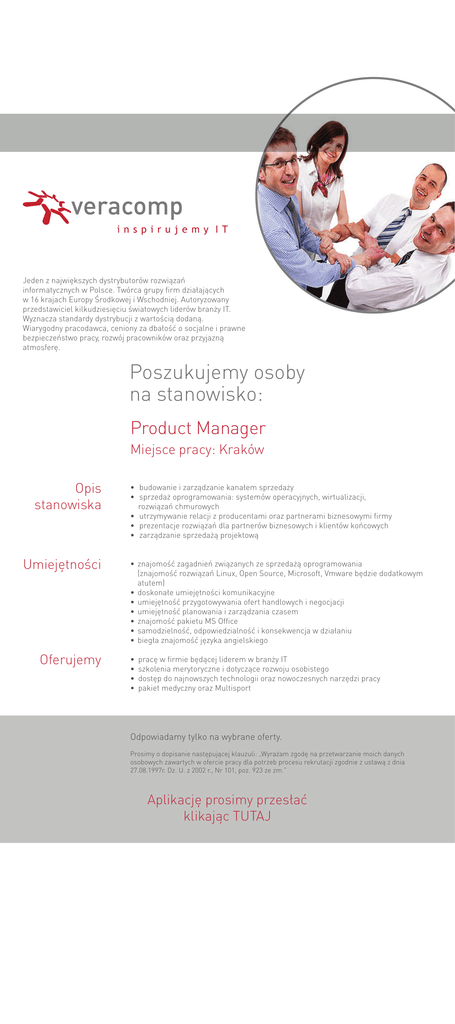 Jeden z największych dystrybutorów rozwiązań informatycznych w Polsce. Twórca grupy firm działających w 16 krajach Europy Środkowej i Wschodniej. Autoryzowany przedstawiciel kilkudziesięciu światowych liderów branży IT. Wyznacza standardy dystrybucji z wartością dodaną. Wiarygodny pracodawca, ceniony za dbałość o socjalne i prawne bezpieczeństwo pracy, rozwój pracowników oraz przyjazną atmosferę. Poszukujemy osoby na stanowisko: Product Manager Miejsce pracy: Kraków Opis stanowiska Umiejętności Oferujemy • budowanie i zarządzanie kanałem sprzedaży • sprzedaż oprogramowania: systemów operacyjnych, wirtualizacji, rozwiązań chmurowych • utrzymywanie relacji z producentami oraz partnerami biznesowymi firmy • prezentacje rozwiązań dla partnerów biznesowych i klientów końcowych • zarządzanie sprzedażą projektową • znajomość zagadnień związanych ze sprzedażą oprogramowania (znajomość rozwiązań Linux, Open Source, Microsoft, Vmware będzie dodatkowym atutem) • doskonałe umiejętności komunikacyjne • umiejętność przygotowywania ofert handlowych i negocjacji • umiejętność planowania i zarządzania czasem • znajomość pakietu MS Office • samodzielność, odpowiedzialność i konsekwencja w działaniu • biegła znajomość języka angielskiego • • • • pracę w firmie będącej liderem w branży IT szkolenia merytoryczne i dotyczące rozwoju osobistego dostęp do najnowszych technologii oraz nowoczesnych narzędzi pracy pakiet medyczny oraz Multisport Odpowiadamy tylko na wybrane oferty. Prosimy o dopisanie następującej klauzuli: „Wyrażam zgodę na przetwarzanie moich danych osobowych zawartych w ofercie pracy dla potrzeb procesu rekrutacji zgodnie z ustawą z dnia 27.08.1997r. Dz. U. z 2002 r., Nr 101, poz. 923 ze zm.” Aplikację prosimy przesłać klikając TUTAJ