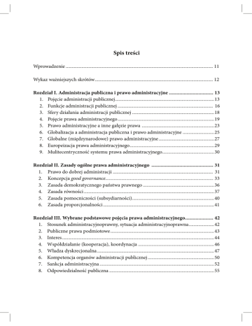 Spis treści Wprowadzenie .......................................................................................................................... 11 Wykaz ważniejszych skrótów.................................................................................................. 12 Rozdział I. Administracja publiczna i prawo administracyjne ................................. 13 1. Pojęcie administracji publicznej ..................................................................................13 2. Funkcje administracji publicznej ............................................................................... 16 3. Sfery działania administracji publicznej ....................................................................18 4. Pojęcie prawa administracyjnego ................................................................................19 5. Prawo administracyjne a inne gałęzie prawa ............................................................23 6. Globalizacja a administracja publiczna i prawo administracyjne ..........................25 7. Globalne (międzynarodowe) prawo administracyjne ..............................................27 8. Europeizacja prawa administracyjnego ......................................................................29 9. Mulitecentryczność systemu prawa administracyjnego...........................................30 Rozdział II. Zasady ogólne prawa administracyjnego .............................................. 31 1. Prawo do dobrej administracji ................................................................................... 31 2. Koncepcja good governance....................................................................................... 33 3. Zasada demokratycznego państwa prawnego ...........................................................36 4. Zasada równości ............................................................................................................37 5. Zasada pomocniczości (subsydiarności)....................................................................40 6. Zasada proporcjonalności ............................................................................................41 Rozdział III. Wybrane podstawowe pojęcia prawa administracyjnego..................... 42 1. Stosunek administracyjnoprawny, sytuacja administracyjnoprawna .....................42 2. Publiczne prawa podmiotowe ......................................................................................43 3. Interes ..............................................................................................................................44 4. Współdziałanie (kooperacja), koordynacja ...............................................................46 5. Władza dyskrecjonalna .................................................................................................47 6. Kompetencja organów administracji publicznej .......................................................50 7. Sankcja administracyjna ...............................................................................................52 8. Odpowiedzialność publiczna .......................................................................................55 Rozdział IV. Prawo administracyjne porównawcze .................................................. 60 1. Uwagi wstępne .............................................................................................................. 60 2. Europejskie prawo administracyjne .......................................................................... 60 2.1. Pojęcie europejskiego prawa administracyjnego .........................................60 2.2. Prawo administracyjne Rady Europy ........................................................... 62 2.3. Rekomendacja CM/Rec(2007)7 w sprawie dobrej administracji ............. 67 3. Niemieckie prawo administracyjne ...........................................................................68 4. Prawo administracyjne USA .......................................................................................69 Rozdział V. Źródła prawa administracyjnego ............................................................ 75 1. Uwagi wstępne ...............................................................................................................75 2. Konstytucja RP ...............................................................................................................76 3. Ustawa .............................................................................................................................77 4. Ratyfikowane umowy międzynarodowe .....................................................................78 5. Rozporządzenia ..............................................................................................................79 6. Akty prawa miejscowego ..............................................................................................79 6.1. Statuty ..............................................................................................................................80 6.2. Przepisy wykonawcze...................................................................................................81 6.3. Przepisy porządkowe....................................................................................................82 6.4. Nadzór nad stanowieniem aktów prawa miejscowego (na przykładzie gminy) ..........................................................................................................83 7. Niezorganizowane źródła prawa administracyjnego ............................................... 83 Rozdział VI. Prawne formy działania administracji publicznej ................................ 85 1. Akt normatywny ............................................................................................................85 2. Akt administracyjny..............................................................................................