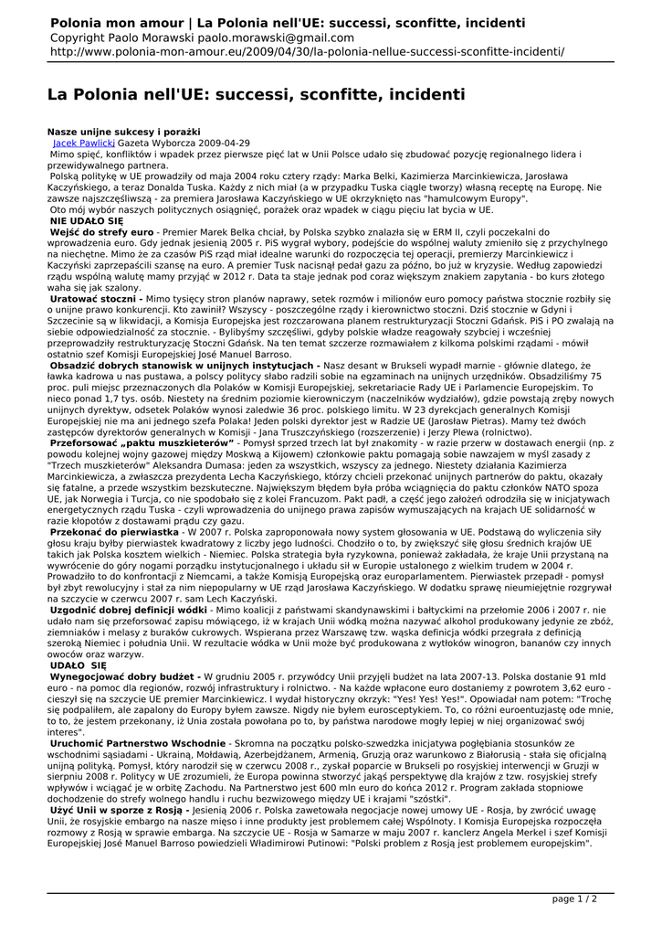 Polonia mon amour | La Polonia nell'UE: successi, sconfitte, incidenti Copyright Paolo Morawski [email protected] http://www.polonia-mon-amour.eu/2009/04/30/la-polonia-nellue-successi-sconfitte-incidenti/ La Polonia nell'UE: successi, sconfitte, incidenti Nasze unijne sukcesy i porażki Jacek Pawlicki, Gazeta Wyborcza 2009-04-29 Mimo spięć, konfliktów i wpadek przez pierwsze pięć lat w Unii Polsce udało się zbudować pozycję regionalnego lidera i przewidywalnego partnera. Polską politykę w UE prowadziły od maja 2004 roku cztery rządy: Marka Belki, Kazimierza Marcinkiewicza, Jarosława Kaczyńskiego, a teraz Donalda Tuska. Każdy z nich miał (a w przypadku Tuska ciągle tworzy) własną receptę na Europę. Nie zawsze najszczęśliwszą - za premiera Jarosława Kaczyńskiego w UE okrzyknięto nas "hamulcowym Europy". Oto mój wybór naszych politycznych osiągnięć, porażek oraz wpadek w ciągu pięciu lat bycia w UE. NIE UDAŁO SIĘ Wejść do strefy euro - Premier Marek Belka chciał, by Polska szybko znalazła się w ERM II, czyli poczekalni do wprowadzenia euro. Gdy jednak jesienią 2005 r. PiS wygrał wybory, podejście do wspólnej waluty zmieniło się z przychylnego na niechętne. Mimo że za czasów PiS rząd miał idealne warunki do rozpoczęcia tej operacji, premierzy Marcinkiewicz i Kaczyński zaprzepaścili szansę na euro. A premier Tusk nacisnął pedał gazu za późno, bo już w kryzysie. Według zapowiedzi rządu wspólną walutę mamy przyjąć w 2012 r. Data ta staje jednak pod coraz większym znakiem zapytania - bo kurs złotego waha się jak szalony. Uratować stoczni - Mimo tysięcy stron planów naprawy, setek rozmów i milionów euro pomocy państwa stocznie rozbiły się o unijne prawo konkurencji. Kto zawinił? Wszyscy - poszczególne rządy i kierownictwo stoczni. Dziś stocznie w Gdyni i Szczecinie są w likwidacji, a Komisja Europejska jest rozczarowana planem restrukturyzacji Stoczni Gdańsk. PiS i PO zwalają na siebie odpowiedzialność za stocznie. - Bylibyśmy szczęśliwi, gdyby polskie władze reagowały szybciej i wcześniej przeprowadziły restrukturyzację Stoczni Gdańsk. Na ten temat szczerze rozmawiałem z kilkoma polskimi rządami - mówił ostatnio szef Komisji Europejskiej José Manuel Barroso. Obsadzić dobrych stanowisk w unijnych instytucjach - Nasz desant w Brukseli wypadł marnie - głównie dlatego, że ławka kadrowa u nas pustawa, a polscy politycy słabo radzili sobie na egzaminach na unijnych urzędników. Obsadziliśmy 75 proc. puli miejsc przeznaczonych dla Polaków w Komisji Europejskiej, sekretariacie Rady UE i Parlamencie Europejskim. To nieco ponad 1,7 tys. osób. Niestety na średnim poziomie kierowniczym (naczelników wydziałów), gdzie powstają zręby nowych unijnych dyrektyw, odsetek Polaków wynosi zaledwie 36 proc. polskiego limitu. W 23 dyrekcjach generalnych Komisji Europejskiej nie ma ani jednego szefa Polaka! Jeden polski dyrektor jest w Radzie UE (Jarosław Pietras). Mamy też dwóch zastępców dyrektorów generalnych w Komisji - Jana Truszczyńskiego (rozszerzenie) i Jerzy Plewa (rolnictwo). Przeforsować „paktu muszkieterów” - Pomysł sprzed trzech lat był znakomity - w razie przerw w dostawach energii (np. z powodu kolejnej wojny gazowej między Moskwą a Kijowem) członkowie paktu pomagają sobie nawzajem w myśl zasady z "Trzech muszkieterów" Aleksandra Dumasa: jeden za wszystkich, wszyscy za jednego. Niestety działania Kazimierza Marcinkiewicza, a zwłaszcza prezydenta Lecha Kaczyńskiego, którzy chcieli przekonać unijnych partnerów do paktu, okazały się fatalne, a przede wszystkim bezskuteczne. Największym błędem była próba wciągnięcia do paktu członków NATO spoza UE, jak Norwegia i Turcja, co nie spodobało się z kolei Francuzom. Pakt padł, a część jego założeń odrodziła się w inicjatywach energetycznych rządu Tuska - czyli wprowadzenia do unijnego prawa zapisów wymuszających na krajach UE solidarność w razie kłopotów z dostawami prądu czy gazu. Przekonać do pierwiastka - W 2007 r. Polska zaproponowała nowy system głosowania w UE. Podstawą do wyliczenia siły głosu kraju byłby pierwiastek kwadratowy z liczby jego ludności. Chodziło o to, by zwiększyć siłę głosu średnich krajów UE takich jak Polska kosztem wielkich - Niemiec. Polska strategia była ryzykowna, ponieważ zakładała, że kraje Unii przystaną na wywrócenie do góry nogami porządku instytucjonalnego i układu sił w Europie ustalonego z wielkim trudem w 2004 r. Prowadziło to do konfrontacji z Niemcami, a także Komisją Europejską oraz europarlamentem. Pierwiastek przepadł - pomysł był zbyt rewolucyjny i stał za nim niepopularny w UE rząd Jarosława Kaczyńskiego. W dodatku sprawę nieumiejętnie rozgrywał na szczycie w czerwcu 2007 r. sam Lech Kaczyński. Uzgodnić dobrej definicji wódki - Mimo koalicji z państwami skandynawskimi i bałtyckimi na przełomie 2006 i 2007 r. nie udało nam się przeforsować zapisu mówiącego, iż w krajach Unii wódką można nazywać alkohol produkowany jedynie ze zbóż, ziemniaków i melasy z buraków cukrowych. Wspierana przez Warszawę tzw. wąska definicja wódki przegrała z definicją szeroką Niemiec i południa Unii. W rezultacie wódka w Unii może być produkowana z wytłoków winogron, bananów czy innych owoców oraz warzyw. UDAŁO SIĘ Wynegocjować dobry budżet - W grudniu 2005 r. przywódcy Unii przyjęli budżet na lata 2007-13. Polska dostanie 91 mld euro - na pomoc dla regionów, rozwój infrastruktury i rolnictwo. - Na każde wpłacone euro dostaniemy z powrotem 3,62 euro cieszył się na szczycie UE premier Marcinkiewicz. I wydał historyczny okrzyk: "Yes! Yes! Yes!". Opowiadał nam potem: "Trochę się podpaliłem, ale zapalony do Europy byłem zawsze. Nigdy nie byłem eurosceptykiem. To, co różni euroentuzjastę ode mnie, to to, że jestem przekonany, iż Unia została powołana po to, by państwa narod