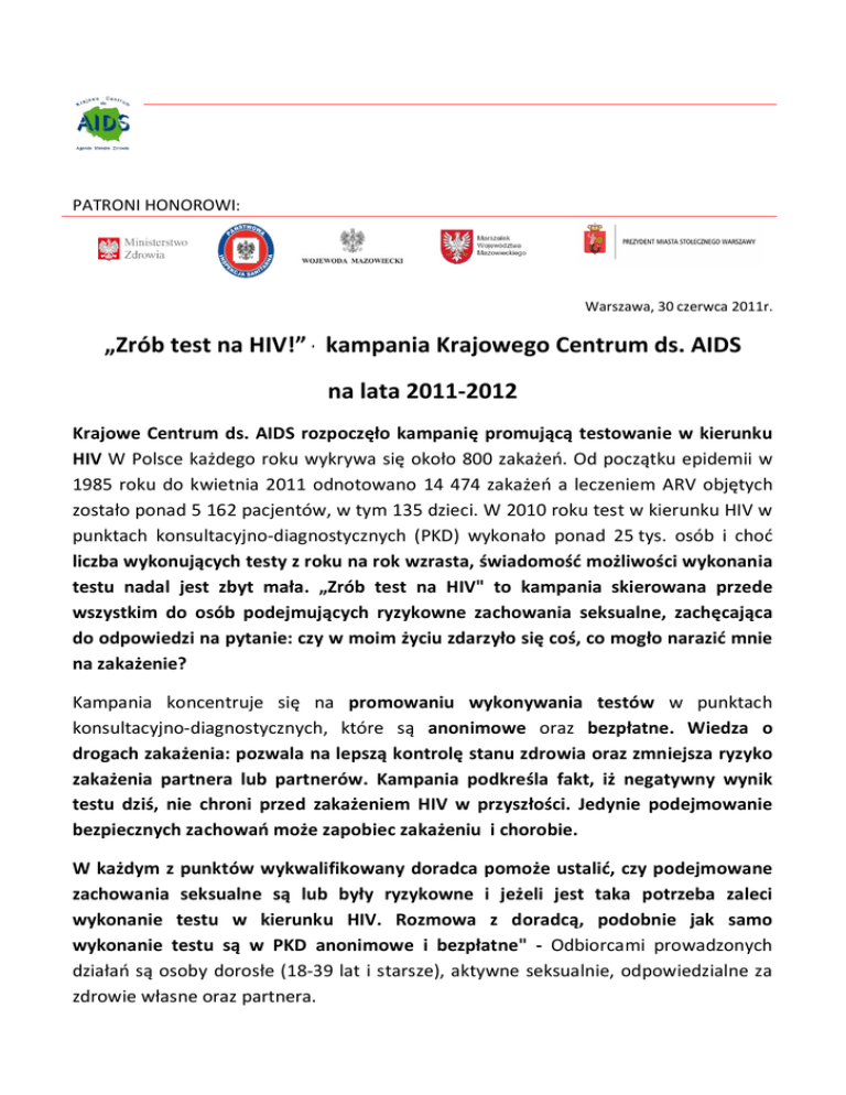 PATRONI HONOROWI: Warszawa, 30 czerwca 2011r. „Zrób test na HIV!” - kampania Krajowego Centrum ds. AIDS na lata 2011-2012 Krajowe Centrum ds. AIDS rozpocz o kampani promuj testowanie w kierunku HIV W Polsce ka dego roku wykrywa si oko o 800 zaka . Od pocz tku epidemii w 1985 roku do kwietnia 2011 odnotowano 14 474 zaka a leczeniem ARV obj tych zosta o ponad 5 162 pacjentów, w tym 135 dzieci. W 2010 roku test w kierunku HIV w punktach konsultacyjno-diagnostycznych (PKD) wykona o ponad 25 tys. osób i cho liczba wykonuj cych testy z roku na rok wzrasta, wiadomo mo liwo ci wykonania testu nadal jest zbyt ma a. „Zrób test na HIV" to kampania skierowana przede wszystkim do osób podejmuj cych ryzykowne zachowania seksualne, zach caj ca do odpowiedzi na pytanie: czy w moim yciu zdarzy o si co , co mog o narazi mnie na zaka enie? Kampania koncentruje si na promowaniu wykonywania testów w punktach konsultacyjno-diagnostycznych, które s anonimowe oraz bezp atne. Wiedza o drogach zaka enia: pozwala na lepsz kontrol stanu zdrowia oraz zmniejsza ryzyko zaka enia partnera lub partnerów. Kampania podkre la fakt, i negatywny wynik testu dzi , nie chroni przed zaka eniem HIV w przysz ci. Jedynie podejmowanie bezpiecznych zachowa mo e zapobiec zaka eniu i chorobie. W ka dym z punktów wykwalifikowany doradca pomo e ustali , czy podejmowane zachowania seksualne s lub by y ryzykowne i je eli jest taka potrzeba zaleci wykonanie testu w kierunku HIV. Rozmowa z doradc , podobnie jak samo wykonanie testu s w PKD anonimowe i bezp atne" - Odbiorcami prowadzonych dzia s osoby doros e (18-39 lat i starsze), aktywne seksualnie, odpowiedzialne za zdrowie w asne oraz partnera. Anonimowe i bezp atne testowanie w kierunku HIV Bezp atnie i anonimowo testy na obecno wirusa HIV, po czone z poradnictwem oko o testowym, w odniesieniu do indywidualnego pacjenta mo na dokona w punktach konsultacyjno-diagnostycznych (PKD). Punkty to miejsca, w których nie tylko mo na przeprowadzi test, ale tak e spotka si z doradc , który poinformuje o przebiegu testu, interpretacji jego wyniku i oszacuje ryzyko zagro enia. Doradca towarzyszy równie przy otrzymaniu wyniku, by na bie co wyja ni jego znaczenie, rozwia wszelkie w tpliwo ci, a w przypadku wyniku dodatniego by wsparciem i wskaza dalsze mo liwo ci. Rozmowa z doradc , podobnie jak testowanie, jest anonimowa i bezp atna. Punkty powstaj dzi ki dotacjom Ministra Zdrowia udzielanym przez Krajowe Centrum ds. AIDS organizacjom pozarz dowych wspó pracuj cym z zak adami opieki zdrowotnej. Ich dzia alno wspierana jest równie przez w adze lokalne. Obecnie w Polsce funkcjonuje 30 PKD rekomendowanych i wspó finansowanych przez Krajowe Centrum ds. AIDS. Adresy punktów konsultacyjno-diagnostycznych w woj. lubelskim: 1/Lublin Punkt Konsultacyjno-Diagnostyczny przy Punkcie Pobra Samodzielnego Publicznego Szpitala Wojewódzkiego im. Jana Bo ego ul. Biernackiego 9; 20-089 Lublin 2/Pu awy Punkt Konsultacyjno-Diagnostyczny przy Poradni Profilaktyki i Terapii Uzale nie MONAR ul. Partyzantów 17; 24-100 Pu awy Wszelkie informacje o HIV/AIDS oraz bezp atnych i anonimowych badaniach znajduj si na stronie internetowej Krajowego Centrum ds. AIDS - www.aids.gov.pl. Na wszelkie pytania odpowiedz równie konsultanci Telefonu Zaufania. Telefon Zaufania HIV/AIDS: 801 888 448* (22) 692 82 26 *p atne za pierwsz minut po czenia