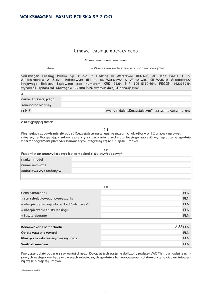 Umowa leasingu operacyjnego nr ............................................ dnia ...................................... w Warszawie została zawarta umowa pomiędzy: Volkswagen Leasing Polska Sp. z o.o. z siedzibą w Warszawie (00-828), al. Jana Pawła II 15, zarejestrowana w Sądzie Rejonowym dla m. st. Warszawy w Warszawie, XII Wydział Gospodarczy Krajowego Rejestru Sądowego pod numerem KRS 3329, NIP 525-15-59-664, REGON 012305049, wysokość kapitału zakładowego 3 100 000 PLN, zwanym dalej „Finansującym” a nazwa Korzystającego zam./adres siedziby nr NIP zwanym dalej „Korzystającym”, reprezentowanym przez: o następującej treści: §1 Finansujący zobowiązuje się oddać Korzystającemu w leasing przedmiot określony w § 2 umowy na okres .......... miesięcy, a Korzystający zobowiązuje się za używanie przedmiotu leasingu zapłacić wynagrodzenie zgodnie z harmonogramem płatności stanowiącym integralną część niniejszej umowy. §2 Przedmiotem umowy leasingu jest samochód ciężarowy/osobowy*: marka i model numer nadwozia dodatkowo wyposażony w §3 Cena samochodu PLN + cena dodatkowego wyposażenia PLN + ubezpieczenie pojazdu na 1 rok/cały okres* PLN + ubezpieczenie spłaty leasingu PLN + koszty uboczne PLN 0,00 PLN Końcowa cena samochodu Opłata wstępna wynosi PLN Miesięczne raty leasingowe wynoszą PLN Wartość końcowa PLN Powyższe opłaty podane są w wartości netto. Do opłat tych zostanie doliczony podatek VAT. Płatności opłat leasingowych następować będą w okresach miesięcznych zgodnie z harmonogramem płatności stanowiącym integralną część niniejszej umowy. *niepotrzebne skreślić §4 Korzystający zobowiązuje się do zapłaty opłat leasingowych w siedzibie Finansującego albo na jego rachunek w Volkswagen Bank Polska S.A. nr: 46 2130 0004 2001 0000 0099 0003. §5 Strony ustalają, iż: termin dostarczenia przedmiotu leasingu wynosi od dnia zawarcia umowy, przedmiot leasingu przeznaczony jest Dodatkowe postanowienia umowy §6 Po zakończeniu umowy leasingu Korzystającemu przysługuje prawo do nabycia przedmiotu umowy leasingu określonego w § 2 niniejszej umowy. Cenę nabycia stanowi wartość końcowa określona w § 3 niniejszej umowy. §7 Przedmiot leasingu zaliczany jest do składników majątkowych Finansującego. §8 Korzystający upoważnia Finansującego do wystawiania faktur VAT bez swojego podpisu (podpisu Korzystającego). §9 Korzystający oświadcza, że znając treść Ogólnych Warunków Umów Leasingu stanowiących załącznik do niniejszej umowy, zgadza się na włączenie ich do treści umowy. Finansującego, Miejsce i data złożenia podpisu Korzystający wyraża zgodę na przetwarzanie swoich danych osobowych przez spółki Volkswagen Bank Polska S.A., Volkswagen Serwis Ubezpieczeniowy Sp. z o.o., obie z siedzibą w Warszawie, Rondo ONZ 1, oraz Volkswagen Leasing Polska Sp. z o.o. z siedzibą w Warszawie, al. Jana Pawła II 15, oraz inne podmioty powiązane z nimi kapitałowo, w szczególności do wykorzystywania tych danych do celów marketingowo-promocyjnych. Korzystający oświadcza, iż jest mu wiadome, że przysługuje mu prawo do wglądu do jego danych osobowych oraz do ich poprawiania. Korzystający upoważnia Volkswagen Leasing Polska Sp. z o.o. do udostępnienia danych osobowych i wszelkich innych informacji związanych z niniejszą umową udziałowcom Volkswagen Leasing Polska Sp. z o.o., tj. Volkswagen FSAG z siedzibą w Braunschweig (Republika Federalna Niemiec) oraz Kulczyk Pon Investment B.V. z siedzibą w Nijkerk (Holandia) oraz podmiotom współpracującym z Volkswagen Leasing Polska Sp. z o.o., jeśli współpraca ta związana jest z wykonaniem niniejszej umowy. Podpis i pieczęć Korzystającego Podpis i pieczęć Volkswagen Leasing Polska Sp. z o.o. Wyrażam zgodę na zobowiązanie mojego małżonka. Podpis małżonka Korzystającego Imię i nazwisko osoby przygotowującej umowę Pieczęć i numer Dealera