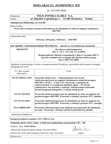 DEKLARACJA ZGODNOŚCI WE Nr TF2/WE/0006 Producent: Adres: TELE-FONIKA KABLE S.A. ul. Hipolita Cegielskiego 1, 32-400 Myślenice, Polska niniejszym deklaruje, że wyrób Opis wyrobu: Przewody o izolacji i powłoce polwinitowej do układania na stałe na napięcie znaminowe 450/750V Oznaczenie typu: YDY(żo), YDYp(żo), YDYt(żo) - 450/750V jest zgodny z postanowieniami Dyrektywy: (łącznie ze wszystkimi jej zmianami) 2006/95/WE Dyrektywa niskonapięciowa (Dz. U. UE L 374 z dn. 27.12.2006) Rozporządzenie Ministra Gospodarki z dnia 21 sierpnia 2007 w sprawie zasadniczych wymagań dla sprzętu elektrycznego (Dz.U.2007.155.1089) Zgodność wymienionego wyrobu z postanowieniami Dyrektywy potwierdza dotrzymanie wymagań następujących norm: Nr i data wydania dokumentu: PN-EN 50525-1:2011 Tytuł: Przewody elektryczne -- Niskonapięciowe przewody elektroenergetyczne na napięcie znamionowe nieprzekraczające 450/750 V (Uo/U) -- Część 3-41: Przewody o specjalnych właściwościach w warunkach działania ognia -- Przewody jednożyłowe, bez powłoki, o izolacji z usieciowanego materiału niezawierającego halogenów i o małej emisji dymu ZN-TF-220:2013 Przewody elektroenergetyczne do układania na stałe na napięcie nie przekraczające 450/750V. Przewody o izolacji i powłoce PVC, płaskie. ZN-TF-221:2013 Przewody elektroenergetyczne do układania na stałe na napięcie nie przekraczające 450/750V. Przewody o izolacji i powłoce PVC, okrągłe. PN-E-90060:1987 Przewody elektroenergetyczne ogólnego przeznaczenia do układania na stałe - Przewody o izolacji i powłoce polwinitowej, płaskie Informacje dodatkowe: Kategoria palności zgodnie z EN 13501-6: Eca Ostatnie dwie cyfry roku, w którym naniesiono oznaczenie CE:...04 Kraków dnia: 04.03.2016r. Kierownik Działu Kontroli Jakości Ryszard Skiba (stanowisko osoby reprezentującej producenta, imię i nazwisko) …………………….. podpis Dokument nr: Strona 1 z 1