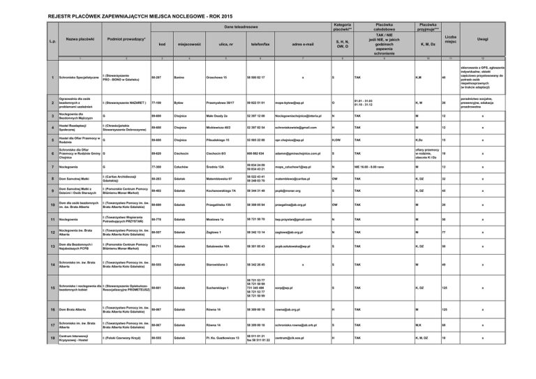 REJESTR PLACÓWEK ZAPEWNIAJĄCYCH MIEJSCA NOCLEGOWE - ROK 2015 Dane teleadresowe L.p. Kategoria placówki** Placówka całodobowa Placówka przyjmuje*** kod miejscowość ulica, nr telefon/fax adres e-mail S, H, N, OW, O TAK / NIE jeśli NIE, w jakich godzinach zapewnia schronienie K, M, Dz 3 4 5 6 7 8 9 10 Podmiot prowadzący* Nazwa placówki 1 2 Liczba miejsc Uwagi 11 12 1 Schronisko Specjalistyczne I: (Stowarzyszenie PRO - BONO w Gdańsku) 80-297 Banino Orzechowa 15 58 500 82 17 x S TAK K,M 40 skierowanie z OPS, zgłoszenie indywidualne; obiekt częściowo przystosowany do potrzeb osób niepełnosprawnych (w trakcie adaptacji) 2 Ogrzewalnia dla osób bezdomnych z problemami uzależnień I: (Stowarzyszenie NAZARET ) 77-100 Bytów Przemysłowa 38/17 59 822 51 01 [email protected] O 01.01 - 31.03 01.10 - 31.12 K, M 20 poradnictwo socjalne, prewencyjne, edukacja prozdrowotna 3 Noclegownia dla Bezdomnych Mężczyzn G 89-600 Chojnice Małe Osady 2a 52 397 12 08 [email protected] N TAK M 12 x 4 Hostel Readaptacji Społecznej I: (Chrześcijańskie Stowarzyszenie Dobroczynne) 89-600 Chojnice Mickiewicza 48/2 52 397 82 54 [email protected] H TAK M 12 x 5 Hostel dla Ofiar Przemocy w G Rodzinie 89-600 Chojnice Piłsudskiego 15 52 565 22 88 [email protected] H,OW TAK K,Dz 15 x 6 Schronisko dla Ofiar Przemocy w Rodzinie Gminy G Chojnice 89-620 Ciechocin Ciechocin 8/3 600 882 634 [email protected] S TAK ofiary przemocy w rodzinie, 10 obecnie K i Dz x 7 Noclegownia G 77-300 Człuchów Średnia 12A 59 834 24 09 59 834 43 21 [email protected] N NIE 16.00 - 8.00 rano M 13 x 8 Dom Samotnej Matki I: (Caritas Archidiecezji Gdańskiej) 80-283 Gdańsk Matemblewska 67 58 522 43 41 58 348 03 70 [email protected] OW TAK K, DZ 32 x 9 Dom Samotnej Matki z Dziećmi i Osób Starszych I: (Pomorskie Centrum Pomocy Bliźniemu Monar-Markot) 80-402 Gdańsk Kochanowskiego 7A 58 344 31 49 [email protected] S TAK K, DZ 45 x 10 Dom dla osób bezdomnych im. św. Brata Alberta I: (Towarzystwo Pomocy im. św. 80-690 Brata Alberta Koło Gdańskie) Gdańsk Przegalińska 135 58 308 05 94 [email protected] OW TAK M 20 x 11 Noclegownia I: (Towarzystwo Wspierania Potrzebujących PRZYSTAŃ) 80-778 Gdańsk Mostowa 1a 58 721 50 70 [email protected] N TAK M 50 x 12 Noclegownia św. Brata Alberta I: (Towarzystwo Pomocy im. św. 80-557 Brata Alberta Koło Gdańskie) Gdańsk Żaglowa 1 58 342 13 14 [email protected] N TAK M 77 x 13 Dom dla Bezdomnych i Najuboższych PCPB I: (Pomorskie Centrum Pomocy Bliźniemu Monar-Markot) 80-711 Gdańsk Sztutowska 16A 58 301 85 43 [email protected] S TAK K, DZ 50 x 14 Schronisko im. św. Brata Alberta I: (Towarzystwo Pomocy im. św. 80-555 Brata Alberta Koło Gdańskie) Gdańsk Starowiślana 3 58 342 26 45 S TAK M 49 x 15 Schronisko i noclegownia dla I: (Stowarzyszenie Opiekuńczo80-601 bezdomnych kobiet Resocjalizacyjne PROMETEUSZ) Gdańsk Sucharskiego 1 58 721 53 77 58 721 50 99 731 345 490 58 721 53 77 58 721 50 99 [email protected] S TAK K, DZ 125 x 16 Dom Brata Alberta I: (Towarzystwo Pomocy im. św. 80-067 Brata Alberta Koło Gdańskie) Gdańsk Równa 14 58 309 00 18 [email protected] H TAK M 125 x 17 Schronisko im. św. Brata Alberta I: (Towarzystwo Pomocy im. św. 80-067 Brata Alberta Koło Gdańskie) Gdańsk Równa 14 58 309 00 18 [email protected] S TAK M,K 68 x 18 Centrum Interwencji Kryzysowej - Hostel I: (Polski Czerwony Krzyż) Gdańsk Pl. Ks. Gustkowicza 13 58 511 01 21 fax 58 511 01 22 [email protected] H TAK K, M, DZ 10 x 80-555 x 19 Dom Pomocy "EMAUS" I: (Stowarzyszenie Pomocy Osobom Wychodzącym na Wolność EMAUS) 80-074 Gdańsk Sandomierska 55/57 58 305 59 79 602 490 291 20 Całodobowe Pogotowie Socjalne dla Osób Nietrzeźwych I: (Towarzystwo Wspierania Potrzebujących PRZYSTAŃ) 80-802 Gdańsk 3 Maja 6 58 302 37 44 21 Tymczasowy Ośrodek opiekuńczy G 81-602 Gdynia Chwarznieńska 93 58 624 95 91 22 Schronisko dla Bezdomnych I: (Stowarzyszenie Alter - Ego) Osób i Rodzin 81-200 Gdynia Leszczynki 153 23 Schronisko dla Osób Bezdomnych Punkt Interwencyjnego Noclegu I: (Stowarzyszenie Alter - Ego) 81-200 Gdynia 24 Schronisko dla Bezdomnych I: (Chrześcijańskie Osób Stowarzyszenie Dobroczynne) 81-351 25 Zespół Opiekuńczy Schronisko dla Bezdomnych G Kobiet 26 Zespół Opiekuńczy - Dom Samotnej Matki 27 przyjmowanie na podstawie bezpośredniej rozmowy z kierownikiem lub psychologiem w placówce S TAK M 12 N TAK K,M 30 x [email protected] OW TAK M 89 x 58 713 57 44 [email protected] S TAK K,K+Dz,M 55 x Janka Wiśniewskiego 24 58 776 20 01 [email protected] S TAK M 25 x Gdynia Jana z Kolna 28 58 781 68 47 [email protected] S, N TAK M 50 x 81-376 Gdynia Fredry 3 58 661 65 26 [email protected] OW, S TAK K 22 x G 81-376 Gdynia Fredry 3 58 661 65 26 [email protected] OW, S TAK K,Dz 19 x Zespół Opiekuńczy Mieszkania Chronione G 81-376 Gdynia Fredry 3 58 661 65 26 [email protected] OW, S TAK K 19 x 28 Centrum Interwencji Kryzysowej - Hostel P 83-300 Kartuzy Gdańska 12 58 684 02 19 [email protected] H TAK K, M, Dz 2 x 29 Dom dla Bezdomnych Kobiet I: (Stowarzyszenie Abstynenckie 83-300 i Kobiet z Dziećmi KASZUBY) Kartuzy Jeziorna 18A 512 736 617 [email protected] S TAK K,Dz 25 x 30 Dom dla Bezdomnych Mężczyzn I: (Stowarzyszenie Abstynenckie 83-300 KASZUBY) Kartuzy Bilowo 1 512 736 617 [email protected] S TAK M 10 x Noclegownia I: (Stowarzyszenie Abstynenckie 83-300 KASZUBY) Kartuzy Bilowo 1 512 736 617 [email protected] N TAK M 5 x Ogrzewalnia I: (Stowarzyszenie Abstynenckie 83-300 KASZUBY) Kartuzy Bilowo 1 512 736 617 [email protected] O NIE 19.00 - 6.00 rano K, M 15 x 31 32 [email protected] x 33 Schronisko Specjalistyczne I: (Stowarzyszenie PRO - BONO w Gdańsku) 83-050 Kolbudy Wybickiego 37 58 686 56 12 608 106 096 [email protected] S TAK M, K 40 skierowanie z OPS, zgłoszenie indywidualne; obiekt częściowo przystosowany do potrzeb osób niepełnosprawnych (w trakcie adaptacji) 34 Ogrzewalnia G 83-400 Kościerzyna Towarowa 6 58 686 60 66 601 295 444 [email protected] O NIE 19.00 