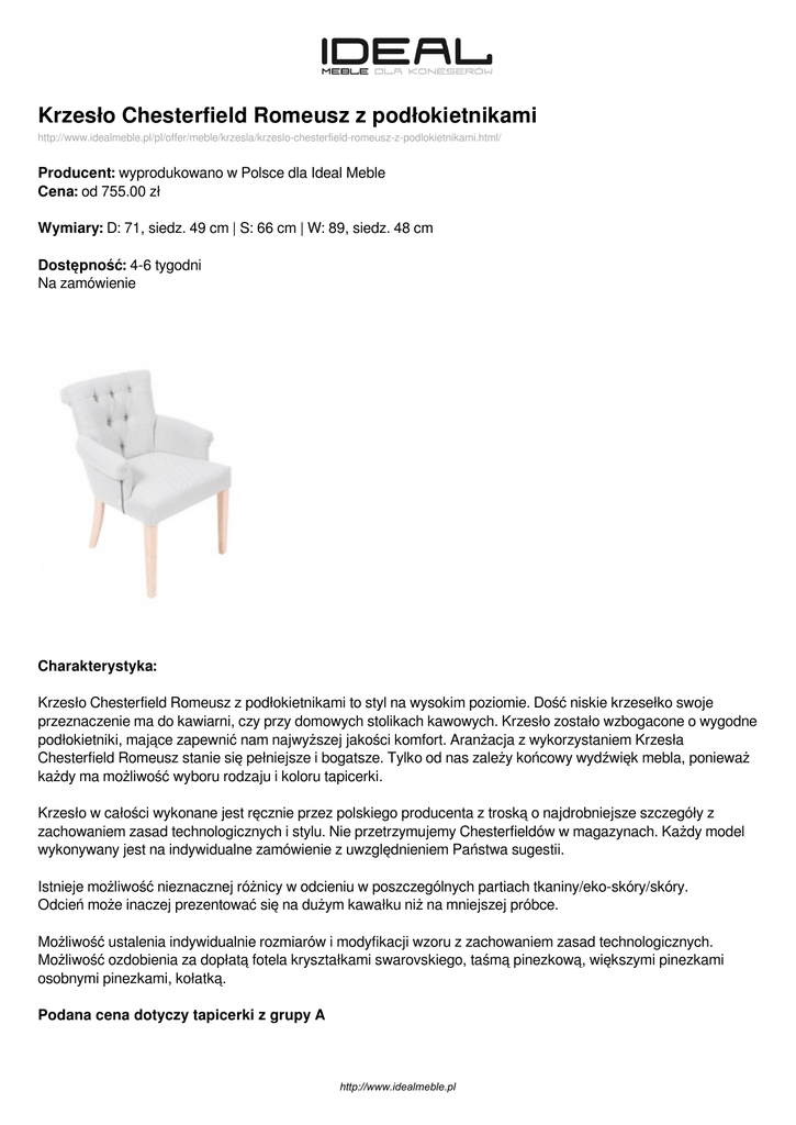 Krzesło Chesterfield Romeusz z podłokietnikami http://www.idealmeble.pl/pl/offer/meble/krzesla/krzeslo-chesterfield-romeusz-z-podlokietnikami.html/ Producent: wyprodukowano w Polsce dla Ideal Meble Cena: od 755.00 zł Wymiary: D: 71, siedz. 49 cm | S: 66 cm | W: 89, siedz. 48 cm Dostępność: 4-6 tygodni Na zamówienie Charakterystyka: Krzesło Chesterfield Romeusz z podłokietnikami to styl na wysokim poziomie. Dość niskie krzesełko swoje przeznaczenie ma do kawiarni, czy przy domowych stolikach kawowych. Krzesło zostało wzbogacone o wygodne podłokietniki, mające zapewnić nam najwyższej jakości komfort. Aranżacja z wykorzystaniem Krzesła Chesterfield Romeusz stanie się pełniejsze i bogatsze. Tylko od nas zależy końcowy wydźwięk mebla, ponieważ każdy ma możliwość wyboru rodzaju i koloru tapicerki. Krzesło w całości wykonane jest ręcznie przez polskiego producenta z troską o najdrobniejsze szczegóły z zachowaniem zasad technologicznych i stylu. Nie przetrzymujemy Chesterfieldów w magazynach. Każdy model wykonywany jest na indywidualne zamówienie z uwzględnieniem Państwa sugestii. Istnieje możliwość nieznacznej różnicy w odcieniu w poszczególnych partiach tkaniny/eko-skóry/skóry. Odcień może inaczej prezentować się na dużym kawałku niż na mniejszej próbce. Możliwość ustalenia indywidualnie rozmiarów i modyfikacji wzoru z zachowaniem zasad technologicznych. Możliwość ozdobienia za dopłatą fotela kryształkami swarovskiego, taśmą pinezkową, większymi pinezkami osobnymi pinezkami, kołatką. Podana cena dotyczy tapicerki z grupy A http://www.idealmeble.pl W dostępnych wersjach produktu znajduje się cena dla tapicerek z innych grup. W przypadku tapicerki skórzanej prosimy o kontakt. http://www.idealmeble.pl Dostępne wersje produktu: nazwa produktu Krzesło Chesterfield Romeusz z podłokietnikami warianty Tapicerka materiał, tkanina, plusz gr A cena 755.00zł dostępne 4-6 tygodni Krzesło Chesterfield Romeusz z podłokietnikami Tapicerka materiał, tkanina, plusz gr B 900.00zł 4-6 tygodni Krzesło Chesterfield Romeusz z podłokietnikami Tapicerka materiał, tkanina, plusz gr C 1195.00zł 4-6 tygodni Krzesło Chesterfield Romeusz z podłokietnikami Tapicerka materiał, tkanina, plusz gr D 1370.00zł 4-6 tygodni http://www.idealmeble.pl Zdjęcia produktu: http://www.idealmeble.pl Powered by TCPDF (www.tcpdf.org)