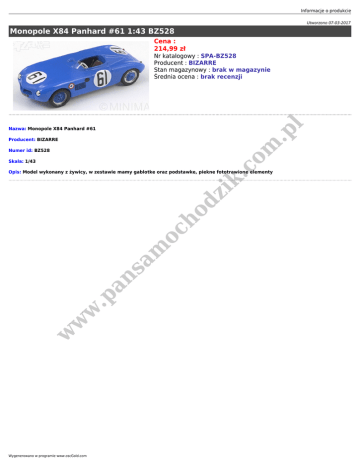 Informacje o produkcie Utworzono 07-03-2017 Monopole X84 Panhard #61 1:43 BZ528 Cena : 214,99 zł l Nr katalogowy : SPA-BZ528 Producent : BIZARRE Stan magazynowy : brak w magazynie Średnia ocena : brak recenzji .p Nazwa: Monopole X84 Panhard #61 om Producent: BIZARRE Numer id: BZ528 .c Skala: 1/43 w w w .p an sa m oc ho dz ik Opis: Model wykonany z żywicy, w zestawie mamy gablotke oraz podstawke, piekne fototrawione elementy Wygenerowano w programie www.oscGold.com