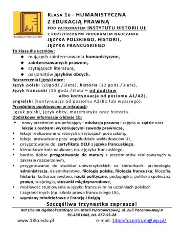 K LASA 1 B - HUMANISTYCZNA Z EDUKACJĄ PRAWNĄ P O D P AT RO N A T EM INSTYTUTU HISTORII UŁ Z RO Z SZE RZ O N YM P RO G R A M E M N AU CZ A NIA JĘZYKA POLSKIEGO, HISTORII, JĘZYKA FRANCUSKIEGO To klasa dla uczniów: mających zainteresowania humanistyczne, zainteresowanych prawem, czytających literaturę, pasjonatów języków obcych. Rozszerzenia i języki obce: Język polski (20godz./3lata), historia (12 godz./3lata), Język francuski (15 godz./3lata – od podstaw albo kontynuacja od poziom u A1/A2), angielski (kontynuacja od poziomu A2/B1 lub wyższego). Przedmioty punktowane w rekrutacji: język polski, język obcy, m atem atyka oraz historia. Dodatkowe informacje o klasie 1b: nowy przedmiot uzupełniający– edukacja prawna i zajęcia w sądzie oraz lekcje z osobami wykonującymi zawody prawnicze, lekcje realizowane w różnych instytucjach poza szkołą, lekcje prowadzone przy współudziale wykładowców UŁ, przygotowanie do certyfikatu DELF z języka francuskiego, kierunkowe koła naukowe, np. z języka francuskiego, bardzo dobre przygotowanie do matury z przedmiotów realizowanych w zakresie rozszerzonym, przygotowanie do studiów uniwersyteckich na kierunkach: archeologia, administracja, dziennikarstwo, filologia polska, filologia francuska, filozofia, historia, kulturoznawstwo, nauki polityczne, pedagogika, polityka społeczna, prawo, socjologia, stosunki międzynarodowe, możliwość studiowania w języku francuskim na uczelniach polskich i zagranicznych (np. szkoła prawa francuskiego UŁ), wymiany młodzieżowe z Francją i Belgią. Szczęśliwa trzynastka zaprasza! XIII Liceum Ogólnokształcące im. Marii Piotrowiczowej, ul. Zuli Pacanowskiej 4 91-430 Łódź, tel. 657-55-28 www.13lo.edu.pl e-mail: [email protected]/