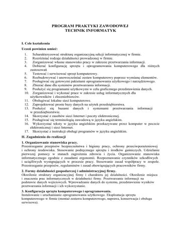 PROGRAM PRAKTYKI ZAWODOWEJ TECHNIK INFORMATYK I. Cele kształcenia Uczeń powinien umieć: 1. 2. 3. 4. 5. 6. 7. 8. 9. 10. 11. 12. 13. 14. 15. 16. 17. Scharakteryzować strukturę organizacyjną sekcji informatycznej w firmie. Rozróżniać rodzaje działalności prowadzonej w firmie. Zorganizować własne stanowisko pracy w zakresie przetwarzania informacji. Dobierać konfigurację sprzętu i oprogramowania komputerowego dla różnych zastosowań Testować i serwisować sprzęt komputerowy. Rozbudowywać i unowocześniać zestaw komputerowy poprzez wymianę elementów. Posługiwać się gotowymi pakietami oprogramowania użytkowego i narzędziowego. Zbierać dane dla systemów przetwarzania informacji. Posłużyć się programami użytkowymi w celu graficznego przedstawienia danych. Zorganizować i wykonać prace w zakresie usług informatycznych dla użytkowników i zleceniobiorców. Obsługiwać lokalne sieci komputerowe. Zaprojektować proste bazy danych na użytek przedsiębiorstwa. Posłużyć się bazami danych i systemami przetwarzania informacji w przedsiębiorstwie. Skorzystać z zasobów sieci Internet i poczty elektronicznej. Posługiwać się terminologią zawodową w języku angielskim. Wykorzystać teksty w języku angielskim przekazywane przez komputer w poczcie elektronicznej i sieci Internet. Skorzystać z instrukcji obsługi programów w języku angielskim. II. Zagadnienia do realizacji 1. Organizowanie stanowiska pracy. Przestrzeganie przepisów bezpieczeństwa i higieny pracy, ochrony przeciwporażeniowej i ochrony środowiska. Stosowanie podręcznego sprzętu i środków gaśniczych. Udzielanie pierwszej pomocy w stanach zagrożenia zdrowia i życia. Organizowanie stanowiska informatycznego zgodnie z zasadami ergonomii. Rozpoznawanie czynników szkodliwych i uciążliwych występujących w procesie pracy. Stosowanie zasad współpracy w zespole. Przestrzeganie przepisów, regulaminów i zasad obowiązujących pracowników firmy. 2. Formy działalności gospodarczej i administracyjnej firmy. Określenie struktury organizacyjnej firmy i charakteru jej działalności. Określenie miejsca i znaczenia prac informatycznych w działalności firmy. Przetwarzanie informacji na podstawie danych wejściowych. Wprowadzanie danych do systemu, przedstawienie wyników przetwarzania informacji i ich wykorzystanie. 3. Konfiguracja sprzętu komputerowego i oprogramowania. Instalowanie i uruchamianie oprogramowania użytkowego. Eksploatacja sprzętu komputerowego w firmie (montaż zestawu komputerowego, naprawa, konserwacja i obsługa serwisowa). 1 4. Obsługa oprogramowania użytkowego w firmie. Obsługa oprogramowania systemowego i użytkowego stosowanego w firmie. Ochrona danych, programów i procesów przetwarzania informacji. 5. Organizacja i wyposażenie przedsiębiorstwa na potrzeby przetwarzania informacji. Określenie zakresu prac prowadzonych w firmie. Wykorzystanie technicznych środków do zbierania informacji przeznaczonych do przetwarzania. Wykorzystanie sieci Internet w działalności firmy. Obsługa lokalnych sieci komputerowych. Administrowanie systemami informatycznymi oraz archiwizowanie danych. 6. Stosowanie technologii przetwarzania informatycznego Czytanie dokumentacji technologicznej procesu przetwarzania informacji. Planowanie procesów przetwarzania oraz optymalizacja wykorzystania zasobów. Kontrola poprawności procesu przetwarzania. Korzystnie z bibliotek oprogramowania i zbiorów danych. 7. Projektowanie i programowanie. Wybieranie odpowiedniego wariantu rozwiązania danego problemu programistycznego. Określenie elementów procesu projektowania, programowania i uruchamiania programów komputerowych i systemów przetwarzania danych. Organizowanie pracy projektantów i programistów na stanowiskach komputerowych. Obsługa programów do wspomagania procesu projektowania i programowania. III. Uwagi o realizacji i ocenianiu uczniów 1. Organizację zajęć należy dostosować do możliwości danego przedsiębiorstwa, mając na uwadze realizację założonych celów kształcenia. 2. Praktyka powinna stwarzać możliwość poznania praktycznych zastosowań informatyki i organizacji prac informatycznych w przedsiębiorstwie podczas wykonywania prac na rzecz użytkowników lub zleceniodawców. 3. Przed przystąpieniem do pracy uczeń powinien poznać obowiązujące przepisy bezpieczeństwa i higieny pracy. 4. W procesie oceniania powinna dominować obserwacja uczniów oraz ocena efektów ich pracy. 5. Dokonując oceny pracy praktykanta należy uwzględnić: - przestrzeganie dyscypliny pracy, - organizację pracy, - samodzielność podczas wykonywania pracy, - jakość wykonanej pracy, - postawę zawodową. 6. Podczas procesu oceniania należy używać następującej skali ocen: - celujący (6), - bardzo dobry (5), - dobry (4), - dostateczny (3), - dopuszczający (2), - niedostateczny (1). 2