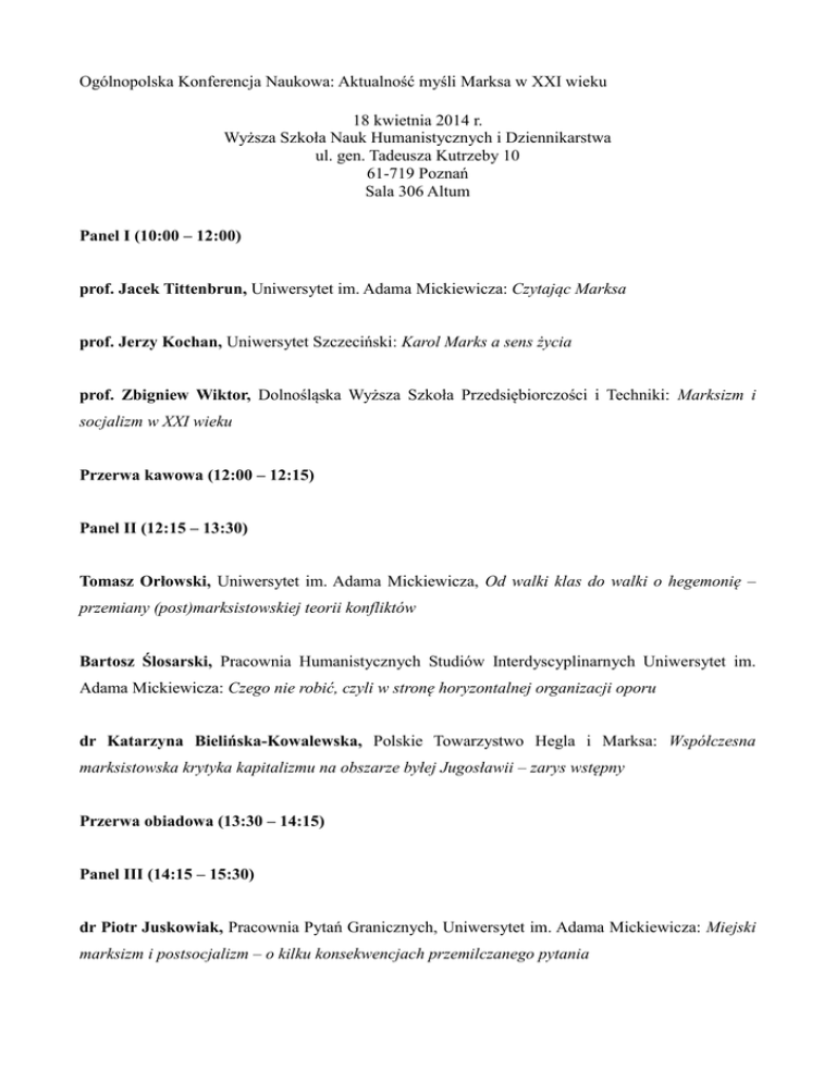 Ogólnopolska Konferencja Naukowa: Aktualność myśli Marksa w XXI wieku 18 kwietnia 2014 r. Wyższa Szkoła Nauk Humanistycznych i Dziennikarstwa ul. gen. Tadeusza Kutrzeby 10 61-719 Poznań Sala 306 Altum Panel I (10:00 – 12:00) prof. Jacek Tittenbrun, Uniwersytet im. Adama Mickiewicza: Czytając Marksa prof. Jerzy Kochan, Uniwersytet Szczeciński: Karol Marks a sens życia prof. Zbigniew Wiktor, Dolnośląska Wyższa Szkoła Przedsiębiorczości i Techniki: Marksizm i socjalizm w XXI wieku Przerwa kawowa (12:00 – 12:15) Panel II (12:15 – 13:30) Tomasz Orłowski, Uniwersytet im. Adama Mickiewicza, Od walki klas do walki o hegemonię – przemiany (post)marksistowskiej teorii konfliktów Bartosz Ślosarski, Pracownia Humanistycznych Studiów Interdyscyplinarnych Uniwersytet im. Adama Mickiewicza: Czego nie robić, czyli w stronę horyzontalnej organizacji oporu dr Katarzyna Bielińska-Kowalewska, Polskie Towarzystwo Hegla i Marksa: Współczesna marksistowska krytyka kapitalizmu na obszarze byłej Jugosławii – zarys wstępny Przerwa obiadowa (13:30 – 14:15) Panel III (14:15 – 15:30) dr Piotr Juskowiak, Pracownia Pytań Granicznych, Uniwersytet im. Adama Mickiewicza: Miejski marksizm i postsocjalizm – o kilku konsekwencjach przemilczanego pytania Przemysław Filip Naumienko, Uniwersytet Łódzki: Koncepcja poprodukcyjności w świetle marksowskiej krytyki ekonomii politycznej Mikołaj Ratajczak, Szkoła Nauk Społecznych, Instytut Filozofii i Socjologii PAN: Kapitalizm kognitywny - nowy etap w politycznej historii intelektu powszechnego Przerwa kawowa (15:30 – 15:45) Panel IV (15:45 – 17:00) Krystian Szadkowski, Instytut Filozofii, Uniwersytet im. Adama Mickiewicza: Współczesne zastosowania Marksowskich i post-operaistycznych teorii w badaniach nad szkolnictwem wyższym Maciej Szlinder, Uniwersytet im. Adama Mickiewicza, Dochód podstawowy z perspektywy marksizmu autonomistycznego Marcin Dachtera, WSNHiD: Państwo a rewolucja – Bakunina z Marksem spór o rolę państwa w przejściu do społeczeństwa bezklasowego Mateusz Pazdej, WSNHiD: Współczesna recepcja walki klas, czyli w jakim stopniu marksizm wpłynął na koncepcje XX-wieczne i czy pozostał aktualny do dzisiaj?