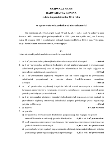 UCHWAŁA Nr 396 RADY MIASTA KONINA z dnia 26 października 2016 roku w sprawie stawek podatku od nieruchomości Na podstawie art. 18 ust. 2 pkt 8, art. 40 ust. 1, art. 41 ust.1, i art. 42 ustawy z dnia 8 marca 1990 r. o samorządzie gminnym (Dz.U. z 2016 r. poz. 446 z późn. zm.), art. 5 ustawy z dnia 12 stycznia 1991 r. o podatkach i opłatach lokalnych (Dz.U. z 2016 r. poz. 716 z późn. zm.) - Rada Miasta Konina uchwala, co następuje: § 1. Ustala się stawki podatku od nieruchomości w wysokości: 1. od 1 m2 powierzchni użytkowej budynków mieszkalnych lub ich części 2. od 1 m 2 - 0,60 zł powierzchni użytkowej budynków lub ich części związanych z prowadzeniem działalności gospodarczej oraz od budynków mieszkalnych lub ich części zajętych na prowadzenie działalności gospodarczej - 21,76 zł 3. od 1 m2 powierzchni użytkowej budynków lub ich części zajętych na prowadzenie działalności gospodarczej w zakresie obrotu siewnym kwalifikowanym materiałem - 10,06 zł 4. od 1 m2 powierzchni użytkowej budynków lub ich części związanych z udzielaniem świadczeń zdrowotnych w rozumieniu przepisów o działalności leczniczej, zajętych przez podmioty udzielające tych świadczeń - 4,61 zł 5. od 1 m2 powierzchni użytkowej pozostałych budynków lub ich części, w tym zajętych na prowadzenie odpłatnej statutowej działalności pożytku publicznego przez organizacje pożytku publicznego 6. od budowli - 4,36 zł - 2 % ich wartości 7. od gruntów: a) związanych z prowadzeniem działalności gospodarczej, bez względu na sposób zakwalifikowania w ewidencji gruntów i budynków - 0,85 zł od 1 m2 powierzchni b) pod wodami powierzchniowymi stojącymi lub wodami powierzchniowymi płynącymi jezior i zbiorników sztucznych - 4,44 zł od 1 ha powierzchni c) pozostałych, w tym zajętych na prowadzenie odpłatnej statutowej działalności pożytku publicznego przez organizacje pożytku publicznego - 0,27 zł od 1 m2 powierzchni 2 d) niezabudowanych objętych obszarem rewitalizacji, o którym mowa w ustawie z dnia 9 października 2015 r. o rewitalizacji (Dz.U. poz. 1777) i położonych na terenach, dla których miejscowy plan zagospodarowania przestrzennego przewiduje przeznaczenie pod zabudowę mieszkaniową, usługową albo zabudowę o przeznaczeniu mieszanym obejmującym wyłącznie te rodzaje zabudowy, jeżeli od dnia wejścia w życie tego planu w odniesieniu do tych gruntów upłynął okres 4 lat, a w tym czasie nie zakończono budowy zgodnie z przepisami prawa budowlanego – 2,98 zł od 1 m2 powierzchni § 2. Wykonanie uchwały powierza się Prezydentowi Miasta Konina. § 3. Traci moc Uchwała Nr 219 Rady Miasta Konina z dnia 25 listopada 2015 roku w sprawie stawek podatku od nieruchomości. § 4. Uchwała wchodzi w życie 1 stycznia 2017 roku i podlega ogłoszeniu w Dzienniku Urzędowym Województwa Wielkopolskiego. Przewodniczący Rady Miasta Konina /-/ Wiesław Steinke 3 UZASADNIENIE do Uchwały Nr 396 Rady Miasta Konina z dnia 26 października 2016 roku w sprawie stawek podatku od nieruchomości Rada gminy, w drodze uchwały, określa wysokość stawek podatku od nieruchomości, z tym że stawki nie mogą przekroczyć górnych granic stawek kwotowych ogłoszonych przez Ministra właściwego do spraw finansów publicznych, w drodze obwieszczenia, w Dzienniku Urzędowym Rzeczypospolitej Polskiej „Monitor Polski”. Ze względu na deflację w wysokości 0,9 % część stawek maksymalnych uległa obniżeniu w stosunku do stawek maksymalnych obowiązujących na 2016 rok. Z uwagi na fakt ogłoszenia w Komunikacie Prezesa Głównego Urzędu Statystycznego z dnia 11 lipca 2016 r. w sprawie wskaźnika cen towarów i usług konsumpcyjnych w I półroczu 2016 r. wskaźnika w wysokości 99,1 (spadek cen o 0,9%), postanawia się utrzymać stawki w podatku od nieruchomości na poziomie stawek z roku 2016. Natomiast ulegają zmniejszeniu stawki dla budynków zajętych na prowadzenie działalności gospodarczej w zakresie udzielania świadczeń zdrowotnych oraz od gruntów niezabudowanych objętych obszarem rewitalizacji z uwagi na obniżenie stawek maksymalnych. Należy podkreślić, że w latach 2014-2016 stawki podatku od nieruchomości nie były zwiększane, a stawki obowiązujące w mieście Koninie (poza ww. dwoma stawkami) odbiegają od możliwych stawek maksymalnych. Prezydent Miasta Konina /-/ Józef Nowicki