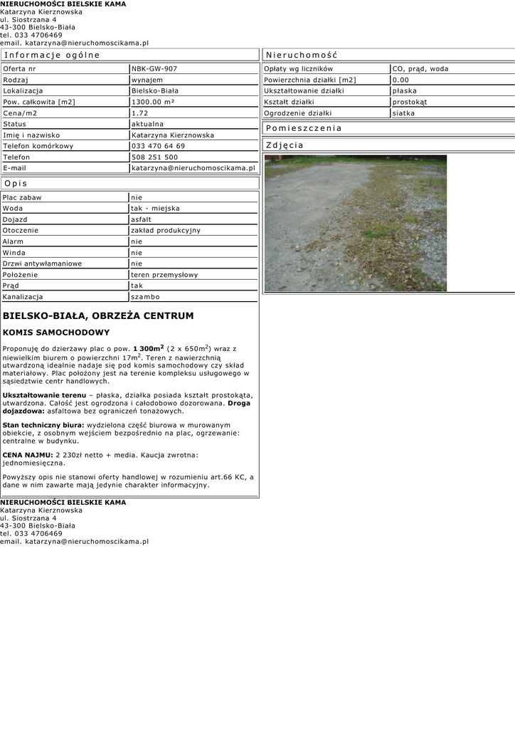 NIERUCHOMOŚCI BIELSKIE KAMA Katarzyna Kierznowska ul. Siostrzana 4 43-300 Bielsko-Biała tel. 033 4706469 email. [email protected] Informacje ogólne Nieruchomość Oferta nr NBK-GW-907 Opłaty wg liczników CO, prąd, woda Rodzaj wynajem Powierzchnia działki [m2] 0.00 Lokalizacja Bielsko-Biała Ukształtowanie działki płaska Pow. całkowita [m2] 1300.00 m² Kształt działki prostokąt Cena/m2 1.72 Ogrodzenie działki siatka Status aktualna Imię i nazwisko Katarzyna Kierznowska Telefon komórkowy 033 470 64 69 Telefon 508 251 500 E-mail [email protected] Opis Plac zabaw nie Woda tak - miejska Dojazd asfalt Otoczenie zakład produkcyjny Alarm nie Winda nie Drzwi antywłamaniowe nie Położenie teren przemysłowy Prąd tak Kanalizacja szambo BIELSKO-BIAŁA, OBRZEŻA CENTRUM KOMIS SAMOCHODOWY Proponuję do dzierżawy plac o pow. 1 300m2 (2 x 650m2) wraz z niewielkim biurem o powierzchni 17m2. Teren z nawierzchnią utwardzoną idealnie nadaje się pod komis samochodowy czy skład materiałowy. Plac położony jest na terenie kompleksu usługowego w sąsiedztwie centr handlowych. Ukształtowanie terenu – płaska, działka posiada kształt prostokąta, utwardzona. Całość jest ogrodzona i całodobowo dozorowana. Droga dojazdowa: asfaltowa bez ograniczeń tonażowych. Stan techniczny biura: wydzielona część biurowa w murowanym obiekcie, z osobnym wejściem bezpośrednio na plac, ogrzewanie: centralne w budynku. CENA NAJMU: 2 230zł netto + media. Kaucja zwrotna: jednomiesięczna. Powyższy opis nie stanowi oferty handlowej w rozumieniu art.66 KC, a dane w nim zawarte mają jedynie charakter informacyjny. NIERUCHOMOŚCI BIELSKIE KAMA Katarzyna Kierznowska ul. Siostrzana 4 43-300 Bielsko-Biała tel. 033 4706469 email. [email protected] Pomieszczenia Zdjęcia