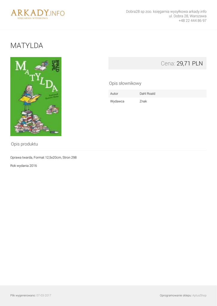 Dobra28 sp zoo. księgarnia wysyłkowa arkady.info ul. Dobra 28, Warszawa +48 22 444 86 97 MATYLDA Cena: 29,71 PLN Opis słownikowy Autor Dahl Roald Wydawca Znak Opis produktu Oprawa twarda, Format 12,5x20cm, Stron 298 Rok wydania 2016 Plik wygenerowano: 07-03-2017 Powered by TCPDF (www.tcpdf.org) Oprogramowanie sklepu: AptusShop