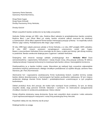Szanowny Panie Starosto, Szanowny Panie Burmistrzu, Drogi Panie Cygan Drogi Panie Schmidt Drodzy Pracownicy firmy Herkules, Drodzy Goście! Witam wszystkich bardzo serdecznie na tej małej uroczystości. Herkules Polska istnieje od 1993. roku. Rodzina Bleul założyła to przedsiębiorstwo bardzo wcześnie. Rodzina Bleul i pan Oliver Bleul już wtedy, bardzo wcześnie odkryli znaczenie tej lokalizacji w Szamotułach. Oliver Bleul zapewnił firmie bardzo interesującą pozycję rynkową – to wspaniały sukces Olivera i jego rodziny. Podziękowania dla niego i jego rodziny. W roku 1999 Agro nabyło pierwsze udziały w firmie Herkules, a w roku 2007 przejęło 100% udziałów. W roku 2007 nowym prezesem zarządzającym ustanowiony został pan Cygan. Razem z pracownikami Herkulesa firma rozwinęła się do stanu, w jakim jest dzisiaj i jaki dzisiaj możemy tu podziwiać. Bardzo serdecznie dziękuję panu Cyganowi i załodze Herkulesa. Świętujemy dziś otwarcie naszego zakładu produkującego drut : Herkules Wire! Dużo zainwestowaliśmy i zapewniamy Herkulesowi i naszej Grupie nową, silną pozycję rynkową. W obliczu międzynarodowej i krajowej konkurencji ta inwestycja była bardzo celowa i bezwzględnie konieczna. Zrealizowaliśmy ją w bardzo krótkim czasie. Warunkiem jej realizacji były oczywiście odpowiednie zezwolenia instytucji państwowych, dlatego chciałbym podziękować za szybkie decyzje, zarówno Panu Staroście, jak i Panu Burmistrzowi. Ukończenie hal i wyposażenia zawdzięczamy firmie budowlanej Gotech, wszelkie terminy zostały bardzo dobrze skoordynowane, a harmonogram był bardzo punktualnie realizowany. W tym miejscu serdecznie dziękuję również firmie Gotech i przedsiębiorstwom uczestniczącym w tym projekcie budowlanym. Zakład produkcji drutu dziś pracuje, ale trzeba było rozwiązać liczne problemy. Za tym, że dzisiaj wszystko działa, stoją panowie Schmidt, Sebastian i Lachmann. Za niestrudzone zaangażowanie chciałbym również im serdecznie podziękować. Dobra robota! Dzisiaj oficjalnie otwieramy naszą drutownię. Życzę nam wszystkim dużo szczęścia i wielu sukcesów z tymi najnowocześniejszymi maszynami i nową linią produkcyjną firmy Hercules. Przyszłość należy do nas, bierzmy się do pracy! Dziękuję bardzo za uwagę.