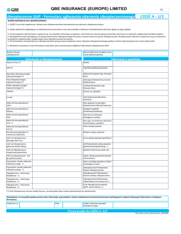 QBE INSURANCE (EUROPE) LIMITED Ubezpieczenie GAP - Formularz zgłoszenia zdarzenia ubezpieczeniowego PL CZĘŚD A - 1/2 WAŻNE INSTRUKCJE DLA UBEZPIECZONEGO: 1. CZĘŚD A musi byd wypełniona i dostarczona Ubezpieczycielowi bezzwłocznie po zdarzeniu ubezpieczeniowym. 2. Każde opóźnienie wpływające na właściwą ocenę roszczenia, może byd powodem obniżenia odszkodowania lub braku zgody na jego wypłatę. 3. Proszę wypełnid cały formularz i upewnid się, czy wszystkie informacje są wpisane. Jeśli konieczne, proszę wpisad pozostałe informacje na osobnych, podpisanych kartkach papieru. 4. Niewypełniony lub niepodpisany na każdej stronie przez Ubezpieczonego formularz zostanie odrzucony przez Ubezpieczyciela. Rozpatrywanie zdarzenia rozpocznie się po otrzymaniu prawidłowo wypełnionego i podpisanego przez Ubezpieczonego formularza. 5. W komunikacji i korespondencji z Ubezpieczycielem proszę zawsze podawad numer zdarzenia ubezpieczeniowego podany w liście rejestracyjnym oraz numer polisy GAP. 6. Określenia stosowane w tym formularzu mają takie same znaczenia jak w Ogólnych Warunkach Ubezpieczenia GAP. Numer Umowy ubezpieczenia: Numer Zdarzenia (znajduje się w Liście Rejestracyjnym): Informacje o Ubezpieczonym: Informacje o pojeździe: Nazwa firmy (*): Marka: NIP (*): Typ/Wersja/Rodzaj pojazdu: Nazwisko Ubezpieczonego/ Upoważnionego (*): Właściciel pojazdu (wg. Dowodu Rej.): Imię Ubezpieczonego/ Upoważnionego (*): Dlaczego Ubezpieczony nie jest Właścicielem: PESEL Ubezpieczonego/ Upoważnionego (*): Użytkownik pojazdu (wg. Dowodu Rej.): Telefon: Numer rej. pojazdu: E-mail: VIN (Vehicle Identification Number): Adres do korespondencji Ulica: Stan pojazdu na początku ubezpieczenia (Nowy/Używany): Adres do korespondencji Miasto: Kategoria pojazdu (Osobowy/Użytkowy): Adres do korespondencji Kod: Stan km w momencie wystąpienia szkody: Adres do korespondencji Inne -1: Stan poj. w momencie zdarzenia (wcześniejsze uszkodz.): Adres do korespondencji Inne-2: Data zakupu pojazdu: Kto kierował pojazdem w momencie zdarzenia: Miejsce zakupu pojazdu: Jeśli nie Ubezpieczony dlaczego ktoś inny: Cena zakupu pojazdu wg faktury: Jeśli nie Ubezpieczony gdzie był wtedy Ubezp.: Jak finansowano zakup pojazdu (gotówka/kredyt/leasing/...): Jeśli nie Ubezpieczony stopieo pokrewieostwa: Badanie techniczne ważne do: Jeśli nie Ubezpieczony - kto go poinformował: Gdzie i kiedy pojazd był ostatnio serwisowany: Poprzednie szkody całkowite Ubezpieczonego - 1: Data i przebieg pojazdu na dzieo ostatniego serwisu: Poprzednie szkody całkowite Ubezpieczonego - 2: Ubezpieczenie PodstawoweNazwa Ubezpieczyciela: Ubezpieczony - informacje dodatkowe - 1: Ubezpieczyciel Podstawowy Numer Umowy Ubezpieczenia: Ubezpieczony - informacje dodatkowe - 2: Ubezpieczenie Podstawoweudział własny (%; kwota min.): Ubezpieczony - informacje dodatkowe - 3: Inne ubezpieczenia pojazdu (GAP, udział własny,...): (*) Jeśli Ubezpieczony nie jest osobą fizyczną - proszę podad dane osoby upoważnionej do reprezentacji Oświadczam, że wszystkie podane przeze mnie informacje są prawdziwe. Jestem świadomy/a konsekwencji karnych wynikających z podania fałszywych informacji w niniejszym formularzu. Podpisano w: Data: Podpis Ubezpieczającego/ Ubezpieczonego: Proszę przejśd do CZĘŚCI A -2/2 GAP_Claim_Form_(A1/2)-Version_20110401 QBE INSURANCE (EUROPE) LIMITED CZĘŚD A - 2/2 Ubezpieczenie GAP - Formularz zgłoszenia zdarzenia ubezpieczeniowego Numer Umowy ubezpieczenia: Numer Zdarzenia (znajduje się w Liście Rejestracyjnym): Informacje o zdarzeniu: Data, godzina i miejsce powstania szkody: Jaki był powód podróży pojazdem: Opis powstania szkody - szczegóły (w razie potrzeby dołączyd opis na osobnej kartce): Dochodzenie Policji (data i godzina zgłoszenia, kto zgłosił): Policja (kontakt, numer sprawy): Jeśli nie zgłoszono Policji - dlaczego: Jeśli nie zgłoszono Policji - inny, odpowiedni dokument: Świadek zdarzenia (kontakt/stopieo pokrewieostwa z Ubezpieczonym): Ubezpieczyciel Podst.-z kim i kiedy się kontaktowano (nr kontaktowy): Uszkodzenie pojazdu (wypadek/żywioł/inne): Kradzież pojazdu: Rodzaj szkody (kolizja/żywioł/inne): W jaki sposób odkryto kradzież: Inne pojazdy biorące udział w zdarzeniu: Kto odkrył, że pojazd został skradziony: Inni uczestnicy zdarzenia: Kiedy pojazd widziano ostatni raz - dokł. data i godz.: Ilu pasażerów było w pojazdach: Gdzie pojazd był widziany ostatni raz - dokł. miejsce: Ranni: Jeśli nie w siedzibie Ubezpieczającego - dlaczego?: Wyniki testu alkoholowego (wszyscy uczestnicy): Kto widział pojazd po raz ostatni: Czy któraś ze stron przyznaje swoją winę - kto, dlaczego: Kto i kiedy użytkował pojazd po raz ostatni: Czy uczestnicy komunikowali się ze sobą po zdarzeniu: W jaki sposób pojazd był zabezpieczony: Czy Ubezpieczony znał innego uczest. zdarzenia: Ile kompletów kluczyków otrzymano przy zakupie pojazdu: Czy Ubezpieczony wcześniej spotkał uczest. zdarzenia: Ile kompletów kluczyków przekazano Ubezp. Podst.: Intensywnośd ruchu drogowego w chwili OŚWIADCZENIE I PEŁNOMOCNICTWO: Ja, niżej podpisany Ubezpieczający/Ubezpieczony, udzielam pełnomocnictwa przedstawicielowi Service Insurance Polska Sp. z o.o., ul. Czerwioskiego6, 40-123 Katowice (dalej "Administrator") do przeprowadzenia niniejszego postępowania i współpracy z: Ubezpieczycielem, dealerem samochodowym, serwisem naprawczym pojazdów, bankiem lub firmą leasingową, nie wyłączając właściwych organów paostwa i innych osób oraz ich pełnomocników w następującym zakresie: -otrzymania informacji dotyczących stanu postępowania ubezpieczeniowego oraz kopii dokumentów dotyczących Ubezpieczenia Podstawowego lub odszkodowao uzyskanych z tego bądź innego tytułu, Warunki pogodowe w chwili zdarzenia: Prędkośd pojazdów przed/ w chwili zdarzenia: Odległośd pomiędzy pojazdami przed zderzeniem: -sprawdzenia danych dot. nabycia oraz szczegó