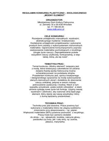 REGULAMIN KONKURSU PLASTYCZNO – EKOLOGICZNEGO „MODNY ELEMENT” ORGANIZATOR: Młodzieżowy Dom Kultury Fabryczna ul. Zemska 16 a 54-438 Wrocław tel. 71 185 09 20 www.mdk.wroc.pl CELE KONKURSU: Rozwijanie umiejętności manualnych, wyobraźni, abstrakcyjnego myślenia i kreatywności. Kształcenie umiejętności projektowania i wykonania prostych form odzieży z wykorzystaniem różnorodnych materiałów. Ograniczenie konsumpcjonizmu poprzez zastosowanie materiałów pochodzących z recyklingu (drugie życie rzeczy). Zaprojektowanie przede wszystkim rzeczy użytkowej, funkcjonalnej, a więc takiej, którą „da się nosić”. TEMATYKA PRAC: Temat konkursu „Modny element” związany jest z modą, która towarzyszy człowiekowi od zarania dziejów.Każdą epokę historyczną można scharakteryzować na podstawie strojów. Przesłaniem konkursu jest, oprócz kreatywnego i designerskiego spojrzenia na modę wykorzystanie starych,niemodnych ubrań i dodatków do stworzenia rzeczy unikalnej, jedynej w swoim rodzaju jednocześnie użytecznej i modnej. Niech w tym wypadku przysłowie „szata ozdobi człowieka”, a stare ubrania zyskają nowe życie lub funkcję. Użyjmy naszej wyobraźni i zdolności, aby wykonać strój bądź jego element, który stanie się naszą wizytówką i który z dumą będziemy prezentować . TECHNIKA PRAC: Technika prac jest dowolna. Prace powinny być wykonane z materiałów które nie ulegną szybkiemu zniszczeniu przy eksponowaniu – np. papier. Większość materiałów (80%) powinna pochodzić z recyklingu. Pracą może być zarówno dodatek do stroju – np.: rękawiczki, torebka, nakrycie głowy, parasolka czy buty, jak i cały strój, np.:suknia, płaszcz, marynarka. Praca powinna być wykonana w taki sposób aby spełniała funkcje prawdziwego odzienia lub dodatku. Dopuszczalne jest przerobienie już istniejących rzeczy, jednak wkład pracy autora powinien stanowić 80% dzieła. WARUNKI UCZESTNICTWA: Konkurs organizowany jest w czterech kategoriach wiekowych: 1. Pierwsza kategoria - dzieci w wieku 7-9 lat 2. Druga kategoria - dzieci w wieku 10 – 13 lat 3. Trzecia kategoria - dzieci w wieku 14 -16 lat 4. Czwarta kategoria - powyżej 17 lat Każda nadesłana praca powinna zawierać na odwrocie imię i nazwisko autora oraz dołączone: - kartę zgłoszeniową - oświadczenie o wyrażeniu zgody na przetwarzanie danych osobowych W/w dokumenty dostępne są na stronie internetowej organizatora konkursu: www.mdk.wroc.pl Można również przesłać druki formularzy zamieszczonych w niniejszym regulaminie. Autorem pracy może być tylko jedna osoba. Nie powiadamiamy indywidualnie uczestników o wynikach konkursu. WAŻNE DATY: - do 24 marca 2017 r. - termin nadsyłania prac - do 12 kwietnia 2017 r. - ogłoszenie wyników oraz informacja o wernisażu (na stronie MDK Fabryczna) Przewidziane są cenne nagrody! Zapraszamy do udziału w konkursie!