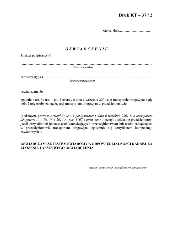 Druk KT – 37 / 2 Kielce, dnia...................................... OŚWIADCZENIE Ja niżej podpisany(-a): ....................................................................................................................................................... (imię i nazwisko) zamieszkały(-a) ......................................................................................................................... (adres zamieszkania) oświadczam, że: zgodnie z art. 5c ust. 1 pkt 2 ustawy z dnia 6 września 2001 r. o transporcie drogowym będę pełnić rolę osoby zarządzającej transportem drogowym w przedsiębiorstwie (podstawna prawna: Artykuł 5c ust. 1 pkt 2 ustawy z dnia 6 września 2001 r. o transporcie drogowym (t. j. Dz. U. z 2016 r., poz. 1907 z późn. zm.) „licencji udziela się przedsiębiorcy, jeżeli przynajmniej jedna z osób zarządzających przedsiębiorstwem lub osoba zarządzająca w przedsiębiorstwie transportem drogowym legitymuje się certyfikatem kompetencji zawodowych”). OŚWIADCZAM, ŻE JESTEM ŚWIADOMY/A ODPOWIEDZIALNOŚCI KARNEJ ZA ZŁOŻENIE FAŁSZYWEGO OŚWIADCZENIA. ................................................................................. (czytelny podpis osoby zarządzającej transportem)