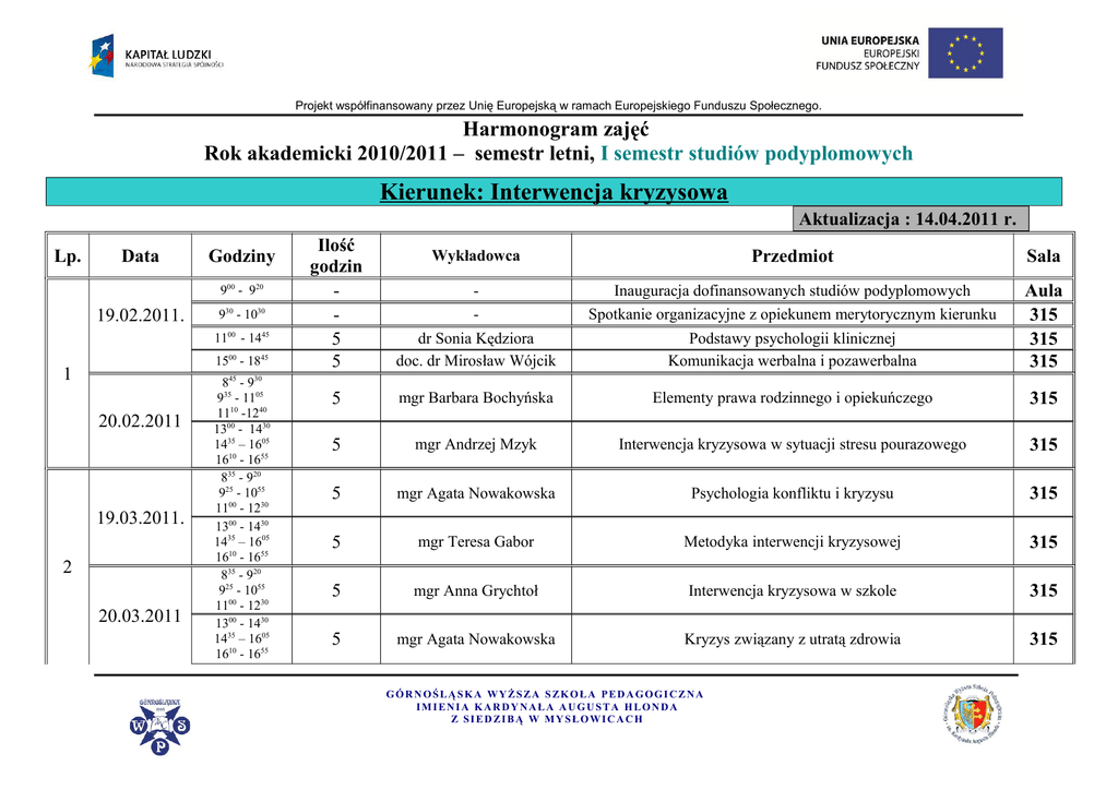 Projekt współfinansowany przez Unię Europejską w ramach Europejskiego Funduszu Społecznego. Harmonogram zajęć Rok akademicki 2010/2011 – semestr letni, I semestr studiów podyplomowych Kierunek: Interwencja kryzysowa Aktualizacja : 14.04.2011 r. Lp. Data Godziny 900 - 920 19.02.2011. 930 - 1030 00 45 00 45 11 - 14 15 - 18 1 20.02.2011 19.03.2011. 2 20.03.2011 845 - 930 935 - 1105 1110 -1240 1300 - 1430 1435 – 1605 1610 - 1655 835 - 920 925 - 1055 1100 - 1230 1300 - 1430 1435 – 1605 1610 - 1655 835 - 920 925 - 1055 1100 - 1230 1300 - 1430 1435 – 1605 1610 - 1655 Ilość godzin 5 5 Wykładowca Przedmiot Sala - Inauguracja dofinansowanych studiów podyplomowych - Spotkanie organizacyjne z opiekunem merytorycznym kierunku dr Sonia Kędziora doc. dr Mirosław Wójcik Podstawy psychologii klinicznej Komunikacja werbalna i pozawerbalna Aula 315 315 315 5 mgr Barbara Bochyńska Elementy prawa rodzinnego i opiekuńczego 315 5 mgr Andrzej Mzyk Interwencja kryzysowa w sytuacji stresu pourazowego 315 5 mgr Agata Nowakowska Psychologia konfliktu i kryzysu 315 5 mgr Teresa Gabor Metodyka interwencji kryzysowej 315 5 mgr Anna Grychtoł Interwencja kryzysowa w szkole 315 5 mgr Agata Nowakowska Kryzys związany z utratą zdrowia 315 GÓRNOŚLĄSKA WYŻSZA SZKOŁA PEDAGOGICZNA IMIENIA KARDYNAŁA AUGUSTA HLONDA Z SIEDZIBĄ W MYSŁOWICACH Projekt współfinansowany przez Unię Europejską w ramach Europejskiego Funduszu Społecznego. 35 16.04.2011. 3 17.04.2011 28.05.2011. 4 29.05.2011 5 11.06.2011. 20 8 -9 925 - 1055 1100 - 1230 1300 - 1430 1435 – 1605 1610 - 1655 835 - 920 925 - 1055 1100 - 1230 1300 - 1430 1435 – 1605 1610 - 1655 835 - 920 925 - 1055 1100 - 1230 1300 - 1430 1435 – 1605 1610 - 1655 5 mgr Andrzej Mzyk Interwencja kryzysowa w sytuacji stresu pourazowego 315 5 mgr Agata Nowakowska Kryzys wieku średniego 315 5 doc. dr Mirosław Wójcik Komunikacja werbalna i pozawerbalna 315 5 mgr Teresa Gabor Metodyka interwencji kryzysowej 315 5 mgr Anna Grychtoł Interwencja kryzysowa w szkole 315 5 mgr Barbara Bochyńska Elementy prawa rodzinnego i opiekuńczego 315 835 - 920 925 - 1055 1100 - 1230 5 doc. dr Mirosław Wójcik Komunikacja werbalna i pozawerbalna 315 1300 - 1430 1435 – 1605 1610 - 1655 5 mgr Agata Nowakowska Psychologia konfliktu i kryzysu 315 835 - 920 925 - 1055 1100 - 1230 5 mgr Agata Nowakowska Kryzys związany z utratą zdrowia 315 1300 - 1430 1435 – 1605 1610 - 1655 5 mgr Agata Nowakowska Kryzys wieku średniego 315 GÓRNOŚLĄSKA WYŻSZA SZKOŁA PEDAGOGICZNA IMIENIA KARDYNAŁA AUGUSTA HLONDA Z SIEDZIBĄ W MYSŁOWICACH Projekt współfinansowany przez Unię Europejską w ramach Europejskiego Funduszu Społecznego. 35 12.06.2011. 25.06.2011. 6 26.06.2011. 09.07.2011. 7 10.07.2011. 20 8 -9 925 - 1055 1100 - 1230 1300 - 1430 1435 – 1605 1610 - 1655 835 - 920 925 - 1055 1100 - 1230 1300 - 1430 1435 – 1605 1610 - 1655 835 - 920 925 - 1055 1100 - 1230 1300 - 1430 1435 – 1605 1610 - 1655 835 - 920 925 - 1055 1100 - 1230 1300 - 1430 1435 – 1605 1610 - 1655 835 - 920 925 - 1055 1100 - 1230 1300 - 1430 1435 – 1605 1610 - 1655 5 mgr Barbara Bochyńska Elementy prawa rodzinnego i opiekuńczego 315 5 mgr Teresa Gabor Metodyka interwencji kryzysowej 315 5 mgr Teresa Gabor Metodyka interwencji kryzysowej 315 5 dr Sonia Kędziora Podstawy psychologii klinicznej 315 5 mgr Teresa Gabor Metodyka interwencji kryzysowej 315 - - - 5 mgr Anna Grychtoł Interwencja kryzysowa w szkole 315 5 mgr Barbara Bochyńska Elementy prawa rodzinnego i opiekuńczego 315 5 mgr Andrzej Mzyk Interwencja kryzysowa w sytuacji stresu pourazowego 315 - - - Organizatorzy projektu zastrzegają sobie prawo do zmiany kolejności realizowanych modułów. GÓRNOŚLĄSKA WYŻSZA SZKOŁA PEDAGOGICZNA IMIENIA KARDYNAŁA AUGUSTA HLONDA Z SIEDZIBĄ W MYSŁOWICACH