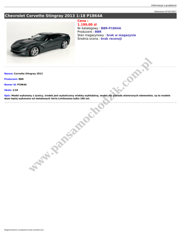 Informacje o produkcie Utworzono 07-03-2017 Chevrolet Corvette Stingray 2013 1:18 P1864A Cena : 1.199,00 zł om .p l Nr katalogowy : BBR-P1864A Producent : BBR Stan magazynowy : brak w magazynie Średnia ocena : brak recenzji Nazwa: Corvette Stingray 2013 Producent: BBR .c Numer id: P1864A dz ik Skala: 1/18 w w w .p an sa m oc ho Opis: Model wykonany z żywicy, środek jest wykończony miekką wykładziną, model nie posiada otwieranych elementów, są to modele duzo lepiej wykonane od metalowych Seria Limitowana tylko 100 szt. Wygenerowano w programie www.oscGold.com