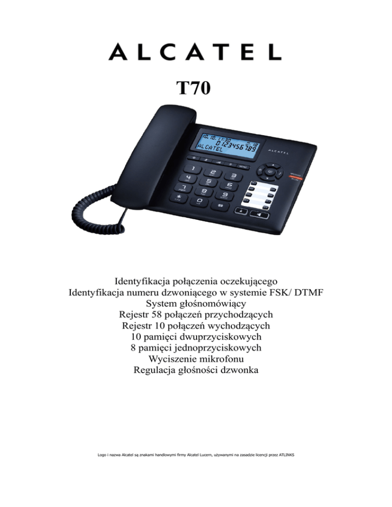 T70 Identyfikacja połączenia oczekującego Identyfikacja numeru dzwoniącego w systemie FSK/ DTMF System głośnomówiący Rejestr 58 połączeń przychodzących Rejestr 10 połączeń wychodzących 10 pamięci dwuprzyciskowych 8 pamięci jednoprzyciskowych Wyciszenie mikrofonu Regulacja głośności dzwonka Logo i nazwa Alcatel są znakami handlowymi firmy Alcatel Lucern, używanymi na zasadzie licencji przez ATLINKS
