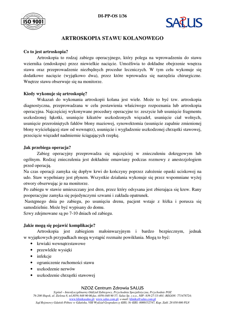 DI-PP-OS 1/36 ARTROSKOPIA STAWU KOLANOWEGO Co to jest artroskopia? Artroskopia to rodzaj zabiegu operacyjnego, który polega na wprowadzeniu do stawu wziernika (endoskopu) przez niewielkie nacięcie. Umożliwia to dokładne obejrzenie wnętrza stawu oraz przeprowadzenie niezbędnych procedur leczniczych. W tym celu wykonuje się dodatkowe nacięcie (wyjątkowo dwa), przez które wprowadza się narzędzia chirurgiczne. Wnętrze stawu obserwuje się na monitorze. Kiedy wykonuje się artroskopię? Wskazań do wykonania artroskopii kolana jest wiele. Może to być tzw. artroskopia diagnostyczna, przeprowadzana w celu postawienia właściwego rozpoznania lub artroskopia operacyjna. Najczęściej wykonywane procedury operacyjne to: zeszycie lub usunięcie fragmentu uszkodzonej łąkotki, usunięcie kikutów uszkodzonych więzadeł, usunięcie ciał wolnych, usunięcie przerośniętych fałdów błony maziowej, synowektomia (usunięcie zapalnie zmienionej błony wyściełającej staw od wewnątrz), usunięcie i wygładzenie uszkodzonej chrząstki stawowej, przecięcie więzadeł nadmiernie ściągających rzepkę. Jak przebiega operacja? Zabieg operacyjny przeprowadza się najczęściej w znieczuleniu dokręgowym lub ogólnym. Rodzaj znieczulenia jest dokładnie omawiany podczas rozmowy z anestezjologiem przed operacją. Na czas operacji zamyka się dopływ krwi do kończyny poprzez założenie opaski uciskowej na udo. Staw wypełniany jest płynem. Wszystkie działania wykonuje się przez wspomniane wyżej otwory obserwując je na monitorze. Po zabiegu w stawie umieszczany jest dren, przez który odsysana jest zbierająca się krew. Rany pooperacyjne zamyka się pojedynczymi szwami i zakłada opatrunek. Następnego dnia po zabiegu, po usunięciu drenu, pacjent wstaje z łóżka i porusza się samodzielnie. Może być wypisany do domu. Szwy zdejmowane są po 7-10 dniach od zabiegu. Jakie mogą się pojawić komplikacje? Artroskopia jest zabiegiem małoinwazyjnym i bardzo bezpiecznym, w wyjątkowych przypadkach mogą wystąpić rozmaite powikłania. Mogą to być: • krwiaki wewnątrzstawowe • przewlekłe wysięki • infekcje • ograniczenie ruchomości stawu • uszkodzenie nerwów • uszkodzenie chrząstki stawowej jednak NZOZ Centrum Zdrowia SALUS Szpital – Interdyscyplinarny Oddział Zabiegowy, Przychodnia Specjalistyczna, Przychodnie POZ 76-200 Słupsk, ul. Zielona 8, tel./059) 848 90 00,fax. (059) 848 90 57; Salus Sp. z o.o., NIP: 839-27-53-401; REGON: 771478724; www.klinikasalus.pl; www.salus.com.pl; e-mail: [email protected] Sąd Rejonowy Gdańsk-Północ w Gdańsku, VIII Wydział Gospodarczy KRS; Nr KRS: 0000152747, Kap. Zakł. 28 050 000 PLN DI-PP-OS 1/36 • • • • odczyny na zastosowane implanty zakrzepica żylna zatorowość płucna inne nie dające się przewidzieć powikłania Jak się przygotować do operacji? Jeżeli chorujesz na schorzenia takie jak cukrzyca, nadciśnienie tętnicze, choroba wieńcowa, zaburzenia rytmu serca, alergie lub jeśli przyjmujesz leki zmniejszające krzepliwość krwi (aspiryna, acard, polocard, acenokumarol, sintrom, Wargin) poinformuj o tym swojego chirurga i zgłoś się do swojego lekarza rodzinnego w celu odpowiedniego przygotowania do operacji. Jeśli cierpisz na próchnicę zębów – zgłoś się do dentysty i wylecz je odpowiednio wcześniej. W przypadku stosowania na stałe leków – zabierz je ze sobą do szpitala w oryginalnych opakowaniach Ostatni posiłek powinien być zjedzony najdalej sześć godzin przed operacją. Do szpitala prosimy zabrać ze sobą skierowanie na operację i dowód ubezpieczenia (nie obowiązuje w przypadku operacji opłacanych prywatnie). W dniu zabiegu pacjent powinien wykonać dokładną poranną toaletę (kąpiel lub prysznic) całego ciała. W wyznaczonym dniu, zazwyczaj kilka dni przed zabiegiem odbędzie się rozmowa z anestezjologiem, podczas której zostanie ustalony sposób znieczulenia. Tego samego dnia pielęgniarka pobierze krew do badań niezbędnych do operacji. Gdzie zgłosić się w dniu operacji? W dniu operacji prosimy zgłosić się z niezbędnymi dokumentami (skierowanie na operację, podpisana zgoda na operację, dowód ubezpieczenia, wykonane wcześniej zdjęcia RTG i inne badania) do Izby Przyjęć. Po przyjęciu do szpitala będzie można jeszcze raz porozmawiać z ortopedą-operatorem oraz z anestezjologiem i zadać im ewentualne pytania. Pobyt w szpitalu po operacji Po zabiegu pacjentami opiekuje się pielęgniarka dyżurna, do niej należ zwracać się w przypadku dolegliwości, chęci wstania z łóżka itp. Ponadto w Oddziale szpitalnym jest lekarz dyżurny, który interweniuje w nagłych przypadkach. W większości wypadków po zabiegu można pić niegazowane płyny bezpośrednio po powrocie do łóżka, jeść po kilku godzinach. Zawsze należy upewnić się pytając pielęgniarki dyżurnej. Po całkowitym ustąpieniu znieczulenia można również, w razie potrzeby przejść z pomocą pielęgniarki do toalety. Chodzić należy najlepiej o kulach, nie zginając nogi w kolanie. Następnego dnia po operacji odbywa się wizyta ortopedy-operatora, zmienia się opatrunki i podejmuje decyzję o usunięciu drenu i wypisie do domu. Przy wypisie pacjent otrzymuje kartę informacyjną, receptę na potrzebne leki, dodatkowe ustne zalecenia operatora oraz w razie potrzeby zwolnienie z pracy. Ma też wyznaczony termin kontrolnej wizyty u lekarza, który go operował. NZOZ Centrum Zdrowia SALUS Szpital – Interdyscyplinarny Oddział Zabiegowy, Przychodnia Specjalistyczna, Przychodnie POZ 76-200 Słupsk, ul. Zielona 8, tel./059) 848 90 00,fax. (059) 848 90 57; Salus Sp. z o.o., NIP: 839-27-53-401; REGON: 771478724; www.klinikasalus.pl; www.salus.com.pl; e-mail: [email protected] Sąd Rejonowy Gdańsk-Północ w Gdańsku, VIII Wydział Gospodarczy KRS; Nr KRS: 0000152747, Kap. Zakł. 28 050 000 PLN DI-PP-OS 1/36 UWAGA! Pierwszy spacer po zabiegu powinien odbyć się pod opieką pielę