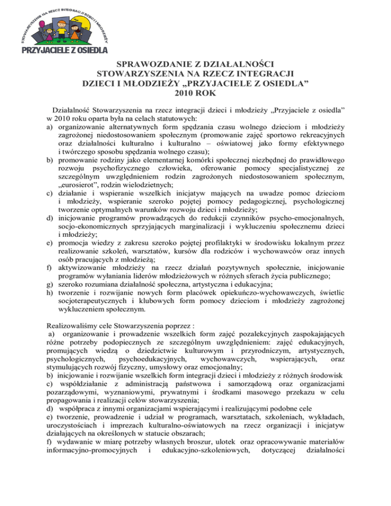 SPRAWOZDANIE Z DZIAŁALNOŚCI STOWARZYSZENIA NA RZECZ INTEGRACJI DZIECI I MŁODZIEŻY „PRZYJACIELE Z OSIEDLA” 2010 ROK Działalność Stowarzyszenia na rzecz integracji dzieci i młodzieży „Przyjaciele z osiedla” w 2010 roku oparta była na celach statutowych: a) organizowanie alternatywnych form spędzania czasu wolnego dzieciom i młodzieży zagrożonej niedostosowaniem społecznym (promowanie zajęć sportowo rekreacyjnych oraz działalności kulturalno i kulturalno – oświatowej jako formy efektywnego i twórczego sposobu spędzania wolnego czasu); b) promowanie rodziny jako elementarnej komórki społecznej niezbędnej do prawidłowego rozwoju psychofizycznego człowieka, oferowanie pomocy specjalistycznej ze szczególnym uwzględnieniem rodzin zagrożonych niedostosowaniem społecznym, „eurosierot”, rodzin wielodzietnych; c) działanie i wspieranie wszelkich inicjatyw mających na uwadze pomoc dzieciom i młodzieży, wspieranie szeroko pojętej pomocy pedagogicznej, psychologicznej tworzenie optymalnych warunków rozwoju dzieci i młodzieży; d) inicjowanie programów prowadzących do redukcji czynników psycho-emocjonalnych, socjo-ekonomicznych sprzyjających marginalizacji i wykluczeniu społecznemu dzieci i młodzieży; e) promocja wiedzy z zakresu szeroko pojętej profilaktyki w środowisku lokalnym przez realizowanie szkoleń, warsztatów, kursów dla rodziców i wychowawców oraz innych osób pracujących z młodzieżą; f) aktywizowanie młodzieży na rzecz działań pozytywnych społecznie, inicjowanie programów wyłaniania liderów młodzieżowych w różnych sferach życia publicznego; g) szeroko rozumiana działalność społeczna, artystyczna i edukacyjna; h) tworzenie i rozwijanie nowych form placówek opiekuńczo-wychowawczych, świetlic socjoterapeutycznych i klubowych form pomocy dzieciom i młodzieży zagrożonej wykluczeniem społecznym. Realizowaliśmy cele Stowarzyszenia poprzez : a) organizowanie i prowadzenie wszelkich form zajęć pozalekcyjnych zaspokajających różne potrzeby podopiecznych ze szczególnym uwzględnieniem: zajęć edukacyjnych, promujących wiedzą o dziedzictwie kulturowym i przyrodniczym, artystycznych, psychologicznych, psychoedukacyjnych, wychowawczych, wspierających, oraz stymulujących rozwój fizyczny, umysłowy oraz emocjonalny; b) inicjowanie i rozwijanie wszelkich form integracji dzieci i młodzieży z różnych środowisk c) współdziałanie z administracją państwowa i samorządową oraz organizacjami pozarządowymi, wyznaniowymi, prywatnymi i środkami masowego przekazu w celu propagowania i realizacji celów stowarzyszenia; d) współpraca z innymi organizacjami wspierającymi i realizującymi podobne cele e) tworzenie, prowadzenie i udział w programach, warsztatach, szkoleniach, wykładach, uroczystościach i imprezach kulturalno-oświatowych na rzecz organizacji i inicjatyw działających na określonych w statucie obszarach; f) wydawanie w miarę potrzeby własnych broszur, ulotek oraz opracowywanie materiałów informacyjno-promocyjnych i edukacyjno-szkoleniowych, dotyczącej działalności stowarzyszenia oraz i organizacjom. udostępnianie ich zainteresowanym placówkom, instytucjom W 2010 roku współpracowaliśmy z: Departamentem Spraw Społecznych Urząd Miasta Białystok Departamentem Strategii i Rozwoju UM Biurem Sportu i Rekreacji UM Komendą Wojewódzką Policji w Białymstoku Komendą Miejską Policji w Białymstoku Fundacją „Pomóż im” Oddziałem Caritas Białystok Lokalnym programem pomocy społecznej „Wychowawca Podwórkowy” Jagiellonia - Białystok Sportową Spółką Akcyjną MOSIR Białystok Firmą Sportową „Kaja” Firmą Fastguad Centrum Przygód Grupą „SZCZĘŚCIARY” ze Stowarzyszenia Kontakt Miast Białystok-Eindhoven (SKMBE). szkoły podstawowe, gimnazjalne i ponadgimnazjalne miasta Białegostoku organizacje pozarządowe i wolontariat Odbiorcami działań Stowarzyszenia były: dzieci i młodzież z białostockich osiedli mieszkaniowych, szkół i instytucji. W 2010 roku przygotowaliśmy i przeprowadziliśmy kilka imprez dla dzieci i młodzieży, współorganizowaliśmy też imprezy ze społecznościami lokalnymi, fundacjami, szpitalami i instytucjami. Wraz z Wojewódzką Komendą Policji i Miejską Komendą Policji w Białymstoku współorganizowaliśmy imprezy: Akcję „Bezpieczne Ferie” 2010; 13.06.2010 wraz z KMP i UM przygotowaliśmy imprezę „Otwarcie wakacji” na terenie Galerii M 11.09.2010 odbyły się Targi Profilaktyczne ”Znajdź czas dla swojego dziecka” w których udział wzięło nasze stowarzyszenie. Członkowie przygotowali stoisko plastyczne, gry i zabawy na świeżym powietrzu, konkursy, zawody sportowe (mini mecze unii hokeja); W miesiącu czerwcu członkowie Stowarzyszenia prowadzili wiele imprez z okazji Dnia Dziecka i Dnia Rodziny, Święta Szkoły m.in.: w Dziecięcym Szpitalu Klinicznym, Niepublicznej Szkole św.św. Cyryla i Metodego, Szkole Podstawowej nr 31 w Białymstoku. 1 lipca 2010r. na Placu Miejskim odbyła się impreza integracyjna dla najmłodszych mieszkańców naszego miasta. Członkowie Stowarzyszenia wraz z wychowawcami podwórkowymi przygotowali liczne zabawy, konkurencje sportowe, gry indywidualne i zespołowe, zajęcia plastyczne. W imprezie wzięły udział dzieci i młodzież, jak również wszystkie osoby które przyszły w tym dniu na plac pod Ratuszem (ok. 200 osób). 24.08.2010r. w godz. 11.00 – 15.00 na Placu Miejskim odbyła się impreza plenerowa „Wakacyjny uśmiech” współorganizowana przez Stowarzyszenie na rzecz integracji dzieci i młodzieży „Przyjaciele z osiedla”. W imprezie wzięli też udział funkcjonariusze Komendy Miejskiej Policji, którzy informowali dzieci i ich opiekunów o zasadach bezpieczeństwa podczas wypoczynku nad wodą, w lesie, rozdali ulotki informacyjne. Centrum Przygód przygotowało pokaz rowerów trikke i Segway dla dzieci. Firma FASTQUAD zapewniła oprawę muzyczną