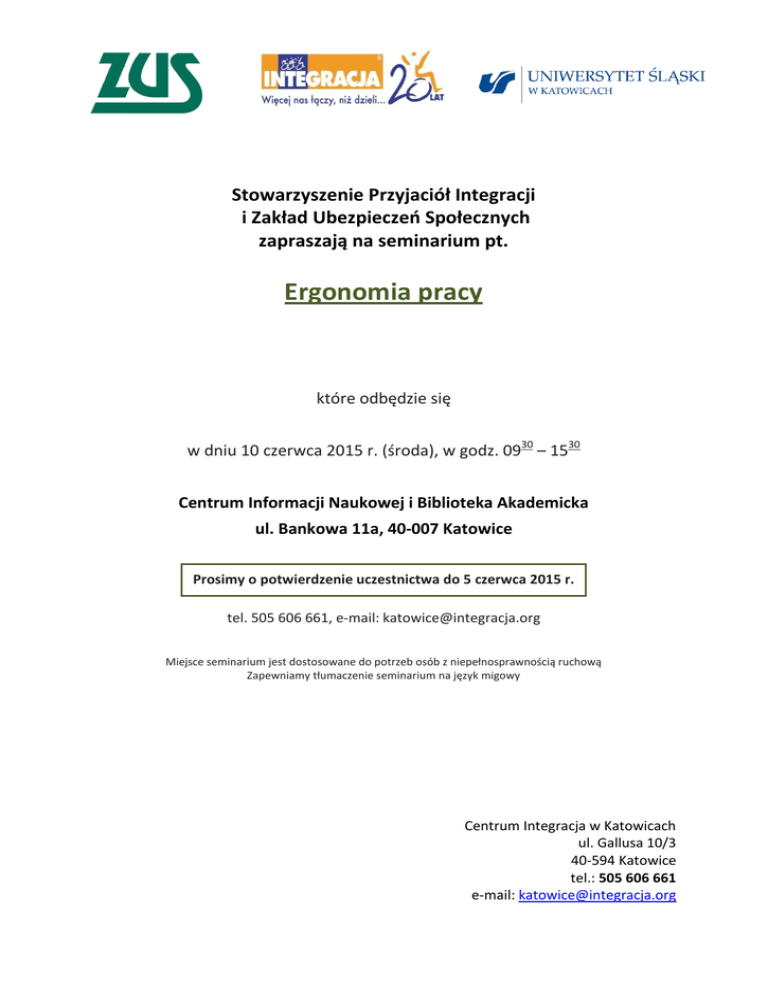 Stowarzyszenie Przyjaciół Integracji i Zakład Ubezpieczeń Społecznych zapraszają na seminarium pt. Ergonomia pracy które odbędzie się w dniu 10 czerwca 2015 r. (środa), w godz. 0930 – 1530 Centrum Informacji Naukowej i Biblioteka Akademicka ul. Bankowa 11a, 40-007 Katowice Prosimy o potwierdzenie uczestnictwa do 5 czerwca 2015 r. tel. 505 606 661, e-mail: [email protected] Miejsce seminarium jest dostosowane do potrzeb osób z niepełnosprawnością ruchową Zapewniamy tłumaczenie seminarium na język migowy Centrum Integracja w Katowicach ul. Gallusa 10/3 40-594 Katowice tel.: 505 606 661 e-mail: [email protected]