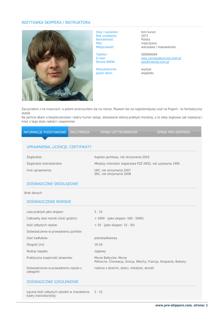 WIZYTóWKA SKIPPERA / INSTRUKTORA Imię i nazwisko: Rok urodzenia: Narodowość: Płeć: Miejscowość: tom kuran 1971 Polska mężczyzna warszawa / mazowieckie Telefon: E-mail: Strona WWW: 509094044 [email protected] sztukmistrze.com.pl Wykształcenie: Języki obce: wyższe angielski Zaczynałem z na mazurach, a potem przerzuciłem się na morze. Pływam też na najpiekniejszej czyli na Pogorii - to fantastyczny statek Na jachcie dbam o bezpieczenstwo i dobry humor zalogi, stosowanie dobrej praktyki morskiej, o to żeby żeglowac jak najwięcej i mieć z tego dużo radości i wspomnien INFORMACJE PODSTAWOWE MULTIMEDIA OPINIE UŻYTKOWNIKÓW OPINIE PRO-SKIPPERS UPRAWNIENIA, LICENCJE, CERTYFIKATY Żeglarskie: Kapitan jachtowy, rok otrzymania 2010 Żeglarskie instruktorskie: Młodszy instruktor żeglarstwa PZŻ (MIŻ), rok uzyskania 1995 Inne uprawnienia: UKF, rok otrzymania 2007 SRC, rok otrzymania 2008 DOŚWIADCZNIE ŚRÓDLĄDOWE Brak danych DOŚWIADCZENIE MORSKIE Lata praktyki jako skipper: 5 - 10 Całkowity staż morski (ilość godzin): > 5000 (jako skipper: 500 - 5000) Ilość odbytych rejsów: > 50 (jako skipper: 10 - 50) Doświadczenie w prowadzeniu jachtów: Ilość kadłubów: jednokadłubowy Długość [m]: 16-24 Rodzaj napędu: żaglowy Praktyczna znajomość akwenów: Morze Bałtyckie, Morze Północne, Chorwacja, Grecja, Włochy, Francja, Hiszpania, Baleary Doświadczenie w prowadzeniu rejsów z załogami: rodzina z dziećmi, dzieci, młodzież, dorośli DOŚWIADCZNIE SZKOLENIOWE Łączna ilość odbytych szkoleń w charakterze kadry instruktorskiej: 5 - 15 www.pro-skippers.com, strona: 1 W tym w ostatnich 5 latach: <5 Pełnione funkcje szkoleniowe: instruktor DOŚWIADCZENIE REGATOWE Brak danych www.pro-skippers.com, strona: 2