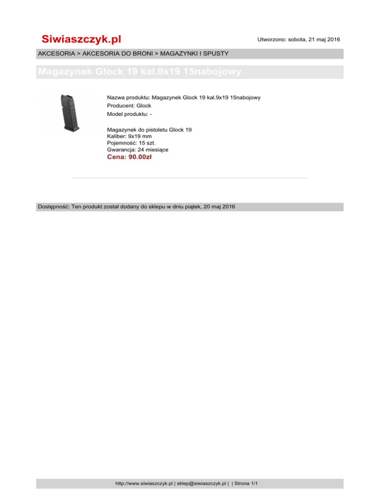 Siwiaszczyk.pl Utworzono: sobota, 21 maj 2016 AKCESORIA > AKCESORIA DO BRONI > MAGAZYNKI I SPUSTY Magazynek Glock 19 kal.9x19 15nabojowy Nazwa produktu: Magazynek Glock 19 kal.9x19 15nabojowy Producent: Glock Model produktu: Magazynek do pistoletu Glock 19 Kaliber: 9x19 mm Pojemność: 15 szt. Gwarancja: 24 miesiące Cena: 90.00zł Dostępność: Ten produkt został dodany do sklepu w dniu piątek, 20 maj 2016 http://www.siwiaszczyk.pl | [email protected] | | Strona 1/1