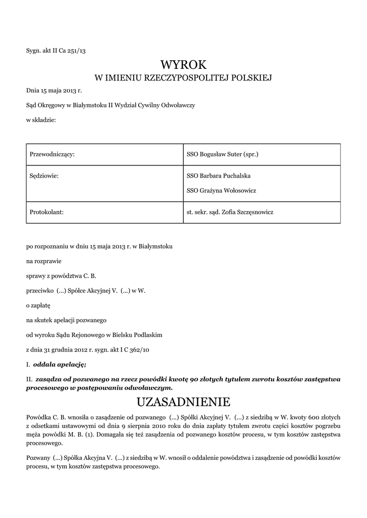 Sygn. akt II Ca 251/13 WYROK W IMIENIU RZECZYPOSPOLITEJ POLSKIEJ Dnia 15 maja 2013 r. Sąd Okręgowy w Białymstoku II Wydział Cywilny Odwoławczy w składzie: Przewodniczący: SSO Bogusław Suter (spr.) Sędziowie: SSO Barbara Puchalska SSO Grażyna Wołosowicz Protokolant: st. sekr. sąd. Zofia Szczęsnowicz po rozpoznaniu w dniu 15 maja 2013 r. w Białymstoku na rozprawie sprawy z powództwa C. B. przeciwko (...) Spółce Akcyjnej V. (...) w W. o zapłatę na skutek apelacji pozwanego od wyroku Sądu Rejonowego w Bielsku Podlaskim z dnia 31 grudnia 2012 r. sygn. akt I C 362/10 I. oddala apelację; II. zasądza od pozwanego na rzecz powódki kwotę 90 złotych tytułem zwrotu kosztów zastępstwa procesowego w postępowaniu odwoławczym. UZASADNIENIE Powódka C. B. wnosiła o zasądzenie od pozwanego (...) Spółki Akcyjnej V. (...) z siedzibą w W. kwoty 600 złotych z odsetkami ustawowymi od dnia 9 sierpnia 2010 roku do dnia zapłaty tytułem zwrotu części kosztów pogrzebu męża powódki M. B. (1). Domagała się też zasądzenia od pozwanego kosztów procesu, w tym kosztów zastępstwa procesowego. Pozwany (...) Spółka Akcyjna V. (...) z siedzibą w W. wnosił o oddalenie powództwa i zasądzenie od powódki kosztów procesu, w tym kosztów zastępstwa procesowego. Wyrokiem z dnia 31 grudnia 2012 roku Sąd Rejonowy w Bielsku Podlaskim uwzględnił powództwo w całości i obciążył pozwanego nieuiszczonymi kosztami sądowymi i kosztami procesu. Sąd Rejonowy ustalił, że w dniu 27 października 2006 roku doszło do wypadku komunikacyjnego, w wyniku którego zmarł mąż powódki M. B. (1). Sprawcą tego wypadku był A. O.. Wyrokiem z dnia 2 marca 2007 roku w sprawie II K 37/07 Sąd Rejonowy w Bielsku Podlaskim uznał A. O. za winnego tego, że umyślnie naruszył zasady bezpieczeństwa w ruchu lądowym w ten sposób, że w warunkach całkowitej ciemności kierował ciągnikiem rolniczym marki U. (...) o nr rej. (...), z doczepionym do niego, nie posiadającym wymaganego przepisami oświetlenia, roztrząsaczem obornika, na skutek czego ten zespół pojazdów nie został dostrzeżony przez jadącego w tym samym kierunku M. B. (1), kierującego samochodem osobowym marki V. (...) o nr rej. (...), który uderzył w tył wymienionego roztrząsacza, doznając obrażeń ciała, w wyniku których nastąpił jego zgon, tj. czynu z art. 177 § 2 k.k. i za to skazał go i wymierzył karę pozbawienia wolności z warunkowym zawieszeniem jej wykonania. A. O. posiadał ubezpieczenie odpowiedzialności cywilnej posiadaczy pojazdów mechanicznych w pozwanym (...) Spółce Akcyjnej V. (...) z siedzibą w W.. Sąd I instancji ustalił też, że powódka zgłosiła szkodę pozwanemu. Pozwany co do zasady nie kwestionował swojej odpowiedzialności za skutki zdarzenia z dnia 27 października 2006 roku. W toku postępowania likwidacyjnego pozwany ustalił, że w związku ze śmiercią męża M. B. (1) powódka poniosła koszty postawienia pomnika w wysokości 8.540 złotych, koszty ubrania żałobnego jej, córki i zmarłego w wysokości 3.929,76 złotych, koszt poczęstunku w wysokości 2.400 złotych i inne koszty związane z pogrzebem w wysokości 3.474 złotych. Pozwany wypłacił powódce kwotę stanowiącą 30% wszystkich wydatków związanych z pogrzebem M. B. (1), uznając, że M. B. (1) w 70% przyczynił się do szkody. Sąd Rejonowy zaznaczył, że odpowiedzialność pozwanego za skutki zdarzenia z dnia 27 października 2006 roku znajduje potwierdzenie w art. 34 ust. 1 ustawy z dnia 22 maja 2003 roku o ubezpieczeniach obowiązkowych, Ubezpieczeniowym Funduszu Gwarancyjnym, Polskim Biurze Ubezpieczycieli Komunikacyjnych (Dz. U. Nr 124, poz. 1152 ze zm.) oraz art. 436 § 1 k.c. w zw. z art. 435 § 1 k.c., zaś roszczenie powódki o zwrot kosztów pogrzebu jej męża M. B. (1) ma oparcie w art. 446 § 1 k.c. Sąd I instancji stwierdził, że powódka nie udowodniła, iż poniosła wyższe koszty pogrzebu, niż to wynika z ustaleń pozwanego dokonanych w toku postępowania likwidacyjnego. Powódka nie przedstawiła żadnych dowodów dotyczących wysokości tych kosztów, powieliła jedynie dokumenty, które przedstawiła pozwanemu w czasie postępowania likwidacyjnego i które znajdują się w aktach szkody nr 241785/1. W ocenie Sądu Rejonowego twierdzenia powódki, iż pozwany pominął jakieś poniesione przez nią koszty są bezzasadne, zwłaszcza, że z pisma Parafii Prawosławnej Ś. Apostołów P. i P. w S. z dnia 28 grudnia 2010 roku wynika, że powódka opłaciła dwa miejsca grzebalne, z których wykorzystane jest tylko jedno. Sąd Rejonowy podzielił zatem stanowisko pozwanego, iż winien on zwrócić powódce jedynie połowę tej opłaty w kwocie 200 złotych. W konsekwencji Sąd I instancji uznał, że ustalenia pozwanego co do wysokości kosztów pogrzebu M. B. (1) są prawidłowe. Ustalenia te znajdują bowiem potwierdzenie w rachunkach i fakturach złożonych przez powódkę. W dalszej kolejności Sąd I instancji odniósł się do kwestii przyczynienia się M. B. (1) do szkody. Zaznaczył, że z opinii Laboratorium Kryminalistycznego Komendy Wojewódzkiej Policji w B. znajdującej się w aktach II K 37/07 Sądu Rejonowego w Bielsku Podlaskim wynika, że M. B. (1) nie miał możliwości uniknięcia wypadku i to A. O. jadąc zespołem pojazdów w porze nocnej bez sprawnej instalacji elektrycznej spowodował sytuację niebezpieczną prowadzącą do wypadku. Jednocześnie Sąd I instancji podkreślił, że w toku postępowania karnego ustalono, że M. B. (1) znajdował się w stanie nietrzeźwości – 2,2 promila alkoholu we krwi, a obrażenia ciała jakich doznał nie wskazywały na użycie przez niego pasów bezpieczeństwa. Jako, że w toku postępowania karnego Sąd Rejonowy w Bielsku Podlaskim skupiał się na ocenie zachowania oskarżonego A. O. i nie analizował szczegółowo zachowania M. B. (1) Sąd I instancji przychylił się do wniosku stron o powołanie biegłyc