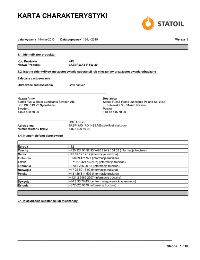 KARTA CHARAKTERYSTYKI data wydania 19-mar-2013 Data poprawek 16-lut-2015 Wersja 1 1.1. Identyfikator produktu Kod Produktu Nazwa Produktu 749 LAZERWAY F 5W-30 1.2. Istotne zidentyfikowane zastosowania substancji lub mieszaniny oraz zastosowania odradzane Zalecane zastosowanie Odradzane zastosowania Brak danych Nazwa firmy Statoil Fuel & Retail Lubricants Sweden AB, Box 194, 149 22 Nynäshamn, Sweden, +46 8 429 60 00 Adres e-mail Numer telefonu firmy: Dostawca Statoil Fuel & Retail Lubricants Poland Sp. z o.o ul. Lublanska 38, 31-476 Kraków, Polska +48 12 415 70 00 HSE Advisor [email protected] +46 8 429 60 00 1.4. Numer telefonu alarmowego Europa Czechy Dania Finlandia Latvia Lithuania Norwegia Polska Szwecja Estonia 112 +420 224 91 92 93/+420 224 91 54 02 (informacje trucizna) +45 82 12 12 12 (informacje trucizna) +358 09 471 977 (informacje trucizna) +371 67042473 (24 h) (informacje trucizna) +370 5 236 20 52 (informacje trucizna) +47 22 59 13 00 (informacje trucizna) +48 426 314 502 (informacje trucizna) + 421 2 5465 2307 (informacje trucizna) +46 8 33 70 43 (centrum reagowania kryzysowego) +372 626 9379 (informacje trucizna) 2.1. Klasyfikacja substancji lub mieszaniny _____________________________________________________________________________________ Strona 1 / 10 Data poprawek 16-lut-2015 LAZERWAY F 5W-30 _____________________________________________________________________________________ 2.2. Elementy etykiety Brak danych 3.1 Substancje Nazwa chemiczna parafinowe, traktowane wodorem (ropa naftowa) Bis(nonylofenylo)amin a Nr EC Nr CAS % wagowy Klasyfikacja Nr 1272/2008 [CLP] Numer rejestracyjny REACH Asp. Tox. 1 (H304) 01-2119484627-25 Aquatic Chronic 4 (H413) 01-2119488911-28 265-157-1 64742-54-7 60-80% dyrektywy 67/548//EWG ; 1999/45/WE - 253-249-4 36878-20-3 1-5% R53 Porada ogólna Kontakt z oczami Wdychanie pierwszej pomocy Objawy: _____________________________________________________________________________________ Strona 2 / 10 LAZERWAY F 5W-30 Data poprawek 16-lut-2015 _____________________________________________________________________________________ Uwaga dla lekarzy 6.4.Odniesienia do innych sekcji INNE INFORMACJE Patrz Sekcja 12: INFORMACJE EKOLOGICZNE. _____________________________________________________________________________________ Data poprawek 16-lut-2015 LAZERWAY F 5W-30 _____________________________________________________________________________________ Warunki przechowywania Konkretne zastosowania Nazwa chemiczna Mg³a olejowa/dym Nazwa chemiczna Mg³a olejowa/dym Nazwa chemiczna Mg³a olejowa/dym Nazwa chemiczna parafinowe, traktowane wodorem (ropa naftowa) Nazwa chemiczna Szwecja NGV 8 h: 1 mg/m³, KTV 15 min: 3 mg/m³ 8 h: 5 mg/m³ parafinowe, traktowane wodorem (ropa naftowa) Norwegia 8h: 1 mg/m³ Finlandia 8h: 5 mg/m³ Estonia TWA 8h: 1 mg/m³ Litwa IPRV 8h: 1 mg/m³, TPRV 15 min: 3 mg/m³ Polska NDS: 5 mg/m³, NDSCh, 15 min, 10 mg/m³ Rosja 5 mg/m³ 8h: 5 mg/m³ Niemcy - - - Ukraina - Dania 8h: 1 mg/m³ Norwegia 8 h: 1 mg/m³ Finlandia 8h: 5 mg/m³ Estonia TWA 8h: 1 mg/m³ Litwa IPRV 8h: 1 mg/m³, TPRV 15 min: 3 mg/m³ Polska NDS: 5 mg/m³, NDSCh, 15 min, 10 mg/m³ Rosja 5 mg/m3 8h: 5 mg/m³ - - Ukraina - Czechy PEL: 5 mg/m³ NPK-P: 10 mg/m³ Szwecja NGV 8 h: 1 mg/m³, KTV 15 min: 3 mg/m³ 8 h: 5 mg/m³ parafinowe, traktowane wodorem (ropa naftowa) Nazwa chemiczna Dania 8h: 1 mg/m³ Czechy PEL: 5 mg/m³ NPK-P: 10 mg/m³ Niemcy - Brak danych zmian (DNEL) Brak danych. (PNEC) Ochrona oczu/twarzy _____________________________________________________________________________________ Strona 4 / 10 Data poprawek 16-lut-2015 LAZERWAY F 5W-30 _____________________________________________________________________________________ Ochrona dróg oddechowych stan skupienia przejrzysty Zapach barwa zapachu: Uwagi Metoda nie dotyczy nie dotyczy Brak danych pH Boiling point/boiling range 233 °C ISO 2592 nie dotyczy nie dotyczy nie dotyczy nie dotyczy nie dotyczy < 0.01 nie dotyczy Brak danych zaniedbywalny rozpuszczalny w: Rozpuszczalnik >3 Brak danych Brak danych Viscosity at 40°C Typical Viscosity at 100°C Typical 9.2. Inne informacje 50.3 mm²/s 9.7 mm²/ ISO 3104 Olej nie dotyczy Data poprawek 16-lut-2015 LAZERWAY F 5W-30 _____________________________________________________________________________________ VOC Content(%) 852 kg/m³ Badawcza liczba oktanowa Sulphur Content Brak danych ISO 12185 Brak danych Nie dotyczy Nie dotyczy Nie reaktywny. Stabilny w normalnych warunkach. SEKCJA 11: Informacje toksykologiczne Informacje o produkcie Wdychanie oddechowego. Kontakt z oczami Brak znanych. _____________________________________________________________________________________ Strona 6 / 10 Data poprawek 16-lut-2015 LAZERWAY F 5W-30 _____________________________________________________________________________________ Brak znanych. oczu Uczulenie Brak znanych. Brak znanych. rozrodcze Brak znanych. Brak znanych. rozrodczego Brak znanych. Brak znanych. Brak znanych. docelowych - jednorazowy kontakt Brak znanych. docelowych - wielokrotny kontakt Brak znanych. Brak znanych. Brak znanych. SEKCJA 12: Informacje ekologiczne Nazwa chemiczna traktowane wodorem (ropa naftowa) Bis(nonylofenylo)amina Ryby Skorupiaki 5000: 96 h Oncorhynchus mykiss 1000: 48 h Daphnia magna mg/L mg/L LC50 EC50 1000: 96 h Pimephales promelas 14 - 28: 96 h Mysidopsis bahia mg/L mg/L LC50 semi-static LC50 Po uwolnieniu adsorbuje do gleby. Ten produkt nie jest, lub nie zawiera, substancji, która jest PBT lub vBvP. _____________________________________________________________________________________ Strona 7 / 10 LAZERWAY F 5W-30 Data poprawek 16-lut-2015 _____________________________________________________________________________________ / woda lub woda / powietrze 13.1. Metody unieszkodliwiania odpadów Metody unieszkodliwiania odpadów/ regionalnymi, krajowymi i miejscowymi. INNE INFORMACJE Klasyfikacja odpadów: bazowym. Informacja na temat przeznaczenia oleju bazowego podana jest w jego karcie 