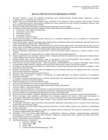 Załącznik nr 1 do zarządzenia nr 25/XII/2016 Dyrektora M-GOSiR w Piszu REGULAMIN PŁYWALNI MIEJSKIEJ W PISZU 1. 2. 3. 4. 5. 6. 7. 8. 9. 10. 11. 12. 13. 14. 15. 16. 17. 18. 19. 20. 21. 22. 23. 24. 25. 26. 27. 28. Pływalnia Miejska w Piszu jest obiektem zarządzanym przez Miejsko-Gminny Ośrodek Sportu i Rekreacji w Piszu, ul. Mickiewicza 2, 12-200 Pisz, tel. 87 423 28 23. Obiekt czynny jest od poniedziałku do piątku w godz. od 6.00 do 21.45, natomiast w soboty, niedziele i święta od godz. 10.00 do 17.45, z wyłączeniem przerw konserwacyjno-remontowych, awarii, przestojów oraz dni wolnych (zarządzający zastrzega sobie prawo zmiany godzin funkcjonowania obiektu). Na terenie całego obiektu funkcjonuje system monitoringu wizyjnego z zapisem ciągłym. Szczegółowe zasady użytkowania poszczególnych części obiektu określone są regulaminami i dotyczą: 1) korzystania z części ogólnej hali basenowej, 2) korzystania z sauny suchej, 3) korzystania z jacuzzi, 4) korzystania z siłowni, 5) korzystania z kortu tenisowego. Każda osoba korzystająca z obiektu powinna zapoznać się z niniejszym regulaminem oraz ze wszystkimi ww. regulaminami i bezwzględnie ich przestrzegać. Prawo do korzystania z pływalni posiadają grupy zorganizowane po dokonaniu opłaty lub po podpisaniu stosownej umowy oraz osoby indywidualne posiadające bilet wstępu lub karnet. Każda osoba korzystająca z pływalni otrzymuje kluczyk do szafki na pasku sylikonowym i zobowiązana jest do jego zwrotu na koniec pobytu. W przypadku uszkodzenia, zagubienia lub innych zdarzeń powodujących utratę kluczyka, użytkownik zobowiązany jest do zapłaty kwoty w wysokości równej wartości paska sylikonowego oraz kluczyka. Wszyscy użytkownicy zobowiązani są do korzystania z szatni na wierzchnią odzież i obuwie oraz z szafek na ubrania i rzeczy osobiste. Dzieci w wieku poniżej lat 7 mogą przebywać w obiekcie jedynie pod opieką osób pełnoletnich. Grupa zorganizowana może korzystać z pływalni tylko i wyłącznie pod nadzorem opiekuna, który odpowiada za bezpieczeństwo swoich podopiecznych na terenie całego obiektu. Obsługa obiektu może czasowo ograniczyć wstęp na pływalnię (w tym do poszczególnych części obiektu) ze względu na przekroczenie maksymalnej liczby użytkowników lub z innych ważnych przyczyn. Przed wejściem do strefy mokrej pływalni – szatni wewnętrznej z przebieralniami oraz na trybuny, obowiązuje zmiana obuwia zewnętrznego na klapki basenowe, natomiast przed wejściem do siłowni należy założyć czyste obuwie sportowe. Po wyjściu z hali basenowej oraz przebraniu się, zmiana obuwia z basenowego lub sportowego na zewnętrze, następuje w szatni obok pomieszczenia kasowego. Zabrania się korzystania z obiektu osobom posiadającym przeciwwskazania zdrowotne do podejmowania form aktywności fizycznej oferowanych przez pływalnię. Dozorem służby ratowniczej objęta jest hala basenowa. Wszystkie osoby korzystające z obiektu są zobowiązane do podporządkowania się nakazom personelu, a w szczególności poleceniom ratowników. O wszelkich sytuacjach zagrażających życiu i zdrowiu użytkowników oraz nieprawidłowej pracy urządzeń należy bezwzględnie powiadomić ratowników lub personel obiektu. Osobom znajdującym się na terenie obiektu nie wolno: palić tytoniu, pić alkoholu oraz używać innych środków odurzających; korzystać z pływalni będąc pod wpływem alkoholu lub innych środków odurzających; niszczyć urządzeń i wyposażenia obiektu; żuć gumy i spożywać pokarmów w hali basenowej, w pomieszczeniach szatni wewnętrznej oraz w siłowni; wnosić lub wprowadzać zwierząt oraz sprzętu bądź przedmiotów utrudniających komunikację w obiekcie. Noszenie okularów i szkieł kontaktowych odbywa się na własne ryzyko użytkownika. Korzystanie na terenie obiektu z aparatów fotograficznych i kamer może odbywać się wyłącznie po uzyskaniu zgody personelu. Osoby naruszające zasady współżycia społecznego lub stwarzające zagrożenie dla innych, a także osoby niestosujące się do przepisów regulaminów obowiązujących w obiekcie, mogą zostać poproszone o opuszczenie terenu pływalni. Za wykupione i niewykorzystane bilety wstępu i karnety, w tym z powodu wyproszenia użytkownika z obiektu, uiszczone opłaty nie będą zwracane. W przypadku uszkodzenia bądź zniszczenia mienia pływalni, użytkownik zobowiązany jest do uiszczenia kwoty stanowiącej równowartość spowodowanej szkody. Rzeczy znalezione na terenie obiektu należy przekazać personelowi. Personel obiektu wydaje rzeczy znalezione po identyfikacji ich przez właściciela. Wszelka działalność zarobkowa wewnątrz obiektu oraz imprezy sportowo-rekreacyjne itp., mogą być organizowane wyłącznie za wiedzą i zgodą Dyrektora M-GOSiR w Piszu. M-GOSiR w Piszu nie ponosi odpowiedzialności za jakiekolwiek zdarzenia wynikające z nieprzestrzegania regulaminów obowiązujących w obiekcie i zastrzega sobie możliwość wyłączenia z użytkowania części urządzeń bez podania przyczyny, co pozostaje bez wpływu na cenę biletów. Skargi i wnioski należy zgłaszać Dyrektorowi M-GOSiR w Piszu. Sposób powiadamiania o wypadkach: pogotowie ratunkowe – 999 straż pożarna – 998 policja – 997 Centrum Powiadamiania Ratunkowego – 112