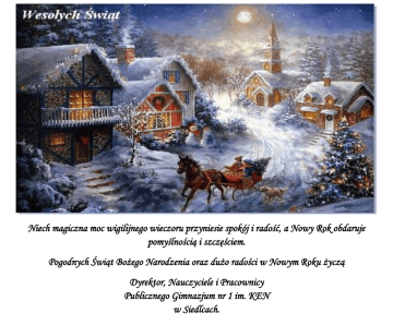 Niech magiczna moc wigilijnego wieczoru przyniesie spokój i radość, a Nowy Rok obdaruje pomyślnością i szczęściem. Pogodnych Świąt Bożego Narodzenia oraz dużo radości w Nowym Roku życzą Dyrektor, Nauczyciele i Pracownicy Publicznego Gimnazjum nr 1 im. KEN w Siedlcach.