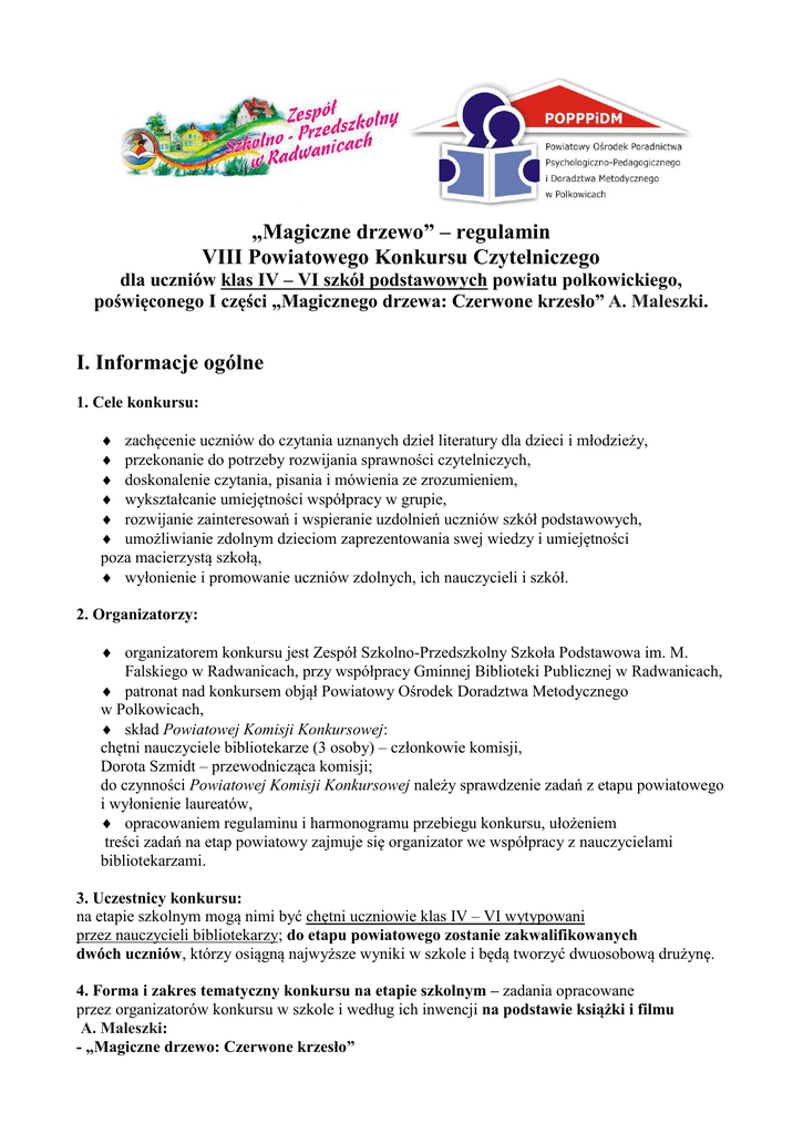 „Magiczne drzewo” – regulamin VIII Powiatowego Konkursu Czytelniczego dla uczniów klas IV – VI szkół podstawowych powiatu polkowickiego, poświęconego I części „Magicznego drzewa: Czerwone krzesło” A. Maleszki. I. Informacje ogólne 1. Cele konkursu: zachęcenie uczniów do czytania uznanych dzieł literatury dla dzieci i młodzieży, przekonanie do potrzeby rozwijania sprawności czytelniczych, doskonalenie czytania, pisania i mówienia ze zrozumieniem, wykształcanie umiejętności współpracy w grupie, rozwijanie zainteresowań i wspieranie uzdolnień uczniów szkół podstawowych, umożliwianie zdolnym dzieciom zaprezentowania swej wiedzy i umiejętności poza macierzystą szkołą, wyłonienie i promowanie uczniów zdolnych, ich nauczycieli i szkół. 2. Organizatorzy: organizatorem konkursu jest Zespół Szkolno-Przedszkolny Szkoła Podstawowa im. M. Falskiego w Radwanicach, przy współpracy Gminnej Biblioteki Publicznej w Radwanicach, patronat nad konkursem objął Powiatowy Ośrodek Doradztwa Metodycznego w Polkowicach, skład Powiatowej Komisji Konkursowej: chętni nauczyciele bibliotekarze (3 osoby) – członkowie komisji, Dorota Szmidt – przewodnicząca komisji; do czynności Powiatowej Komisji Konkursowej należy sprawdzenie zadań z etapu powiatowego i wyłonienie laureatów, opracowaniem regulaminu i harmonogramu przebiegu konkursu, ułożeniem treści zadań na etap powiatowy zajmuje się organizator we współpracy z nauczycielami bibliotekarzami. 3. Uczestnicy konkursu: na etapie szkolnym mogą nimi być chętni uczniowie klas IV – VI wytypowani przez nauczycieli bibliotekarzy; do etapu powiatowego zostanie zakwalifikowanych dwóch uczniów, którzy osiągną najwyższe wyniki w szkole i będą tworzyć dwuosobową drużynę. 4. Forma i zakres tematyczny konkursu na etapie szkolnym – zadania opracowane przez organizatorów konkursu w szkole i według ich inwencji na podstawie książki i filmu A. Maleszki: - „Magiczne drzewo: Czerwone krzesło” 2 5. Forma i zakres tematyczny konkursu na etapie powiatowym – zestaw zadań otwartych i zamkniętych (odpowiedzi ustne na wylosowane pytania, uzupełnianie luk w zdaniach lub ich kończenie odpowiednimi słowami, krzyżówki, drzewko decyzyjne, rebusy, schematy, podpisanie obrazków itp.), opracowanych na podstawie książki i filmu A. Maleszki: - Magiczne drzewo: Czerwone krzesło” 6. Stopnie konkursu: I etap – szkolny, II etap – powiatowy. 7. Do udziału w konkursie na etapie powiatowym uprawnia przesłanie Sprawozdania z etapu szkolnego VIII Powiatowego Konkursu Czytelniczego (załącznik). II. Organizacja poszczególnych etapów ETAP SZKOLNY 1. Odbywa się w szkołach w wybranym terminie – w marzec- kwiecień 2016 r.– jednak przed 15.04.2015 r. 2. Organizacją i przeprowadzeniem konkursu zajmuje się Szkolna Komisja Konkursowa powołana przez dyrektora szkoły. 3. Przewodniczący Szkolnej Komisji Konkursowej przesyła organizatorowi – ZSP w Radwanicach sprawozdanie z etapu szkolnego (załącznik) – w terminie nieprzekraczalnym do 15.04.2016 r. e-mailem lub faksem; adres e-mail – [email protected] tel. 076 746 15 70, fax 076 746 15 71. ETAP POWIATOWY 1. Przygotowuje i przeprowadza organizator oraz Powiatowa Komisja Konkursowa. 2. Eliminacje powiatowe odbędą się 22.04.2015 r. od godziny 1000 do 1230 w Zespole Szkolno Przedszkolnym w Radwanicach.(Uwaga zmiana miejsca) 3. Organizator przesyła również do szkół biorących udział w konkursie sprawozdanie z etapu powiatowego 14 dni po jego przeprowadzeniu. 4. Decyzje Powiatowej Komisji Konkursowej są ostateczne. III. Laureaci 1. Powiatowa Komisja Konkursowa ustala listę laureatów. 2. Wszyscy uczestnicy etapu powiatowego otrzymają dyplomy. 3. Laureaci zostaną nagrodzeni, a nauczyciele prowadzący otrzymają listy gratulacyjne podczas uroczystej imprezy podsumowującej wyniki konkursów organizowanych przez Powiatowy Ośrodek Doradztwa Metodycznego w Polkowicach. Uwaga: w sprawach nieobjętych regulaminem decyduje organizator w porozumieniu z Powiatową Komisją Konkursową. 3 Załącznik .......................................... (pieczęć szkoły) Sprawozdanie z etapu szkolnego VIII Powiatowego Konkursu Czytelniczego w ………………………………………………………………………. (nazwa szkoły) Lp. Imię i nazwisko ucznia – uczestnika etapu szkolnego, klasa Imię i nazwisko nauczyciela prowadzącego 1. 2. 3. 4. 5. 6. 7. 8. 9. 10. 11. 12. 13. 14. 15. 16. 17. 18. 19. 20. Na etapie powiatowym szkołę reprezentować będzie drużyna w składzie: 1. ………………………………………………………… 2. ………………………………………………………… ............................................................. (pieczęć i podpis dyrektora szkoły)