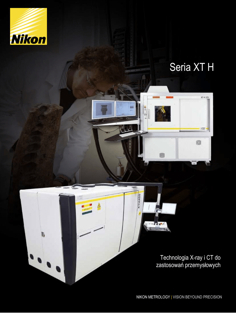 Seria XT H Technologia X-ray i CT do zastosowań przemysłowych NIKON METROLOGY | VISION BEYOUND PRECISION Wykazujące szeroki zakres zastosowań Uzyskaj obraz skomplikowanych części przemysłowych, poprzez wgląd w ich wewnętrzną strukturę. Następnie wykorzystaj możliwości CT do zakwalifikowania i wyznaczenia wymiarów wewnętrznych oraz zewnętrznych w prosty i nieniszczący sposób. Przemysłowe systemy X-ray i CT pozwalają uzyskać wysoką dokładność i możliwość jednoczesnego pomiaru wymiarów wewnętrznych oraz zewnętrznych bez konieczności niszczenia części. Co więcej, zapewniają, dodatkowy wgląd w czwarty wymiar - gęstość materiału i jego strukturę, dzięki czemu technologia CT jest niezbędnym narzędziem w przemyśle produkcyjnym. Technologia mikrofokus X-ray i CT rozwinęły się w ciągu ostatnich dziesięciu lat do tego stopnia, że jest to główny nurt technologii metrologicznej używanej w różnorodnych zastosowaniach. Zakres zastosowań stale rozszerza się poprzez przemysł samochodowy, lotniczy, energetyczny, a także dla sektora medycznego i odbiorców indywidualnych, tworzyw sztucznych, metali i materiałów egzotycznych. Ponad 25 lat doświadczenia w X-ray i CT Nikon Metrology, jako firma posiadająca kilkaset zainstalowanych systemów przemysłowych do kontroli jakości, dużo czasu poświęca na rozwój technologii mikrofokus X-ray i CT. Specjaliści od CT w mieście Tring w Anglii, opracowują kompletne systemy, zawierające własnej budowy lampy rentgenowskie mikrofokus, precyzyjne 5-osiowe w pełni programowalne manipulatory i szybki program do rekonstrukcji, który pracuje na stacjach roboczych. Komercyjne firmy i organizacje badawcze zakupują systemy X-ray i CT, które różnią się wielkością od najmniejszych do niestandardowych, 50-tonowych 450 kV pomieszczeń do inspekcji CT. Każdego dnia ponad 2500 systemów wykonuje przekroje 2D oraz skanuje trójwymiarowe chmury punktów począwszy od najmniejszych mikronowych komponentów do wielkich próbek. Wprowadzenie do przemysłowych systemów mikrofokus X-ray i CT Technologia X-ray Technologia X-ray (lub radiografia) jest w zasadzie prostym procesem. Obiekt jest umieszczony na obrotowym stole pomiędzy lampą rentgenowską a detektorem. Wysokiej jakości lampa rentgenowska mikrofokus firmy Nikon, generuje wiązkę promieniowania rentgenowskiego, które przechodzi przez próbkę. Następnie cyfrowy, płaski detektor odbiera obraz składający się z wielu odcieni szarości, spowodowany absorpcją promieniowania rentgenowskiego przechodzącego przez obiekt – w zależności od materiału i geometrii. Dla grubszego lub bardziej gęstego materiału takiego jak żelazo, miedź czy ołów obszar będzie ciemniejszy, niż dla cienkich lub lekkich materiałów takich jak tworzywo sztuczne papier czy powietrze. Tomografia Komputerowa (CT) Przysunięcie próbki bliżej źródła promieniowania rentgenowskiego powoduje powiększenie otrzymywanego obrazu. Do wygenerowania pełnego trójwymiarowego obrazu wykonywana jest seria kolejnych dwuwymiarowych zdjęć rentgenowskich 2D gdy obiekt obraca się o 360 stopni. Następnie przy użyciu skomplikowanego algorytmu oprogramowania do rekonstrukcji 3D zdjęcia te są rekonstruowane w obraz trójwymiarowy. Dodatkowo oprócz zewnętrznej powierzchni zrekonstruowany obraz zawiera wszystkie informacje dotyczące wewnętrznych powierzchni i struktury, a także informacje o czwartym wymiarze – gęstości materiału. Jest zatem możliwe poruszanie się po każdym punkcie, we wszystkich płaszczyznach w całej objętości zrekonstruowanego obiektu. W rezultacie nawet wewnętrzne pomiary mogą być łatwo mierzalne, jak również możliwość zlokalizowania istotnych niedoskonałości struktury oraz wychwycenia ewentualnych błędów montażowych zwykle niewidocznych przy użyciu tradycyjnych metod badań nieniszczących NDT. Zastosowanie do wielu aplikacji Gdy obiekt jest obracany wokół własnej osi, podczas wykonywania zdjęć rentgenowskich generowany jest jego pełny trójwymiarowy obraz. Obrazowanie rentgenowskie w czasie rzeczywistym jest zazwyczaj stosowane do szybkich ręcznych lub automatycznych kontroli wizyjnych, skanowanie CT stosowane jest do dogłębnej analizy, wspierania badań i rozwiązywania problemów: • • • • Cząstki złota w kamieniu Kompozyty Puszka pianki do golenia kontrola defektów analiza porowatości kontrola montażu analiza uszkodzeń Piana Złącze • • • • kontrola materiałów metrologia wymiarowa szybkie prototypowanie porównanie geometrii z modelem CAD Odlewy naczyniowe - wątroba Tłok Skamielina Łopatka turbiny 3 “At the heart of the image” Lampy rentgenowskie Własnej produkcji To co wyróżnia tomografy firmy Nikon Metrology to ogromna wiedza oraz unikalna technologia w dziedzinie X-ray i CT, które pozwalają firmie Nikon Metrology uzyskać miejsce lidera wśród producentów i projektować kompletne oraz innowacyjne rozwiązania na potrzeby rynku, oferując przeszło 25-letnie doświadczenie. Wszystkie typy lamp rentgenowskich mają konstrukcję otwartą, co znacząco zmniejsza koszty utrzymania. Wszystkie typy tomografów począwszy od nisko- (130 kV) poprzez średnio- (225 kV) do wysokonapięciowych (450kV) gwarantują pomiary z dokładnością rzędu mikrometrów. 225 kV ultrafokus z tarczą obrotową Dzięki 225 kV oraz minimalną wielkością plamki 3 µm, 225 kV mikrofokus staje się najbardziej uniwersalną lampą Nikona. Elastyczne opracowanie do radzenia sobie z różną wielkością oraz gęstością próbek. Nikon Metrology jest jedyną firmą, która produkuje przemysłową lampę 225 kV z tarczą obrotową. Zastosowanie tarczy obrotowej powoduje, że wiązka elektronów pada na ruchomą zamiast na przytwierdzoną powierzchnię, czego efektem jest o wiele bardziej skuteczne chłodzenie. Pozwala to skanować obiekty szybciej lub bardziej gęstych z wyższą dokładnością, niż