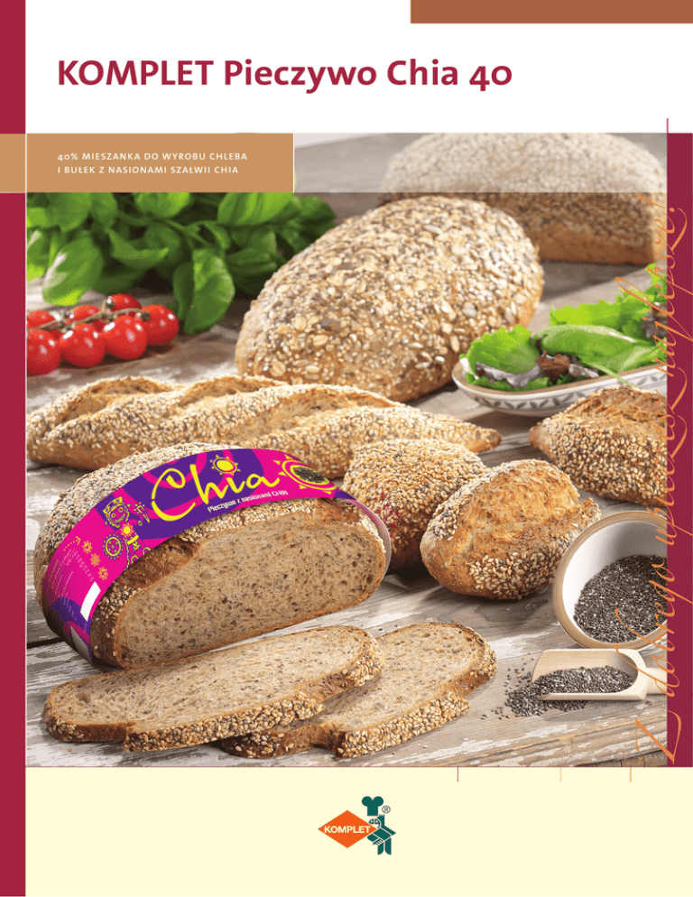KOMPLET Pieczywo Chia 40 4 0 % M I E SZA N KA D O W YRO B U C H L E BA Z dobrego upieczesz najlepsze! I BU ŁEK Z NASIONAMI SZAŁWI I CH IA KOMPLET Pieczywo Chia 40 30 szt. x 500 g ciasto: KOMPLET Chia 40 mąka pszenna, typ 550 KOMPLET Kwas Żytni zakwas piekarniczy 160/16 S° zakwas płynny 220/27 S° olej roślinny drożdże woda łączna ilość KOMPLET Kwas Żytni Zakwas piekarniczy Zakwas płynny 4,000 kg 5,250 kg 0,800 kg - kg - kg 0,250 kg 0,250 kg ok. 7,200 kg 4,000 kg 3,600 kg - kg 4,000 kg - kg 0,250 kg 0,250 kg ok. 5,650 kg 4,000 kg 5,000 kg - kg - kg 2,250 kg 0,250 kg 0,250 kg ok. 6,000 kg ok. 17,750 kg ok. 17,750 kg ok. 17,750 kg 0,250 kg 0,250 kg < < < < ok. 18,250 kg < Dekoracja: nasiona sezamu KOMPLET Chia 40 łączna ilość Wykonanie: Ze wszystkich składników wyrobić ciasto i odstawić do garowania. czas miesienia: (miesiarka spiralna) temp. ciasta: czas gary ciasta: dobrego upieczesz najlepsze! Chleb Chia 8 minut – 1. bieg 3 minuty – 2. bieg 26°C 25 minut < Po upływie czasu gary rozważyć ciasto na kęsy i nadać im pożądany kształt. Następnie zwilżyć wodą, obtoczyć w mieszance dekoracyjnej, włożyć do foremek lub ułożyć w koszyczkach i odstawić do garowania. naważka ciasta: czas gary kawałków ciasta: 0,600 kg 35-45 minut w temp. 30°C i wilgotności względnej 70% temp. pieczenia: czas pieczenia: 240°C spadająca do 200°C ok. 50 minut Z Następnie chleby koszyczkowe przełożyć na aparaty załadowcze, wsunąć do pieca i zaparować. Chleby formowe przed wsunięciem do pieca naciąć. Po 2 minutach otworzyć wyciąg na ok. 5 minut. Ponownie go otworzyć pod koniec pieczenia. Mieszanka KOMPLET Chia 40 zawiera aż 12,4% nasion chia (szałwii hiszpańskiej – Salvia hispanica) hispanica) Dlaczego chia? Niepodważalną zaletą nasion chia jest wysoka zawartość kwasów tłuszczowych omega-3 (między innymi kwas alfa-linolenowy ALA). Kwas alfa-linolenowy (ALA) pomaga w utrzymaniu prawidłowego poziomu cholesterolu we krwi. Korzystne działanie występuje w przypadku spożywania 2 g ALA dziennie. Jest to równowartość około 4 kromek chleba lub około 2 bułek przygotowanych według naszych receptur na chleb lub bułki Chia. dobrego upieczesz najlepsze! Co to jest chia? Chia to gatunek szałwii pochodzący z Meksyku – szałwia hiszpańska (Salvia hispanica). Dla starożytnych Azteków i Majów nasiona chia stanowiły źródło energii i witalności. Jednak, ten niegdyś podstawowy składnik diety Azteków, na długi czas niemal całkowicie popadł w zapomnienie. Obecnie roślinę tę ponownie uprawia się w całej Ameryce Południowej i Australii. Nasiona chia to źródło kwasów tłuszczowych omega-3. Z Mają kolor czarny i biały. W smaku są lekko orzechowe i charakteryzują się wysokim stopniem pęcznienia. Bułki Chia 210 szt. x 68 g 4,000 kg 6,000 kg 0,300 kg 0,300 kg ok. 6,000 kg KOMPLET Capital 3 drożdże woda ok. 16,600 kg Dekoracja: nasiona sezamu 0,600 kg 0,600 kg KOMPLET Chia 40 łączna ilość temp. ciasta: czas gary ciasta: 3 minuty – 1. bieg 6 minut – 2. bieg ok. 27°C 15 minut Abel + Schäfer Völklingen Schloßstraße 8-12 · 66333 Völklingen tel. +6898/9726-0 · fax +6898/9726-97 www.komplet.com 2,400 kg Następnie odciąć bułki na dzielarce (można zaokrąglić), zwilżyć wodą, obtoczyć w mieszance dekoracyjnej, ułożyć na blachach i odstawić do garowania. czas gary bułek: ok. 17,800 kg temp. pieczenia: czas pieczenia: Ze wszystkich składników wyrobić ciasto i odstawić do garowania. (miesiarka spiralna) naważka ciasta: 1,200 kg Wykonanie: czas miesienia: Po upływie czasu gary rozważyć ciasto na presy, zaokrąglić i odstawić na 10 minut do odprężenia. 35-45 minut w temp. 30°C i wilgotności względnej 70% 220°C ok. 21 minut R A DA M I ST RZA : R E C E PTU R Ę PO D STAWOWĄ N A B U Ł K I MOŻ N A RÓW N I EŻ W YKO RZYSTAĆ D O W YRO B U SZTA N G I E L E K LU B BAG I E T E K Z NAWAŻKĄ CIASTA 150 -250 G. Z mąka pszenna, typ 550 KOMPLET Polska ul. Chlebowa 2 · 62-080 Tarnowo Podgórne tel. +4861/8967100 · fax +4861/8967101 [email protected] · www.komplet.pl 02/15 ciasto: KOMPLET Chia 40 dobrego upieczesz najlepsze! KOMPLET Pieczywo Chia 40
