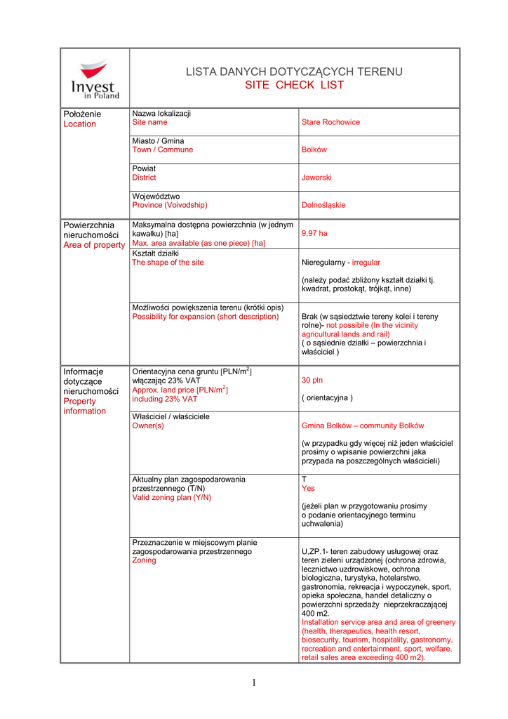 LISTA DANYCH DOTYCZĄCYCH TERENU SITE CHECK LIST Położenie Location Nazwa lokalizacji Site name Stare Rochowice Miasto / Gmina Town / Commune Bolków Powiat District Jaworski Województwo Province (Voivodship) Dolnośląskie Maksymalna dostępna powierzchnia (w jednym Powierzchnia 9,97 ha kawałku) [ha] nieruchomości Area of property Max. area available (as one piece) [ha] Kształt działki The shape of the site Nieregularny - irregular (należy podać zbliżony kształt działki tj. kwadrat, prostokąt, trójkąt, inne) Możliwości powiększenia terenu (krótki opis) Possibility for expansion (short description) Informacje dotyczące nieruchomości Property information Orientacyjna cena gruntu [PLN/m2] włączając 23% VAT Approx. land price [PLN/m2] including 23% VAT Właściciel / właściciele Owner(s) Brak (w sąsiedztwie tereny kolei i tereny rolne)- not possibile (In the vicinity agricultural lands and rail) ( o sąsiednie działki – powierzchnia i właściciel ) 30 pln ( orientacyjna ) Gmina Bolków – community Bolków (w przypadku gdy więcej niż jeden właściciel prosimy o wpisanie powierzchni jaka przypada na poszczególnych właścicieli) Aktualny plan zagospodarowania przestrzennego (T/N) Valid zoning plan (Y/N) T Yes (jeżeli plan w przygotowaniu prosimy o podanie orientacyjnego terminu uchwalenia) Przeznaczenie w miejscowym planie zagospodarowania przestrzennego Zoning 1 U,ZP.1- teren zabudowy usługowej oraz teren zieleni urządzonej (ochrona zdrowia, lecznictwo uzdrowiskowe, ochrona biologiczna, turystyka, hotelarstwo, gastronomia, rekreacja i wypoczynek, sport, opieka społeczna, handel detaliczny o powierzchni sprzedaży nieprzekraczającej 400 m2. Installation service area and area of greenery (health, therapeutics, health resort, biosecurity, tourism, hospitality, gastronomy, recreation and entertainment, sport, welfare, retail sales area exceeding 400 m2). Charakterystyka Klasa gruntów wraz z powierzchnią [ha] Soil class with area [ha] działki Land specification działka nr 119 – Ls V powierzchnia 0,53 ha -W powierzchnia 0,01 ha działka nr 120 – RV powierzchnia 0,17 ha - Ls IV powierzchnia 4,50 ha - Ls V powierzchnia 2,10 ha - Lz powierzchnia 2,49 ha -W powierzchnia 0,17 ha Grunt jest odrolniony i odlesiony. (dodatkowo prosimy o informację, czy grunt jest odrolniony / odlesiony) PLOT nr 119- Forest V size 0,53 ha -water connection size 0,01 ha PLOT nr 120 – RV size 0,17 ha -Forest IV size 4,50 ha -Forest V size 2,10 ha - Wooded area size 2,49 ha - Water supply size 0,17 ha Różnica poziomów terenu [m] Differences in land level [m] 10 m (350-360 m n.p.m.) 10m (350-360 m) above sea level (prosimy o wpisanie maksymalnej różnicy pomiędzy najniższym i najwyższym punktem działki, czy działka jest płaska) Obecne użytkowanie Present usage ( czy rolnicze, nieużytek itp. ) Teren lasów i zadrzewień. Woodem area and forest. Zanieczyszczenia wód powierzchniowych i gruntowych (T/N) Soil and underground water pollution (Y/N) Poziom wód gruntowych [m] Underground water level [m] (w przypadku odpowiedzi pozytywnej prosimy o krótki opis rodzaju zanieczyszczenia) N No ( ile m ) Od 80 m poniżej powierzchni terenu do 2 m poniżej powierzchni terenu. From 80m to 2 m below the Ground surface. 2 Czy były prowadzone badania geologiczne terenu (T/N) Were geological research done (Y/N) T Yes Ryzyko wystąpienia zalań lub obsunięć terenu (T/N) Risk of flooding or land slide (Y/N) N No Przeszkody podziemne (T/N) Underground obstacles (Y/N) (np. gazociągi, podziemne linie energetyczne itp.) T (5 studni wierconych i 2 studnie kopane wód glauberskich- zdewastowane) Yes (5 drilled Wells and 2 dug Wells of glauberski water- devastated) Przeszkody występujące na powierzchni terenu (T/N) Ground and overhead obstacles (Y/N) np. linie energetyczne, drogi przechodzące przez teren, zbiorniki i cieki wodne, kanały, obiekty pod ochroną itp.) Ruiny budynku rozlewni i piwnicy budynku pijalni. Remains of bottling plant building and building basement pump room. Istniejące ograniczenia ekologiczne (T/N) Ecological restrictions (Y/N) Budynki i zabudowania na terenie (T/N) Buildings / other constructions on site (Y/N) (jeżeli występują, prosimy o krótki opis) N No (jeżeli występują, prosimy o załączenie krótkiego opisu) Ruiny budynku rozlewni i piwnicy budynku pijalni. Remains of bottling plant building and building basement pump room. Połączenia transportowe Transport links Droga dojazdowa do terenu (rodzaj drogi i jej szerokość) Access road to the plot (type and width of access road) ( czy asfaltowa itp ) Od drogi publicznej krajowej KZ, przez drogę publiczną KL i drogą wewnętrzną gruntową o szerokości 10 m From national public Road KZ, by a public Road KL and internal land Road, 10 m wide. Autostrada / droga krajowa [km] Nearest motorway / national road [km] ( numer i odległość od działki ) droga krajowa nr 3, odległość 0,6 km 3 National Road nr 3, distance- 0,6 km Porty rzeczne i morskie w odległości do 200 km Sea and river ports located up to 200 km (prosimy o podanie miejscowości w której znajduje się port i odległości w km; interesują nas wszystkie porty znajdujące się w promieniu 200 km) Port rzeczny we Wrocławiu, odległość 90 km River port in Wroclaw, distance- 90 km Kolej [km] Railway line [km] (prosimy o podanie miejscowości w której znajduje się najbliższa stacja kolejowa i odległości w km) Stare Rochowice- linie nieczynna, odległość 2 km Stare Rochowice- railway closed, distance- 2 km Bocznica kolejowa [km] Railway siding [km] (prosimy o podanie miejscowości i odległości w km) Wrocław, odległość 90 km Wrocław- distance 90 km Najbliższe lotnisko międzynarodowe [km] Nearest international airport [km] (prosimy o podanie miejscowości i odległości w km; dodatkowo interesują nas wszystkie lotniska znajdujące się w promieniu 100 km) Wrocław, odległość 90 km Wrocław- distance 90 km Najbli