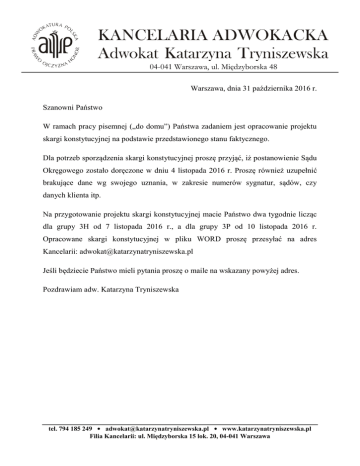04-041 Warszawa, ul. Międzyborska 48 Warszawa, dnia 31 października 2016 r. Szanowni Państwo W ramach pracy pisemnej („do domu”) Państwa zadaniem jest opracowanie projektu skargi konstytucyjnej na podstawie przedstawionego stanu faktycznego. Dla potrzeb sporządzenia skargi konstytucyjnej proszę przyjąć, iż postanowienie Sądu Okręgowego zostało doręczone w dniu 4 listopada 2016 r. Proszę również uzupełnić brakujące dane wg swojego uznania, w zakresie numerów sygnatur, sądów, czy danych klienta itp. Na przygotowanie projektu skargi konstytucyjnej macie Państwo dwa tygodnie licząc dla grupy 3H od 7 listopada 2016 r., a dla grupy 3P od 10 listopada 2016 r. Opracowane skargi konstytucyjnej w pliku WORD proszę przesyłać na adres Kancelarii: [email protected] Jeśli będziecie Państwo mieli pytania proszę o maile na wskazany powyżej adres. Pozdrawiam adw. Katarzyna Tryniszewska tel. 794 185 249 • [email protected] • www.katarzynatryniszewska.pl Filia Kancelarii: ul. Międzyborska 15 lok. 20, 04-041 Warszawa Stan faktyczny: W dniu 30 czerwca 2016 r. zostało wydane przez Prokuratura Prokuratury Rejonowej postanowienie o powtórnym umorzeniu dochodzenia w sprawie. Postanowienie to zostało doręczone pokrzywdzonemu w dniu 8 lipca 2016 r., natomiast pełnomocnikowi pokrzywdzonego w osobie adwokata, w dniu 9 lipca 2016 r. Pełnomocnik ustanowił się na etapie postępowania toczącego się w prokuraturze. W dniu 9 sierpnia 2016 r. pełnomocnik wniósł subsydiarny akt oskarżenia (data stempla pocztowego), działając na rzecz pokrzywdzonego, na podstawie art. 55 k.p.k. Postanowieniem z dnia 1 października 2016 r. Sąd Rejonowy umorzył postępowanie w sprawie na podstawie art. 17 §1 pkt 9 k.p.k. wskazując w uzasadnieniu, iż mając na uwadze stanowisko Sądu Najwyższego wyrażone w wyroku z 26 lutego 2014 r. (III KK 6/2014, Lexis.pl nr 8687585) „1. Miesięczny termin określony w art. 55 § 1 k.p.k. jest terminem prekluzyjnym, liczonym od doręczenia pokrzywdzonemu, a nie jego pełnomocnikowi, zawiadomienia o wydaniu przez prokuratora powtórnie postanowienia o odmowie wszczęcia lub umorzenia postępowania w wypadkach określonych w art. 330 § 2 k.p.k. 2. Wniesienie subsydiarnego aktu oskarżenia w okolicznościach, gdy nie zostały spełnione warunki określone w art. 55 § 1 k.p.k., równoznaczne jest z brakiem skargi uprawnionego oskarżyciela”, w ocenie Sądu subsydiarny akt oskarżenia powinien zostać wniesiony do 8 sierpnia 2016 r., a nie do 9 sierpnia 2016 r., gdyż termin należy obliczyć od daty doręczenia powtórnego postanowienia o umorzeniu pokrzywdzonemu, a nie jego pełnomocnikowi. Z uwagi zatem na przekroczenie terminu do wniesienia subsydiarnego aktu oskarżenia, uznać należy, iż postępowanie podlega umorzeniu z uwagi na brak skargi uprawnionego oskarżyciela. Postanowienie Sądu umarzające postępowanie zostało doręczone pełnomocnikowi, który od tego postanowienia wniósł w terminie zażalenie, które nie zostało uwzględnione przy zachowaniu argumentacji podniesionej przez Sąd Rejonowy, a postanowienie utrzymane w mocy. 2