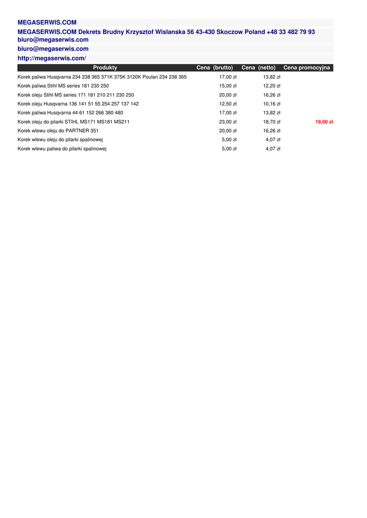 MEGASERWIS.COM MEGASERWIS.COM Dekrets Brudny Krzysztof Wislanska 56 43-430 Skoczow Poland +48 33 482 79 93 [email protected] [email protected] http://megaserwis.com/ Produkty Cena (brutto) Cena (netto) Cena promocyjna Korek paliwa Husqvarna 234 238 365 371K 375K 3120K Poulan 234 238 365 17,00 zł 13,82 zł Korek paliwa Stihl MS series 181 230 250 15,00 zł 12,20 zł Korek oleju Stihl MS series 171 181 210 211 230 250 20,00 zł 16,26 zł Korek oleju Husqvarna 136 141 51 55 254 257 137 142 12,50 zł 10,16 zł Korek paliwa Husqvarna 44 61 152 266 380 480 17,00 zł 13,82 zł Korek oleju do pilarki STIHL MS171 MS181 MS211 23,00 zł 18,70 zł 19,00 zł Korek wlewu oleju do PARTNER 351 20,00 zł 16,26 zł Korek wlewu oleju do pilarki spalinowej 5,00 zł 4,07 zł Korek wlewu paliwa do pilarki spalinowej 5,00 zł 4,07 zł