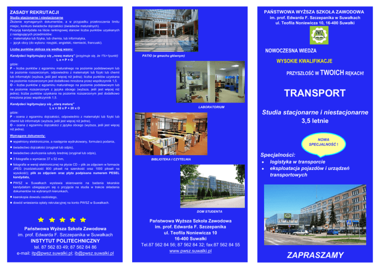 A PAŃSTWOWA WYŻSZA SZKOŁA ZAWODOWA ZASADY REKRUTACJI im. prof. Edwarda F. Szczepanika w Suwałkach ul. Teofila Noniewicza 10, 16-400 Suwałki Studia stacjonarne i niestacjonarne Złożenie wymaganych dokumentów, a w przypadku przekroczenia limitu miejsc, konkurs świadectw dojrzałości (świadectw maturalnych). Pozycję kandydata na liście rankingowej stanowi liczba punktów uzyskanych z następujących przedmiotów: – matematyka lub fizyka, lub chemia, lub informatyka, – język obcy (do wyboru: rosyjski, angielski, niemiecki, francuski). Liczbę punktów oblicza się według wzoru: Kandydaci legitymujący się „nową maturą” (przyjmuje się, że 1%=1punkt) Ln=P+O gdzie: P – liczba punktów z egzaminu maturalnego na poziomie podstawowym lub na poziomie rozszerzonym, odpowiednio z matematyki lub fizyki lub chemii lub informatyki (wyższa, jeśli jest więcej niż jedna); liczba punktów uzyskana na poziomie rozszerzonym jest dodatkowo mnożona przez współczynnik 1,5. O – liczba punktów z egzaminu maturalnego na poziomie podstawowym lub na poziomie rozszerzonym z języka obcego (wyższa, jeśli jest więcej niż jedna); liczba punktów uzyskana na poziomie rozszerzonym jest dodatkowo mnożona przez współczynnik 1,5. NOWOCZESNA WIEDZA PATIO (w gmachu głównym) WYSOKIE KWALIFIKACJE PRZYSZŁOŚĆ W TWOICH RĘKACH! TRANSPORT Kandydaci legitymujący się „starą maturą” L s = 30 x P + 20 x O gdzie: P – ocena z egzaminu dojrzałości, odpowiednio z matematyki lub fizyki lub chemii lub informatyki (wyższa, jeśli jest więcej niż jedna), O – ocena z egzaminu dojrzałości z języka obcego (wyższa, jeśli jest więcej niż jedna). LABORATORIUM Studia stacjonarne i niestacjonarne 3,5 letnie Wymagane dokumenty: NOWA SPECJALNOŚĆ ! wypełniony elektronicznie, a następnie wydrukowany, formularz podania, świadectwo dojrzałości (oryginał lub odpis), świadectwo ukończenia szkoły średniej (oryginał lub odpis), 3 fotografie o wymiarze 37 x 52 mm, Specjalności: BIBLIOTEKA I CZYTELNIA logistyka w transporcie eksploatacja pojazdów i urządzeń transportowych fotografia w wersji elektronicznej na płycie CD – plik ze zdjęciem w formacie JPEG (rozdzielczość 800 pikseli na szerokość oraz 1000 pikseli na wysokość); plik ze zdjęciem oraz płyta podpisana numerem PESEL kandydata, PWSZ w Suwałkach wystawia skierowanie na badania lekarskie kandydatom ubiegającym się o przyjęcie na studia w trakcie składania dokumentów na wybranych kierunkach, kserokopia dowodu osobistego, dowód wniesienia opłaty rekrutacyjnej na konto PWSZ w Suwałkach. DOM STUDENTA Państwowa Wyższa Szkoła Zawodowa im. prof. Edwarda F. Szczepanika w Suwałkach INSTYTUT POLITECHNICZNY tel. 87 562 83 49; 87 562 84 86 e-mail: [email protected]; [email protected] Państwowa Wyższa Szkoła Zawodowa im. prof. Edwarda F. Szczepanika ul. Teofila Noniewicza 10 16-400 Suwałki Tel.87 562 84 56; 87 562 84 32; fax:87 562 84 55 www.pwsz.suwalki.pl ZAPRASZAMY Specjalność: eksploatacja pojazdów i urządzeń transportowych Tytuł zawodowy: inżynier Umiejętności: Specjalność: logistyka w transporcie Tytuł zawodowy: inżynier Umiejętności: Absolwent studiów na specjalności eksploatacja pojazdów i urządzeń transportowych posiada wiedzę z zakresu funkcjonowania nowoczesnego transportu, a w szczególności inżynierii środków transportowych, inżynierii ruchu oraz analizy systemów transportowych. Absolwent studiów na specjalności logistyka w transporcie posiada wszechstronną wiedzę dotyczącą funkcjonowania nowoczesnych systemów logistycznych w transporcie, w tym wiedzę teoretyczną i praktyczną w zakresie gospodarki magazynowej, transportu wewnątrzzakładowego oraz telematyki. Potrafi w szczególności: Potrafi w szczególności: rozwiązywać problemy w zakresie organizacji, planowania, projektowania systemów sterowania i kierowania ruchem, rozwiązywać problemy technologiczne i ekonomiczne w przedsiębiorstwie, oceniać skutki decyzji produkcyjnych i inwestycyjnych na funkcjonowanie i wyniki produkcyjno-ekonomiczne przedsiębiorstwa, organizować i koordynować na poziomie operacyjnym prace zespołów pracowniczych realizujących zadania projektowe, produkcyjne, logistyczne i usługowe, wdrażać wyniki prac badawczo-rozwojowych, związanych w szczególności z transportem i logistyką. Zna język obcy w stopniu biegłym, na poziomie co najmniej B2. Uprawnienia: Absolwent jest przygotowany do podjęcia studiów II stopnia na kierunku Transport i kierunkach pokrewnych oraz jest otwarty na ciągłe uzupełnianie wykształcenia na kursach, szkoleniach, studiach podyplomowych, itp. Ponadto jest przygotowany do pracy w: firmach przewozowych i spedycyjnych, zakładach komunikacji miejskiej, policji drogowej, służbach celnych i granicznych, wydziałach komunikacji urzędów miejskich, specjalistycznych firmach świadczących usługi transportowe (kolumny transportu sanitarnego, jednostki ratownictwa drogowego, itp.). Jest także przygotowany do prowadzenia własnej działalności gospodarczej. zaplanować działalność w zakresie logistyki na każdym szczeblu łańcucha dostaw, wykorzystać podstawową wiedzę teoretyczną do formułowania i analizy problemów logistycznych w organizacji i jej otoczeniu rynkowym, wykorzystywać metody ilościowe i jakościowe w projektowaniu procesów logistycznych, nabywa umiejętność samodzielnego wykonywania niezbędnych obliczeń przy projektowaniu i eksploatacji transportowych systemów logistycznych, nabywa umiejętność korzystania z narzędzi informatycznych stosowanych w logistyce. Zna język obcy w stopniu biegłym, na poziomie co najmniej B2. Uprawnienia: Absolwent jest przygotowany do podjęcia studiów II stopnia na kierunku Transport i kierunkach pokrewnych oraz jest otwarty na ciągłe uzupełnianie wykształcenia na kursach, szkoleniach, studiach podyplomowych, itp. Ponadto jest przygotowany do pracy w: firmach przewoz
