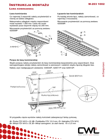 M-203 1002 INSTRUKCJA MONTAŻU ŁAWA KOMINIARSKA Ława kominiarska Łączenie ław kominiarskich Co najmniej 3 wsporniki należy przytwierdzić w równej od siebie odległości. Po każdej stronie łącz, należy zamontować, co najmniej 2 mocowania. Maksymalna odległość między wspornikami może wynieść 1.200 mm. Ława nie może wystawać poza wspornik więcej niż 200 mm. Mocowanie przytwierdzić za pomocą zestawu 420009P. Mocowanie przytwierdzić za pomocą zestawu 420009P Poręcz do ławy kominiarskiej Należy użyć następujących zestawów: 430034P, 420011P oraz 420012P. Żerdź Ø27mm Pałąk końcowy Rurka łącznikowa W przypadku cięcia wyrobów należy końcówki zabezpieczyć farbą cynkową. A= Śruba FZV M10 x 20, B= Podkładka FZV 10,5 mm, C= Nakrętka FZV M10, D= Wkręt FZV M10 x 35, E= Wkręt samogwint. ze stali nierdz. 19 x 5,5 mm cwlundberg.se Słupki poręczy należy przytwierdzić do ławy kominiarskiej bezpośrednio przy wspornikach. Dwa samogwintujące wkręty należy zamontować w pierwszym i ostatnim słupku łącznej długości ław. M-205 1002 INSTRUKCJA MONTAŻU DRABINA STOPNIOWA DACHOWA Drabina stopniowa dachowa Drabinę dachową instaluje się tak, by maksymalna odległość między mocowaniami uniwersalnymi nie wynosiła więcej niż 1500 mm. Nie może wystawać więcej niż 150 mm. Do mocowania używać wkręty 420009P oraz zestawu FZV 470018P. Zamocowanie uniwersalne Płytka łącznikowa Kąt nachylenia dachu <12° Ława kominiarska na połaci dachu. Maksymalny odstęp miedzy wspornikami 1.200 mm. Kąt nachylenia dachu 8° - 33° Ta powierzchnia ku Kąt nachylenia dachu >33° Ta powierzchnia ku górze Żerdź dla drabiny stopniowej dachowej Słupek montuje się w odległości najwyżej 100 mm od wspornika. Dwa samogwintujące wkręty należy zamontować w pierwszym i ostatnim słupku na łącznej długości drabiny. Konstrukcje montować przy użyciu zestawów FZV 470200P, 420011P oraz 420012P. Rurka łącznikowa Zestaw adaptacyjny W przypadku cięcia wyrobów należy końcówki zabezpieczyć farbą cynkową. A= Śruba FZV M10 x 20, B= Podkładka FZV10,5 mm, C= Nakrętka FZV M10, D= Wkręt FZV M10 x 50, E= Wkręt samogwintujący ze stali nierdzewnej 19 x 5,5 mm cwlundberg.se W kierunku kalenicy W kierunku kalenicy INSTRUKCJA MONTAŻU STOPIEŃ M-213 1302 DACHOWY DO DACHU KRYTEGO BLACHĄ Stopieńdachowy do montażu na dachu z blachy stalowej o min. grubości 0,4 mm lub blachy aluminiowej o min. grubości 0,6 mm z maks. Odległości pomiędzy górnymi profilami 280 mm. Stopień dachowy nie może być wykorzystywany do kotwiczenia się liny bezpieczeństwa. Zaprojektowanie zgodnie z normą SS-EN 516 dla dachów ze spadkiem od 27° do 33° Stopnie dachowe wolno montować wyłącznie w linii prostej jeden nad drugim. Stopień dachowy ma dwie powierzchnie stopnicowe dostosowane do różnych kątów nachylenia dachu. W przypadku kąta nachylenia dachu powyżej 33° należy zwrócić ku górze krótką powierzchnię t i cwlundberg.se A= Nierdzewny wkręt do blachy z podkładką 19 x 6,3 mm INSTRUKCJA MONTAŻU STOPIEŃ M-034 040322 DACHOWY DO DACHÓW POKRYTYCH DACHÓWKĄ Stopień dachowy do dachów pokrytych dachówką. Pasuje na dachówkę o rozmiarach 25 i 50 mm. Stopień można montować jedynie w prostej lini, jeden nad drugim. Min. odległość od łączenia się łat lub ich zakończeń wynosi 1000 mm. Stopnie nie można montować na łatach mniejszych niż 22 x 36 mm. Łaty nie mogą być zniekształcone lub osłabione wyszczerbieniami, najniższa dopuszczalna klasa wynosi V. Połać dachu powinna być wykonana zgodnie z zaleceniami producenta dachówek. A. Boki stopnia ① należy dopasować do dachówki i łat za pomocą urządzenia do zaginania ②. Zagięcie ma nasąpić w żądanym miejscu lecz powyżej otworu i może się odbyć jedynie raz. B. Ułóż niższy rząd dachówek, zaczep hak o łatę dachową tak aby boki stopnia spoczywały w miejscach zapadania się dachówek. C. Ułóż następny rząd dachówek i zamontuj pozostałe stopnie jak powyżej. Wzór opatentowany Numer typu zatwierdzenia: 0072/03 cwlundberg.se D. Zabezpieczenia antypoślizgowe należy montować obok stopnia dachowego. INTRUKCJA MONTAŻU STOPIEŃ M-081 040322 DACHOWY TYPU KOMBI DO MONTAŻU NA DACHÓWCE Stopień dachowy typu kombi do montażu na dachówce. Pasuje do dachówek, gdzie łaty posiadają grubość 25 lub 50 mm. Stopień dachowy może być stosowany do dachów, gdzie fasada budynku nie przekracza 4 metrów oraz o spadku dachu nie większym niż 45º. Stopnie dachowe mogą być jedynie montowane jednym nad drugim. Odległość od zakończenia lub łączenia się łat nie może być mniejsza niż 1000 mm. Stopień dachowy nie może być montowany na łatach mniejszych niż 22 x 36 mm. Łaty nie mogą zawierać sęków i wtrąceń kory. Poszycie dachowe musi być wykonane zgodnie z instrukacjami producenta dachówki. A. Boki stopnia ① dopasowuje się do wielkości łaty za pomocą uwytu do wyginania ②. Wygięcie ma nastąpić na danym otworze i może być wykonane tylko raz po każdej ze stron. B. Umieść dolny szereg dachówek i rozmieść wsporniki stopnia w jej dolnej części. D. Ułóż następny rząd dachówek oraz umieść dachówkę zgodnie z instrukcją powyżej. Zabezpieczenie antypoślizgowe do drabiny dostawianej montuje się obok stopnia dachowego. Numer zatwierdzenia 0072/03 Wzór opatentowany cwlundberg.se C. Zamocuj stopień ③ za pomocą 2 szt śrub A2 M6 x 12 mm z nakrętkami w otworach ④. Śruby montowane są od wewnątrz. Szerokość stopnia można dopasować, tak aby sie ułozyły w dolinach dachówek.
