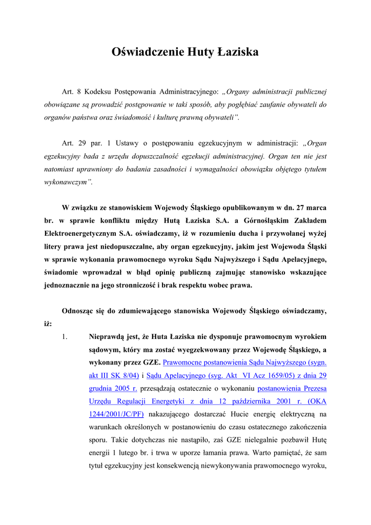 Oświadczenie Huty Łaziska Art. 8 Kodeksu Postępowania Administracyjnego: „Organy administracji publicznej obowiązane są prowadzić postępowanie w taki sposób, aby pogłębiać zaufanie obywateli do organów państwa oraz świadomość i kulturę prawną obywateli”. Art. 29 par. 1 Ustawy o postępowaniu egzekucyjnym w administracji: „Organ egzekucyjny bada z urzędu dopuszczalność egzekucji administracyjnej. Organ ten nie jest natomiast uprawniony do badania zasadności i wymagalności obowiązku objętego tytułem wykonawczym”. W związku ze stanowiskiem Wojewody Śląskiego opublikowanym w dn. 27 marca br. w sprawie konfliktu między Hutą Łaziska S.A. a Górnośląskim Zakładem Elektroenergetycznym S.A. oświadczamy, iż w rozumieniu ducha i przywołanej wyżej litery prawa jest niedopuszczalne, aby organ egzekucyjny, jakim jest Wojewoda Śląski w sprawie wykonania prawomocnego wyroku Sądu Najwyższego i Sądu Apelacyjnego, świadomie wprowadzał w błąd opinię publiczną zajmując stanowisko wskazujące jednoznacznie na jego stronniczość i brak respektu wobec prawa. Odnosząc się do zdumiewającego stanowiska Wojewody Śląskiego oświadczamy, iż: 1. Nieprawdą jest, że Huta Łaziska nie dysponuje prawomocnym wyrokiem sądowym, który ma zostać wyegzekwowany przez Wojewodę Śląskiego, a wykonany przez GZE. Prawomocne postanowienia Sądu Najwyższego (sygn. akt III SK 8/04) i Sądu Apelacyjnego (syg. Akt VI Acz 1659/05) z dnia 29 grudnia 2005 r. przesądzają ostatecznie o wykonaniu postanowienia Prezesa Urzędu Regulacji Energetyki z dnia 12 października 2001 r. (OKA 1244/2001/JC/PF) nakazującego dostarczać Hucie energię elektryczną na warunkach określonych w postanowieniu do czasu ostatecznego zakończenia sporu. Takie dotychczas nie nastąpiło, zaś GZE nielegalnie pozbawił Hutę energii 1 lutego br. i trwa w uporze łamania prawa. Warto pamiętać, że sam tytuł egzekucyjny jest konsekwencją niewykonywania prawomocnego wyroku, 2 w którym Sąd Najwyższy i Sąd Apelacyjny, po przeanalizowaniu wszystkich merytorycznych argumentów, odrzucił wszystkie zarzuty podnoszone obecnie przez GZE i orzekł obowiązek dostarczania przez ten zakład energii. 2. Postępowanie egzekucyjne dotyczy przymuszenia dłużnika do wykonania powyższego postanowienia na okres trwania sporu. Wobec oporu dłużnika prawomocne postanowienie zabezpieczające, a zatem i cały wyrok, nie zostały wykonane. Kontestowanie tego faktu przez organ egzekucyjny, jakim jest Wojewoda Śląski, oznacza próbę podważania prawomocnych wyroków sądowych przez urzędnika państwowego mającego stać na straży prawa i porządku. Po raz kolejny przypomnieć należy, że Wojewoda Śląski nie jest powołany do oceny i określania zasad, na jakich GZE ma dostarczać prąd do Huty Łaziska, ale ma doprowadzić do wykonania zobowiązania ciążącego na tym dłużniku. 3. Wbrew uporczywym twierdzeniom Wojewody Śląskiego, wskazanie środka egzekucyjnego przez Prezesa URE, nie jest dla organu egzekucyjnego wiążące, co z niewiadomych powodów Wojewoda usiłuje ukrywać nie dopuszczając w tej materii różnych prawnych opinii, w tym przedkładanych przez Hutę Łaziska. Prezes URE co prawda wskazał Wojewodzie Śląskiemu użycie jako środka przymusu grzywny, jednakże nie pozbawił Wojewody możliwości zastosowania innych przewidzianych ustawą środków egzekucyjnych nakierowanych na osiągnięcie celu egzekucji, jeśli grzywna nie okazałaby się skuteczna. Wojewoda Śląski, jako przedstawiciel administracji państwowej i organ egzekucyjny, ma obowiązek doprowadzić do skutecznej egzekucji wobec zobowiązanego, jakim jest GZE w myśl postanowienia Sądu Najwyższego i Sądu Apelacyjnego. Wykonując przepisy Ustawy o egzekucji w administracji, ma w tym celu przedsiębrać skuteczne kroki, a takimi bez wątpienia nie są nakładane na GZE grzywny po 25 tys. zł, zwłaszcza wobec publicznych oświadczeń dłużnika, że nie ma zamiaru ich płacić ani respektować prawa. Tym bardziej więc podejmowanie tylko takich, ograniczonych środków, budzić musi poważne wątpliwości i obawy, iż Wojewoda próbuje prowadzić postępowanie dla samego postępowania, okazując ostentacyjny brak przekonania o skuteczności swoich działań. Odbieramy z najwyższym zdumieniem oświadczenie Wojewody Śląskiego, jakoby inny środek egzekucyjny miał narazić Skarb Państwa na hipotetyczne 3 straty w wyniku abstrakcyjnych odszkodowań. To właśnie dotychczasowe świadome stosowanie z góry skazanych na nieskuteczność środków egzekucyjnych powoduje straty w majątku Huty Łaziska wymiernej wysokości 300 tys. zł dziennie, które będą dochodzone na drodze prawnej od Skarbu Państwa, i zagrożenie dla dalszego istnienia zakładu. 4. Przywoływane w oświadczeniu Wojewody Śląskiego postanowienie Sądu Ochrony Konkurencji i Konsumentów z 24 lutego br. (sygn. akt XVII AmE 94/04) jest nieprawomocne, nie ma więc mocy prawnej. Do czasu ewentualnego rozstrzygnięcia prawomocności tego postanowienia przez Sąd Apelacyjny w Warszawie obowiązuje więc prawomocne postanowienie Prezesa URE z dnia 12 października 2001 r., potwierdzone prawomocnym postanowieniem tegoż Sądu z dnia 29 grudnia 2005 r. GZE nie wykonuje tego postanowienia zabezpieczającego od ponad 4 lat, a ponadto nie stosuje się do kolejnych orzeczeń sądowych podtrzymujących to postanowienie, również do ostatniego, prawomocnego. Natomiast żaden inny wyrok, w tym w szczególności z 2006 r. w tej sprawie nie istnieje. Nie tylko dla prawników jest oczywistością, że sąd niższej instancji w żaden sposób nie może zmieniać prawomocnych orzeczeń Sądu Najwyższego i Sądu Apelacyjnego. 5. Wojewoda Śląski kontynuując proces egzekucyjny (rażąco nieskutecznie) jako organ administracji publicznej zaprzecza sam sobie, gdyż z jednej strony zajmuje stanowisko w sprawie (do czego nie jest uprawniony) przywołując nieist