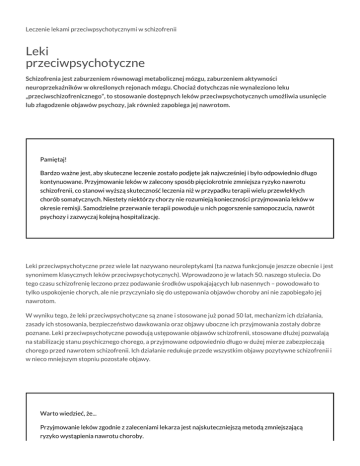 Leczenie lekami przeciwpsychotycznymi w schizofrenii Leki przeciwpsychotyczne Schizofrenia jest zaburzeniem równowagi metabolicznej mózgu, zaburzeniem aktywności neuroprzekaźników w określonych rejonach mózgu. Chociaż dotychczas nie wynaleziono leku „przeciwschizofrenicznego”, to stosowanie dostępnych leków przeciwpsychotycznych umożliwia usunięcie lub złagodzenie objawów psychozy, jak również zapobiega jej nawrotom. Pamiętaj! Bardzo ważne jest, aby skuteczne leczenie zostało podjęte jak najwcześniej i było odpowiednio długo kontynuowane. Przyjmowanie leków w zalecony sposób pięciokrotnie zmniejsza ryzyko nawrotu schizofrenii, co stanowi wyższą skuteczność leczenia niż w przypadku terapii wielu przewlekłych chorób somatycznych. Niestety niektórzy chorzy nie rozumieją konieczności przyjmowania leków w okresie remisji. Samodzielne przerwanie terapii powoduje u nich pogorszenie samopoczucia, nawrót psychozy i zazwyczaj kolejną hospitalizację. Leki przeciwpsychotyczne przez wiele lat nazywano neuroleptykami (ta nazwa funkcjonuje jeszcze obecnie i jest synonimem klasycznych leków przeciwpsychotycznych). Wprowadzono je w latach 50. naszego stulecia. Do tego czasu schizofrenię leczono przez podawanie środków uspokajających lub nasennych – powodowało to tylko uspokojenie chorych, ale nie przyczyniało się do ustępowania objawów choroby ani nie zapobiegało jej nawrotom. W wyniku tego, że leki przeciwpsychotyczne są znane i stosowane już ponad 50 lat, mechanizm ich działania, zasady ich stosowania, bezpieczeństwo dawkowania oraz objawy uboczne ich przyjmowania zostały dobrze poznane. Leki przeciwpsychotyczne powodują ustępowanie objawów schizofrenii, stosowane dłużej pozwalają na stabilizację stanu psychicznego chorego, a przyjmowane odpowiednio długo w dużej mierze zabezpieczają chorego przed nawrotem schizofrenii. Ich działanie redukuje przede wszystkim objawy pozytywne schizofrenii i w nieco mniejszym stopniu pozostałe objawy. Warto wiedzieć, że... Przyjmowanie leków zgodnie z zaleceniami lekarza jest najskuteczniejszą metodą zmniejszającą ryzyko wystąpienia nawrotu choroby. Istota działania leków przeciwpsychotycznych Mechanizmy działania tych leków związane są z ich wpływem na różne substancje chemiczne produkowane i działające w ludzkim mózgu (tzw. neuroprzekaźniki), np. serotoninę, histaminę czy acetylocholinę. Najistotniejszy jest jednak wpływ tych leków na inny neuroprzekaźnik – dopaminę. Pamiętaj! Wszystkie leki przeciwpsychotyczne powodują zmniejszenie stymulacji receptorów dopaminowych, zwiększając w ten sposób odporność na stres i zmniejszając objawy schizofrenii, głównie jej objawy pozytywne. Z ich wpływem na receptory dopaminowe wiąże się jednocześnie możliwość pojawienia się objawów ubocznych – dotyczy to szczególnie tzw. klasycznych leków przeciwpsychotycznych (neuroleptyków). Warto wiedzieć, że... Pierwszych istotnych efektów działania leków przeciwpsychotycznych można spodziewać się po 4–6 tygodniach. Jeśli po tym czasie u chorego nie występuje wyraźna poprawa, lekarz zmienia lek na inny. Stosuje się również leki, dla których wyraźny efekt pojawia się zwykle nieco później – nawet po 2–3 miesiącach. Dlatego nigdy nie należy podejmować samodzielnie decyzji o przerwaniu leczenia. Jeśli efekt terapeutyczny nie jest zadowalający, należy o tym porozmawiać z lekarzem. Jeśli u pacjenta występują wyraźne objawy uboczne, które nie dają się opanować przy pomocy leków korygujących, zmiana leków może nastąpić w każdej chwili. Leki przy pierwszym epizodzie schizofrenii i przy jej nawrotach Dawniej stosowano wyłącznie typowe (klasyczne) leki przeciwpsychotyczne, obecnie wybiera się przede wszystkim leki atypowe – ze względu na większe bezpieczeństwo ich stosowania i większy komfort leczenia dla samego chorego. Obecnie wszystkie znane zasady leczenia schizofrenii (tzw. standardy terapii) zalecają terapię wczesnych stadiów schizofrenii wyłącznie przy użyciu leków atypowych. Nie dotyczy do klozapiny, którą włącza się dopiero po dwóch nieudanych kuracjach innymi lekami – jest to zalecenie dla lekarzy w większości krajów świata, w tym także w Polsce. Przy wyborze leku do terapii nawrotu schizofrenii obowiązuje kilka zasad, związanych z przyczynami nawrotu schizofrenii. Oto one : Jeśli chory dobrze funkcjonował, przyjmując poprzedni lek, i przestał go przyjmować, ponieważ czuł się już wyleczony, najczęściej wraca się do poprzedniego leku w ostatniej przed przerwaniem kuracji dawce. Jeśli chory przerwał przyjmowanie leku z powodu objawów ubocznych, szczególnie z powodu znacznego nasilenia objawów pozapiramidowych, można włączyć poprzedni lek w niższej, ale jeszcze skutecznej dawce, lub przywrócić jego poprzednią dawkę i dołączyć do niej lek korygujący, można także spróbować zmiany leku z typowego na atypowy. Jeśli chory nie przestrzegał zaleceń związanych z przyjmowaniem leku doustnego, można go wymienić na ten sam lek w postaci o przedłużonym działaniu. Jeśli pogorszenie wystąpiło pomimo dobrej tolerancji leku i przy jego właściwym dawkowaniu, lekarz zmieni pacjentowi lek na inny, dający większą szansę powrotu do zdrowia. W wielu przypadkach będzie to lek przeciwpsychotyczny atypowy. Przy doborze leku oprócz powyższych zasad ważne są doświadczenie lekarza oraz propozycje chorego, wynikające z jego poprzednich kuracji. Rodzaje leków przeciwpsychotycznych W zależności od częstości stosowania leki można podzielić na dwie grupy: doustne, działające krócej – dawki codzienne, iniekcje o przedłużonym działaniu – dawki w dłuższych odstępach czasowych (więcej na temat iniekcji poniżej we fragmencie Sposób podawania leków przeciwpsychotycznych oraz w artykule Nowoczesne formy leczenia). Inny podział związany jest z mechan