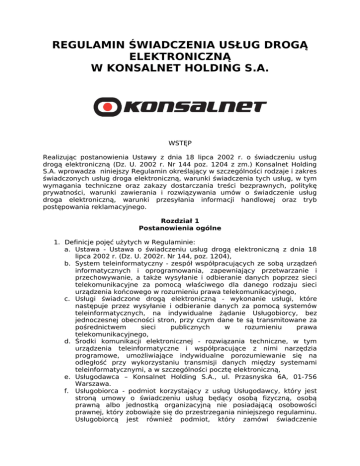 REGULAMIN ŚWIADCZENIA USŁUG DROGĄ ELEKTRONICZNĄ W KONSALNET HOLDING S.A. WSTĘP Realizując postanowienia Ustawy z dnia 18 lipca 2002 r. o świadczeniu usług drogą elektroniczną (Dz. U. 2002 r. Nr 144 poz. 1204 z zm.) Konsalnet Holding S.A. wprowadza niniejszy Regulamin określający w szczególności rodzaje i zakres świadczonych usług droga elektroniczną, warunki świadczenia tych usług, w tym wymagania techniczne oraz zakazy dostarczania treści bezprawnych, politykę prywatności, warunki zawierania i rozwiązywania umów o świadczenie usług droga elektroniczną, warunki przesyłania informacji handlowej oraz tryb postępowania reklamacyjnego. Rozdział 1 Postanowienia ogólne 1. Definicje pojęć użytych w Regulaminie: a. Ustawa - Ustawa o świadczeniu usług drogą elektroniczną z dnia 18 lipca 2002 r. (Dz. U. 2002r. Nr 144, poz. 1204), b. System teleinformatyczny - zespół współpracujących ze sobą urządzeń informatycznych i oprogramowania, zapewniający przetwarzanie i przechowywanie, a także wysyłanie i odbieranie danych poprzez sieci telekomunikacyjne za pomocą właściwego dla danego rodzaju sieci urządzenia końcowego w rozumieniu prawa telekomunikacyjnego, c. Usługi świadczone drogą elektroniczną - wykonanie usługi, które następuje przez wysyłanie i odbieranie danych za pomocą systemów teleinformatycznych, na indywidualne żądanie Usługobiorcy, bez jednoczesnej obecności stron, przy czym dane te są transmitowane za pośrednictwem sieci publicznych w rozumieniu prawa telekomunikacyjnego, d. Środki komunikacji elektronicznej - rozwiązania techniczne, w tym urządzenia teleinformatyczne i współpracujące z nimi narzędzia programowe, umożliwiające indywidualne porozumiewanie się na odległość przy wykorzystaniu transmisji danych między systemami teleinformatycznymi, a w szczególności pocztę elektroniczną, e. Usługodawca – Konsalnet Holding S.A., ul. Przasnyska 6A, 01-756 Warszawa. f. Usługobiorca - podmiot korzystający z usług Usługodawcy, który jest stroną umowy o świadczeniu usług będący osobą fizyczną, osobą prawną albo jednostką organizacyjną nie posiadającą osobowości prawnej, który zobowiąże się do przestrzegania niniejszego regulaminu. Usługobiorcą jest również podmiot, który zamówi świadczenie określonych usług drogą elektroniczną na zasadach poniżej określonych. g. Specyfikacja techniczna zbiór informacji o systemie teleinformatycznym Usługodawcy oraz wymaganiach technicznych niezbędnych do współpracy z tym systemem. 2. Wyrażenie zgody na przestrzeganie niniejszego Regulaminu przy uruchamianiu usługi, przy użyciu strony WWW lub złożenie zamówienia drogą poczty elektronicznej jest równoznaczne z pełną akceptacją warunków regulaminu bez konieczności sporządzenia odrębnej umowy. Rozdział 2 Rodzaje i zakres świadczonych usług drogą elektroniczną 1. Usługodawca świadczy usługi drogą elektroniczną, a w szczególności: a. Formularz umożliwiający zadania pytania, 2. Usługodawca może świadczyć również usługi na podstawie odrębnych umów, których przedmiotem jest świadczenie usług drogą elektroniczną. Rozdział 3 Warunki świadczenia usług drogą elektroniczną. 1. Usługodawca świadczy usługi na rzecz Usługobiorcy w zakresie i na warunkach określonych w niniejszym regulaminie lub indywidualnej ofercie, jeśli taka została złożona i przyjęta przez Usługobiorcę. 2. Usługobiorca zobowiązuje się do przestrzegania niniejszego regulaminu. 3. Usługobiorca zobowiązany jest do przestrzegania zakazu nadużywania środków komunikacji elektronicznej oraz nie dostarczania przez lub do systemów teleinformatycznych Usługodawcy następujących treści: a. Powodujących zachwianie pracy lub przeciążenie systemów teleinformatycznych Usługodawcy lub innych podmiotów biorących bezpośredni lub pośredni udział w świadczeniu usług drogą elektroniczną, b. Naruszają dobra osób trzecich, ogólnie przyjęte normy społeczne lub są niezgodne z powszechnie obowiązującymi przepisami prawa. 4. Usługodawca zastrzega sobie prawo do prowadzenia prac konserwacyjnych systemu teleinformatycznego, mogących powodować utrudnienia lub uniemożliwienie Usługobiorcom korzystania z usług. Terminy prac i przewidywany czas ich trwania będzie publikowany na stronie WWW przed rozpoczęciem prac. 5. W przypadkach szczególnych mających wpływ na bezpieczeństwo lub stabilność systemu teleinformatycznego, Usługodawca ma prawo do czasowego zaprzestania lub ograniczenia świadczenia usług, bez wcześniejszego powiadomienia i przeprowadzenia prac konserwacyjnych mających na celu przywrócenie bezpieczeństwa i stabilności systemu teleinformatycznego. 6. Usługodawca zapewnia Usługobiorcom tajemnicę komunikacji zwaną "tajemnicą telekomunikacyjną", która obejmuje informacje przekazywane w publicznej sieci Internet, dane dotyczące i wprowadzone przez Usługobiorców tylko w obrębie systemu teleinformatycznego Usługodawcy i tylko w przypadku, w którym informacje objęte "tajemnicą telekomunikacyjną" nie są jawne z zasady lub ich ujawnienie nie jest niezbędne dla prawidłowego świadczenia usługi, której dotyczą. Informacje objęte "tajemnicą telekomunikacyjną" mogą zostać ujawnione jedynie w przypadkach określonych umową lub w przepisach prawa. 7. Informacje objęte "tajemnicą telekomunikacyjną" mogą być przetwarzane przez Usługodawcę tylko wówczas, gdy przetwarzanie ich jest przedmiotem usługi świadczonej Usługobiorcom, jest niezbędne do jej prawidłowego wykonania lub nadzoru nad prawidłowym działaniem systemu teleinformatycznego Usługodawcy. 8. Dostęp do informacji, o zmianach dotyczących sposobu i zakresu świadczenia usług przez Usługodawcę oraz do informacji, których wymóg dostarczania Usługobiorcy wynikający z Art. 6 Ustawy o świadczeniu usług drogą elektroniczną, Usługodawca będzie realizow
