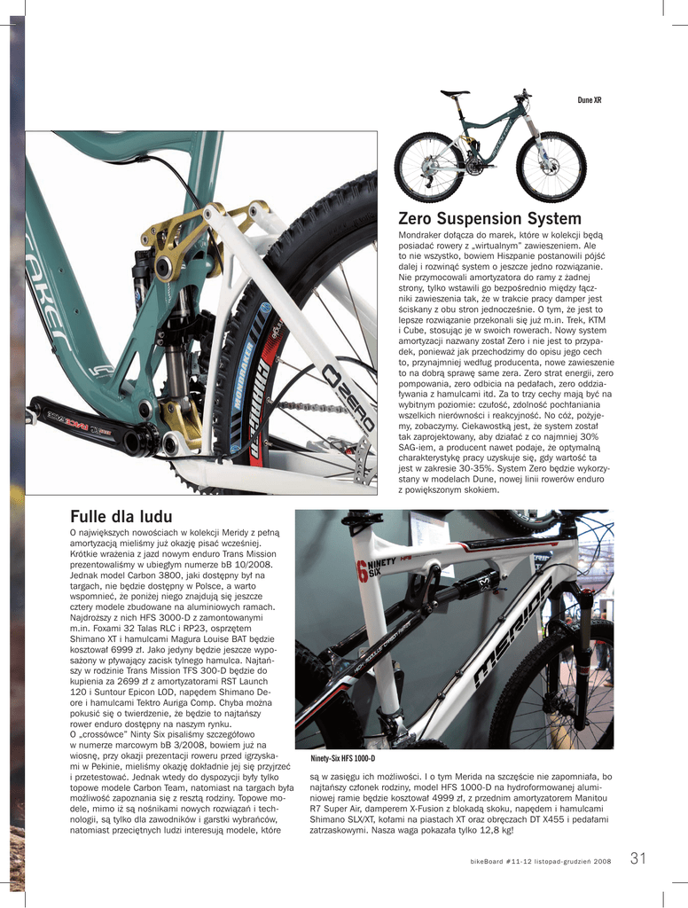 Dune XR Zero Suspension System Mondraker dołącza do marek, które w kolekcji będą posiadać rowery z „wirtualnym” zawieszeniem. Ale to nie wszystko, bowiem Hiszpanie postanowili pójść dalej i rozwinąć system o jeszcze jedno rozwiązanie. Nie przymocowali amortyzatora do ramy z żadnej strony, tylko wstawili go bezpośrednio między łączniki zawieszenia tak, że w trakcie pracy damper jest ściskany z obu stron jednocześnie. O tym, że jest to lepsze rozwiązanie przekonali się już m.in. Trek, KTM i Cube, stosując je w swoich rowerach. Nowy system amortyzacji nazwany został Zero i nie jest to przypadek, ponieważ jak przechodzimy do opisu jego cech to, przynajmniej według producenta, nowe zawieszenie to na dobrą sprawę same zera. Zero strat energii, zero pompowania, zero odbicia na pedałach, zero oddziaływania z hamulcami itd. Za to trzy cechy mają być na wybitnym poziomie: czułość, zdolność pochłaniania wszelkich nierówności i reakcyjność. No cóż, pożyjemy, zobaczymy. Ciekawostką jest, że system został tak zaprojektowany, aby działać z co najmniej 30% SAG-iem, a producent nawet podaje, że optymalną charakterystykę pracy uzyskuje się, gdy wartość ta jest w zakresie 30-35%. System Zero będzie wykorzystany w modelach Dune, nowej linii rowerów enduro z powiększonym skokiem. Fulle dla ludu O największych nowościach w kolekcji Meridy z pełną amortyzacją mieliśmy już okazję pisać wcześniej. Krótkie wrażenia z jazd nowym enduro Trans Mission prezentowaliśmy w ubiegłym numerze bB 10/2008. Jednak model Carbon 3800, jaki dostępny był na targach, nie będzie dostępny w Polsce, a warto wspomnieć, że poniżej niego znajdują się jeszcze cztery modele zbudowane na aluminiowych ramach. Najdroższy z nich HFS 3000-D z zamontowanymi m.in. Foxami 32 Talas RLC i RP23, osprzętem Shimano XT i hamulcami Magura Louise BAT będzie kosztował 6999 zł. Jako jedyny będzie jeszcze wyposażony w pływający zacisk tylnego hamulca. Najtańszy w rodzinie Trans Mission TFS 300-D będzie do kupienia za 2699 zł z amortyzatorami RST Launch 120 i Suntour Epicon LOD, napędem Shimano Deore i hamulcami Tektro Auriga Comp. Chyba można pokusić się o twierdzenie, że będzie to najtańszy rower enduro dostępny na naszym rynku. O „crossówce” Ninty Six pisaliśmy szczegółowo w numerze marcowym bB 3/2008, bowiem już na wiosnę, przy okazji prezentacji roweru przed igrzyskami w Pekinie, mieliśmy okazję dokładnie jej się przyjrzeć i przetestować. Jednak wtedy do dyspozycji były tylko topowe modele Carbon Team, natomiast na targach była możliwość zapoznania się z resztą rodziny. Topowe modele, mimo iż są nośnikami nowych rozwiązań i technologii, są tylko dla zawodników i garstki wybrańców, natomiast przeciętnych ludzi interesują modele, które Ninety-Six HFS 1000-D są w zasięgu ich możliwości. I o tym Merida na szczęście nie zapomniała, bo najtańszy członek rodziny, model HFS 1000-D na hydroformowanej aluminiowej ramie będzie kosztował 4999 zł, z przednim amortyzatorem Manitou R7 Super Air, damperem X-Fusion z blokadą skoku, napędem i hamulcami Shimano SLX/XT, kołami na piastach XT oraz obręczach DT X455 i pedałami zatrzaskowymi. Nasza waga pokazała tylko 12,8 kg! bi k e Boa rd # 1 1 - 1 2 l i s t o p a d - gr u d z ie ń 2 0 0 8 31
