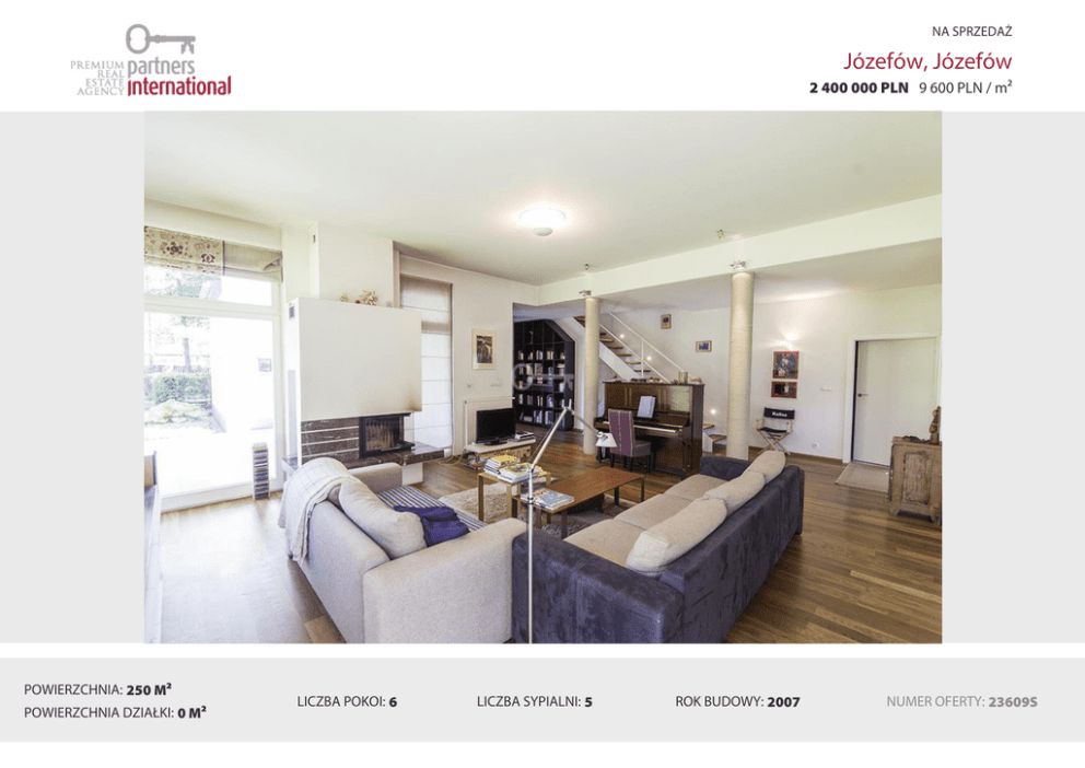 NA SPRZEDAŻ Józefów, Józefów 2 400 000 PLN 9 600 PLN / m² POWIERZCHNIA: 250 M² POWIERZCHNIA DZIAŁKI: 0 M² LICZBA POKOI: 6 LICZBA SYPIALNI: 5 ROK BUDOWY: 2007 NUMER OFERTY: 23609S Opis NOWOCZESNY I FUNKCJONALNY DOM Z OGRODEM W ZIELONEJ I SPOKOJNEJ CZĘŚCI JÓZEFOWA! Dom zaprojektowany z myślą o wygodzie mieszkańców, większość funkcji mieszkalnych zaplanowanych zostało na parterze. Nowoczesna konstrukcja, wysokie, panoramiczne okna, przestronne i komfortowe wnętrza, dające poczucie przestrzeni oraz duże drewniane tarasy z drewna egzotycznego wychodzące na zielony ogród porośnięty sosnami i brzozami oraz dobrze przemyślanymi nasadzeniami są wizytówką domu. Bezpośredni dostęp do pięknie zagospodarowanego ogrodu i wspaniała przyroda wokół dają mieszkańcom możliwość relaksu i wypoczynku. LOKALIZACJA: Cicha i spokojna uliczka wśród niskiej zabudowy jednorodzinnej. W bardzo bliskiej odległości lasy, plaża nad rzeką Świder, jeden z największych na Mazowszu parków linowych. Doskonałe możliwości do spędzania wolnego czasu i rekreacji. W pobliżu, w odległości spacerowej wysokiej klasy hotel z dostępnymi kortami tenisowymi, polem golfowym i basenem, placem zabaw dla dzieci i restauracją. W odległości pieszej również dobre i cenione szkoły: gimnazjum miejskie i szkoła Sternik, hala sportowa, basen miejski, plac zabaw. Blisko liczne sklepy, markety spożywcze (Tesco, Piotr i Paweł), niewielkie centrum handlowe z apteką, pralnią i inną ofertą handlowo-usługową. Do centrum Józefowa 15 min. pieszo. Dogodny dojazd do Warszawy kolejką SKM oraz autobusem. Dojazd autem zarówno Wałem Miedzeszyńskim jak i ul. Patriotów. Planowana budowa Mostu Południowego. UKŁAD POMIESZCZEŃ, STANDARD: Parter: – hol wejściowy z dużą szafą garderobianą – duży, przestronny salon z kominkiem oraz wyjściem na ogród oraz dwa tarasy, wysokie, panoramiczne okna z widokiem na zieleń (ok. 3,30 m wysokości) – jasna, otwarta na salon kuchnia z jadalnią w pełni wyposażona (duża lodówka, kuchenka gazowa, duża zmywarka, piekarnik) – hol prowadzący do części sypialnej z półkami na książki – 2 pokoje dziecięce – łazienka dziecięca z wanną i kabiną prysznicową – sypialnia małżeńska z wyjściem na osobny taras wyłożony deską – osobna, duża garderoba z oknem – połączona z sypialnią przesuwnymi drzwiami łazienka z oknem, z wanną i kabiną prysznicową, wc i bidetem – duże pomieszczenie gospodarcze z pralnią, prysznicem i kotłownią – wejście do garażu na 2 auta Na podłodze deska dębowa olejowana, w kuchni i łazienkach ogrzewanie podłogowe. W dużych pomieszczeniach dodatkowo ogrzewanie kanałowe przy oknach. Piętro: Na piętro prowadzą schody z drewnianymi stopniami. Znajdują się tutaj: – przedpokój z szafami – 2 sypialnie – łazienka z wanną, wc i bidetem Na podłodze drewno egzotyczne. INFORMACJE DODATKOWE: W ogrodzie automatyczny system podlewania oraz system oświetlenia, pozwalający na korzystanie z ogrodu po zmroku. Dodatkowo zaprojektowany został tutaj drewniany domek na sprzęt. Automatyczna brama wjazdowa oraz wejście przez furtkę na teren posesji. Dom z alarmem dwustrefowym, w ogrodzie zainstalowano czujki alarmowe, szyby kuloodporne i rolety antywłamaniowe. Polecam i zapraszam na prezentację! KONTAKT: Beata, Tel: 502624500 POŚREDNIK ODPOWIEDZIALNY: Joanna Czapska (licencja zawodowa nr 4585), Przedstawiona wyżej propozycja nie jest ofertą handlową w rozumieniu przepisów prawa lecz ma charakter informacyjny. Partners International dokłada starań, aby treści przedstawione w naszych ofertach były aktualne i rzetelne. Dane dotyczące ofert uzyskano na podstawie oświadczeń sprzedających. Lokalizacja Katarzyna Joanna Czapska Katarzyna Joanna Czapska Ul. Koszykowa 10/19 00-564 Warszawa tel. (+48 22) 646 52 02 fax: (+48 22) 646 26 99 partnersinternational.pl Pośrednik odpowiedzialny: BEATA DZIEDZIC telefon: 502624500 email: [email protected]